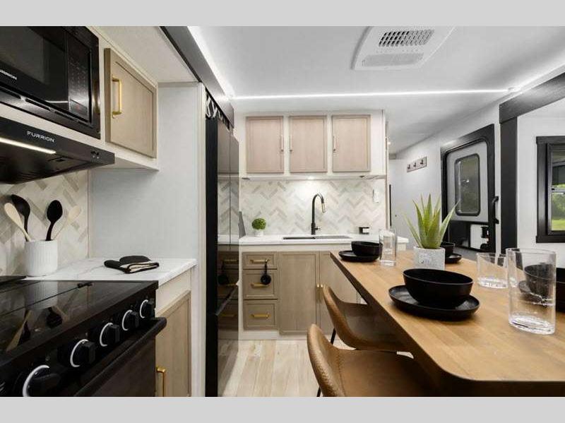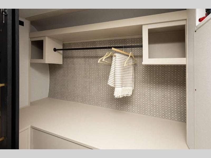 Sleeps 2 Slides 2 Length 31 ft 8 in Ext Width 8 ft Ext Height 11 ft 6 in Hitch Weight 1020 lbs Dry Weight 7563 lbs Cargo Capacity 2257 lbs Fresh Water Capacity 45 gals Grey Water Capacity 60 gals Black Water Capacity 30 gals Available Beds Custom King Refrigerator Type 12V Refrigerator Size 10 cu ft Cooktop Burners 3 Number of Awnings 1 Water Heater Type On Demand Tankless AC BTU 18000 btu TV Info 40" LED Smart TV Awning Info 22' with LED Lights Axle Count 2 Washer/Dryer Available Yes Shower Type Walk-In Shower Electrical Service 50 amp Similar Floorplans