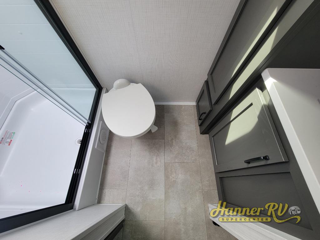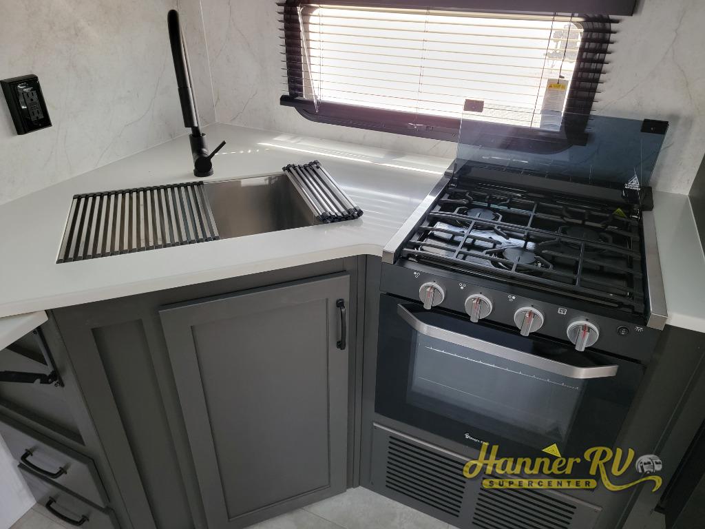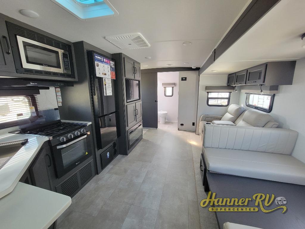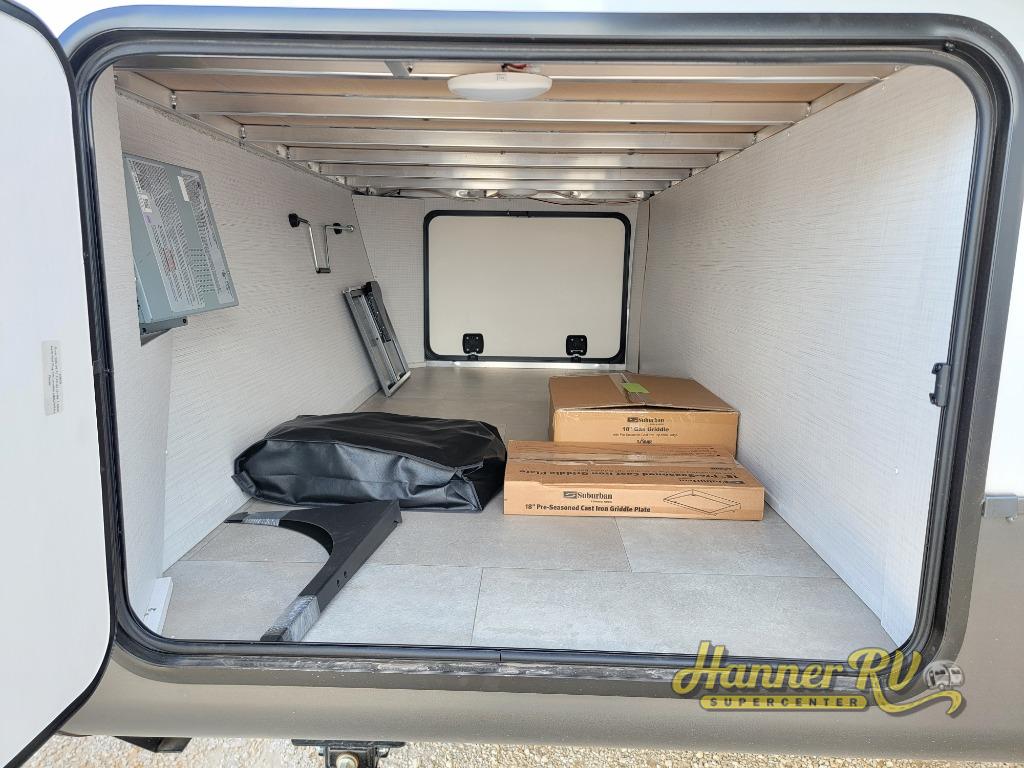 This trailer is the perfect couple's retreat with its private bedroom up front which includes a queen bed, a slide out wardrobe, and a TV option. The spacious rear full bathroom provides a shower and linen storage, and a space savings sliding door. The cook will have full amenities with ample counter space, a walk-in pantry for food storage, and a three burner range to cook meals on. If the weather is nice outside, you can make dinner on the exterior griddle, and there is a 21' awning to relax under. Or you can stay inside to enjoy the fireplace and Smart TV! You will also appreciate the pass thru storage with an optional steel sliding tray to easily access gear!