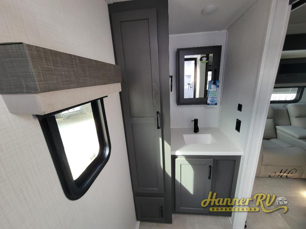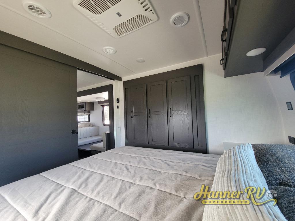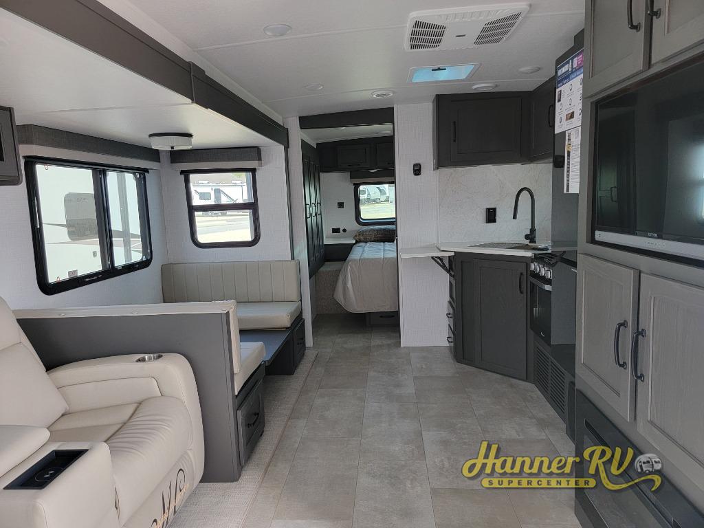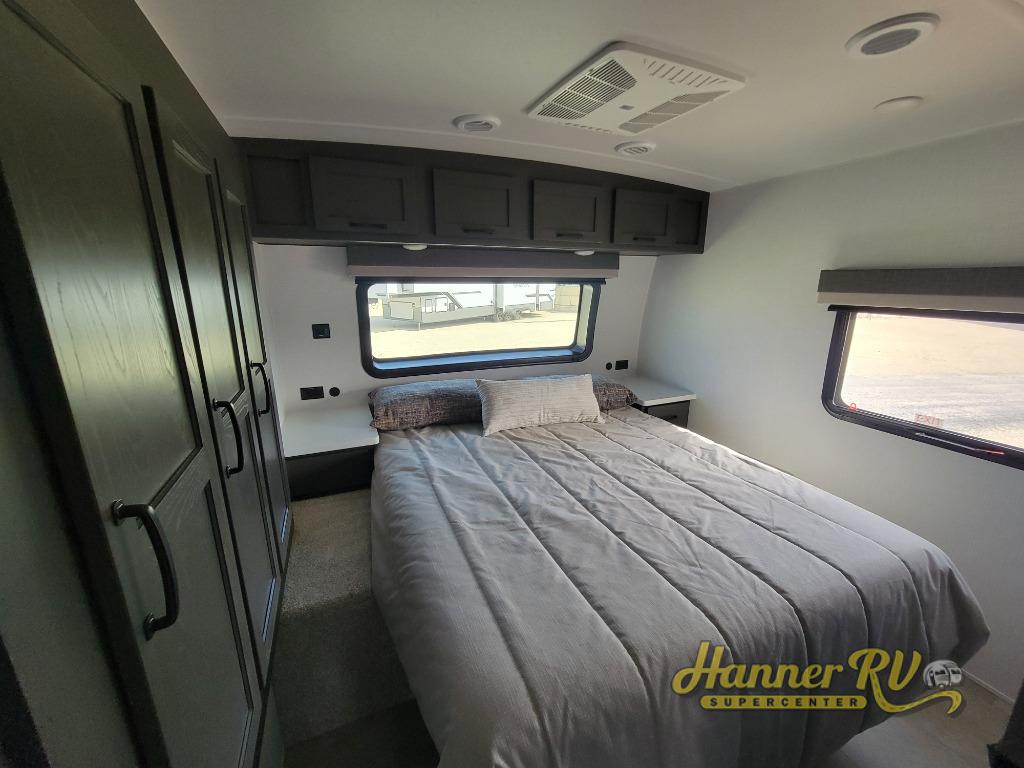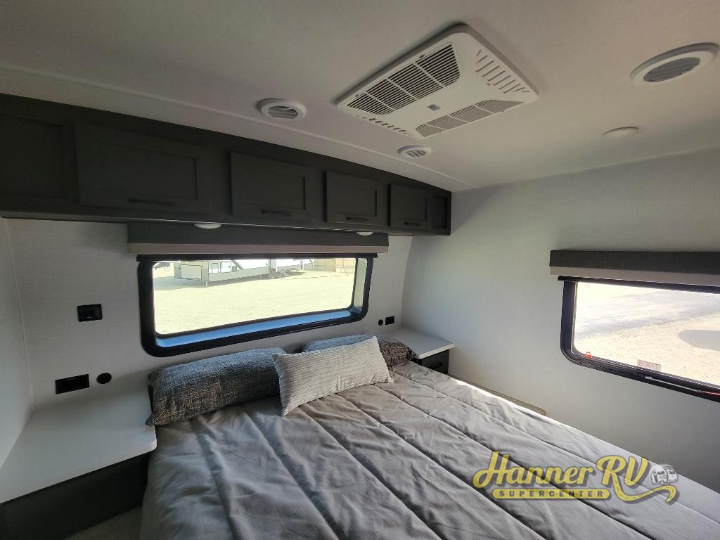 This trailer is the perfect couple's retreat with its private bedroom up front which includes a queen bed, a slide out wardrobe, and a TV option. The spacious rear full bathroom provides a shower and linen storage, and a space savings sliding door. The cook will have full amenities with ample counter space, a walk-in pantry for food storage, and a three burner range to cook meals on. If the weather is nice outside, you can make dinner on the exterior griddle, and there is a 21' awning to relax under. Or you can stay inside to enjoy the fireplace and Smart TV! You will also appreciate the pass thru storage with an optional steel sliding tray to easily access gear!