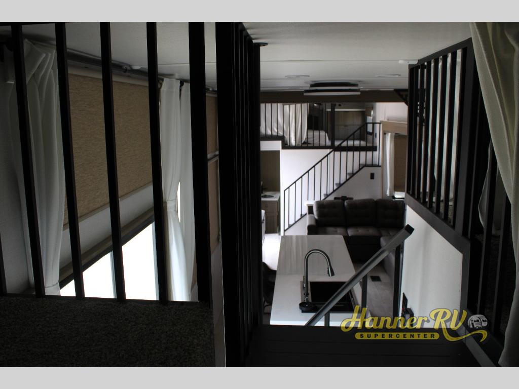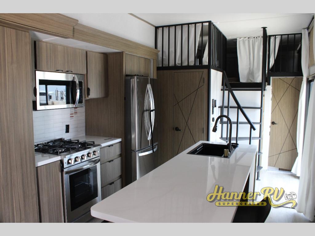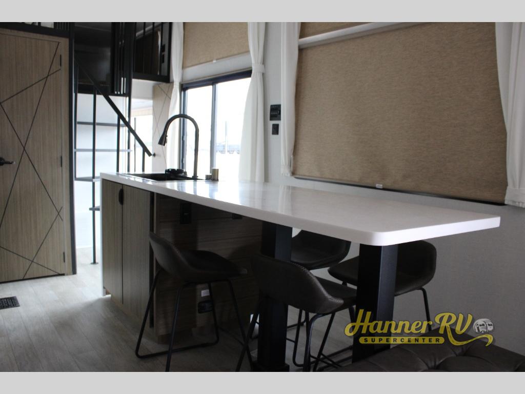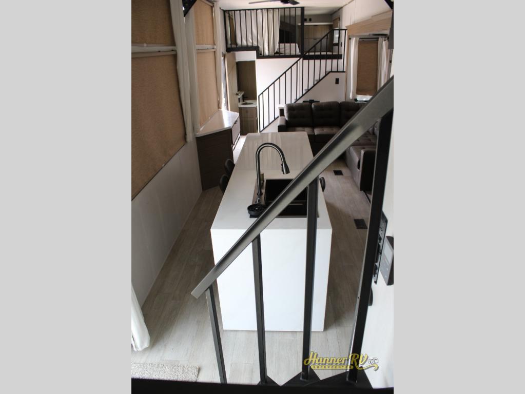 You will feel like you are home when you step inside! Not only will you be impressed with the super large slide in the main combined kitchen and living area, but check out the island with four counter height seats! The main entry closest to the front features a private bedroom with a custom king bed with Versa-Tilt within a slide, plus a fireplace and a dresser for your belongings. Just outside this door is a spiral staircase to the front loft with two 42" x 74" bunk mats above. The kitchen is fully equipped for you to provide the best home cooked meals with a pull-out pantry, range and microwave, plus side-by-side refrigerator. There is also a half bath off of the kitchen for added convenience! An L-shaped sectional sofa with an ottoman provides a cozy space to relax, and there is an entertainment center with a fireplace for a relaxing evenings indoors. A full rear bath features a spacious walk-in shower, a linen closet plus washer and dryer prep for the option to make laundry day easier. And the second loft with stairs is above the bath for even more sleeping space!