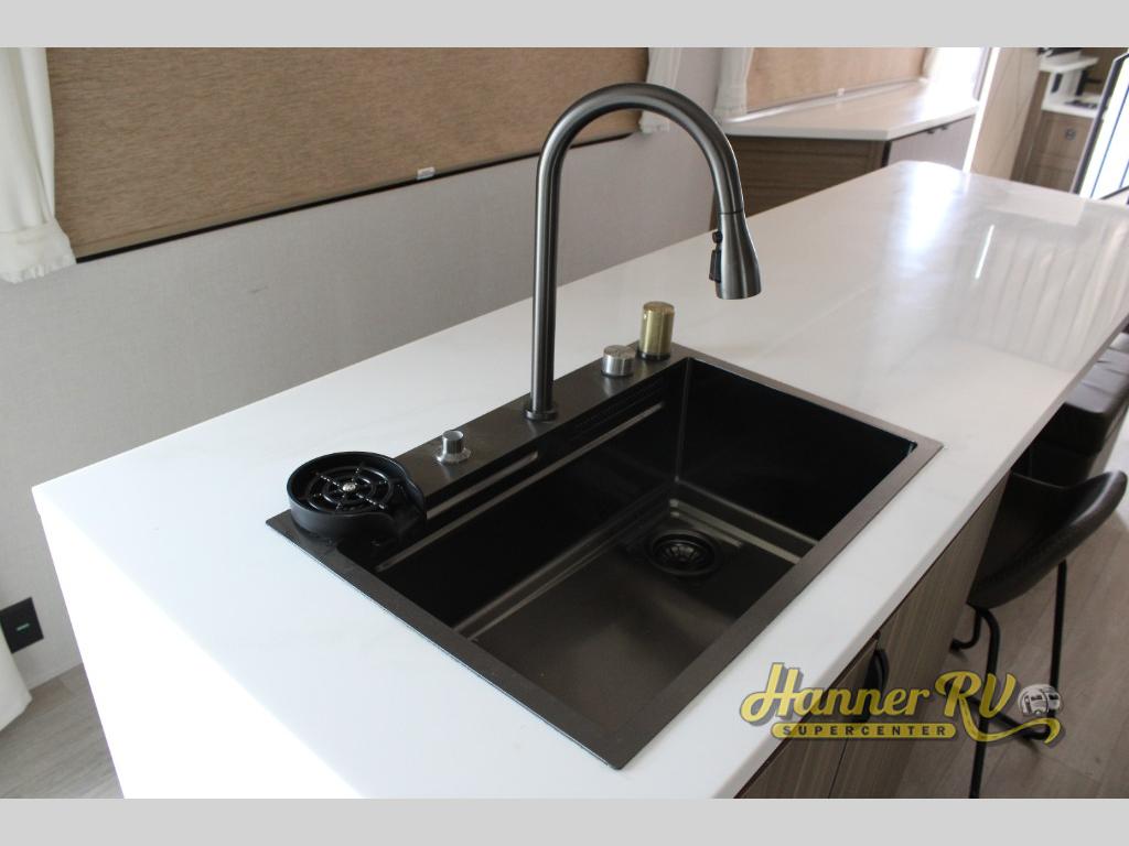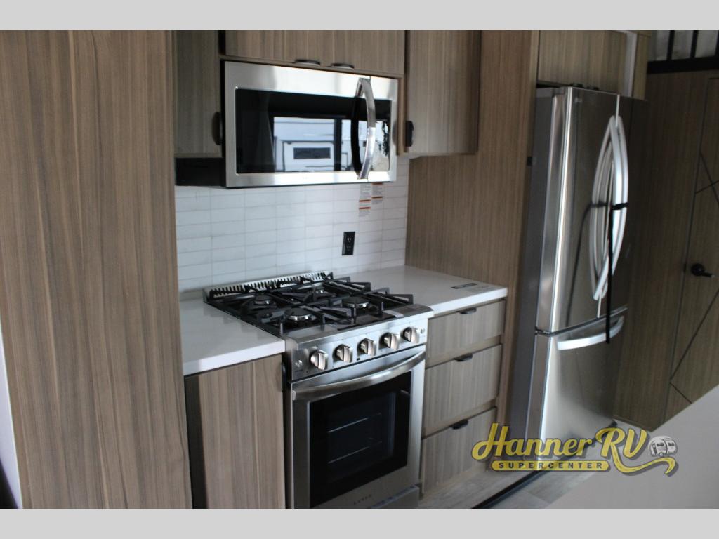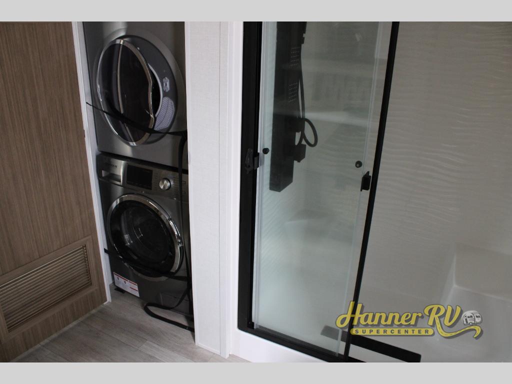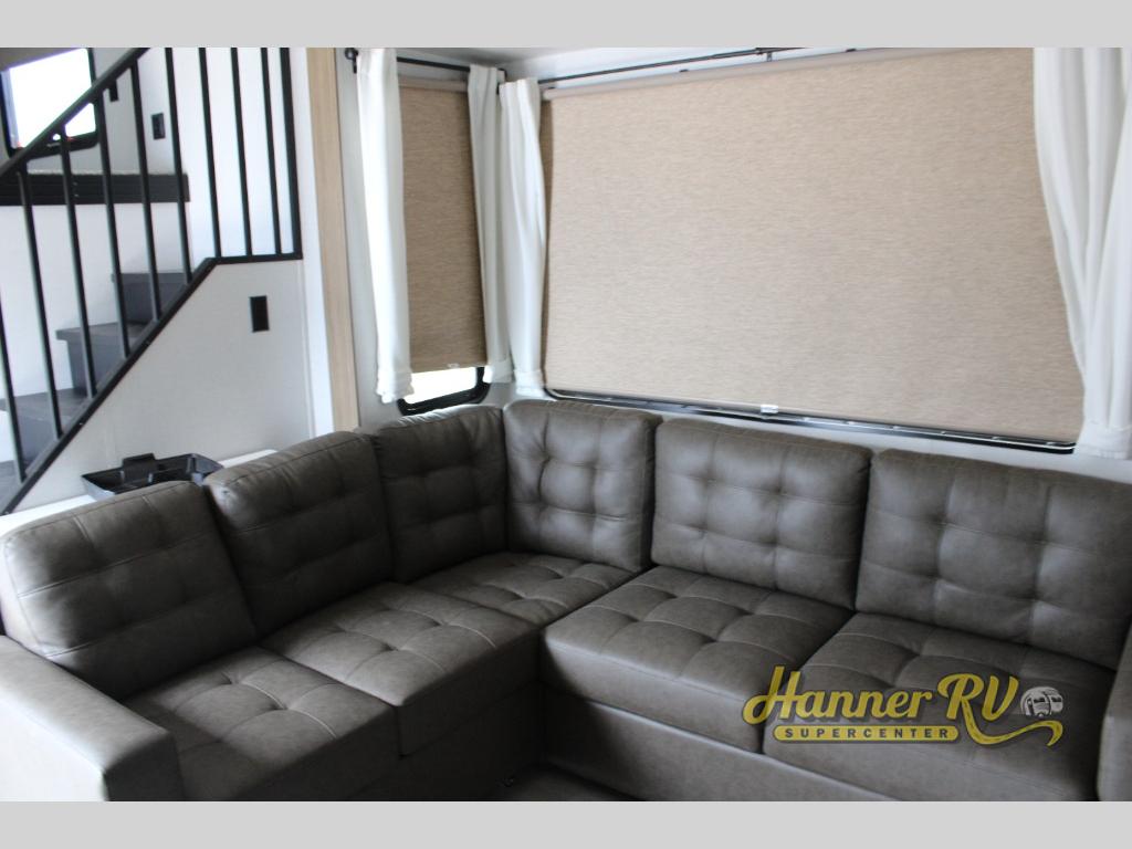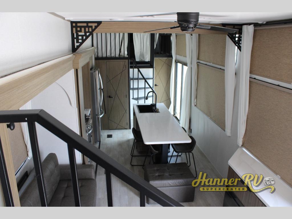 You will feel like you are home when you step inside! Not only will you be impressed with the super large slide in the main combined kitchen and living area, but check out the island with four counter height seats! The main entry closest to the front features a private bedroom with a custom king bed with Versa-Tilt within a slide, plus a fireplace and a dresser for your belongings. Just outside this door is a spiral staircase to the front loft with two 42" x 74" bunk mats above. The kitchen is fully equipped for you to provide the best home cooked meals with a pull-out pantry, range and microwave, plus side-by-side refrigerator. There is also a half bath off of the kitchen for added convenience! An L-shaped sectional sofa with an ottoman provides a cozy space to relax, and there is an entertainment center with a fireplace for a relaxing evenings indoors. A full rear bath features a spacious walk-in shower, a linen closet plus washer and dryer prep for the option to make laundry day easier. And the second loft with stairs is above the bath for even more sleeping space!