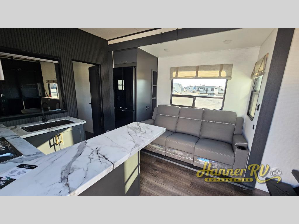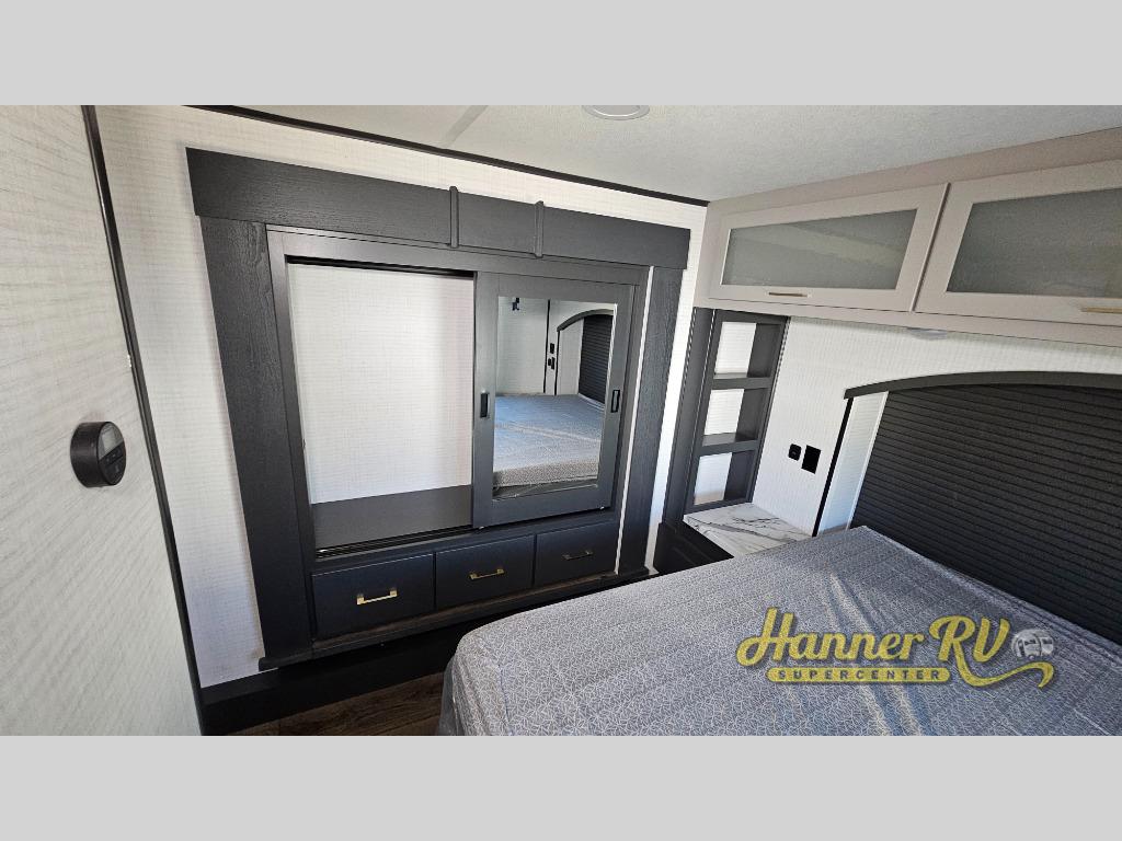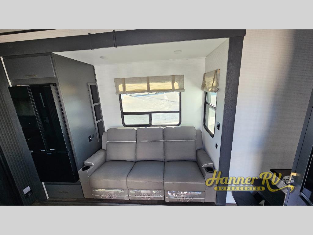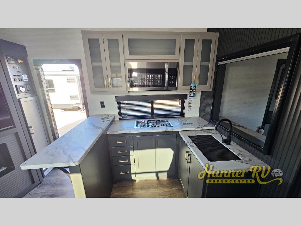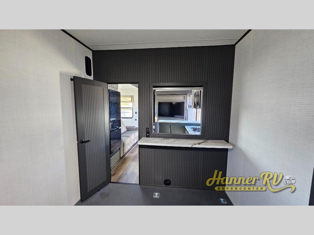 You'll love every minute spent in this double slide out, double entry fifth wheel! Your guests will have the 13' 6" separate garage all to themselves once the toys are unloaded, and here you'll find dual sofa sleepers with a Euro queen bed above. There is also a removable dinette table where you can enjoy a cold drink at when you have the 1,500 lb. capacity patio deck set up! Head to the combined kitchen and living area to relax on the sofa slide out while the cook prepares dinner. There is also a hidden pantry here you are sure to appreciate! The dual entry bath will create a front master bedroom, complete with a queen bed, dual nightstands and wardrobes, plus a wardrobe slide out for added storage and space!