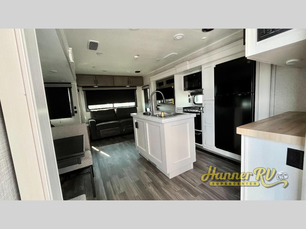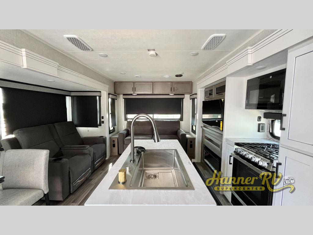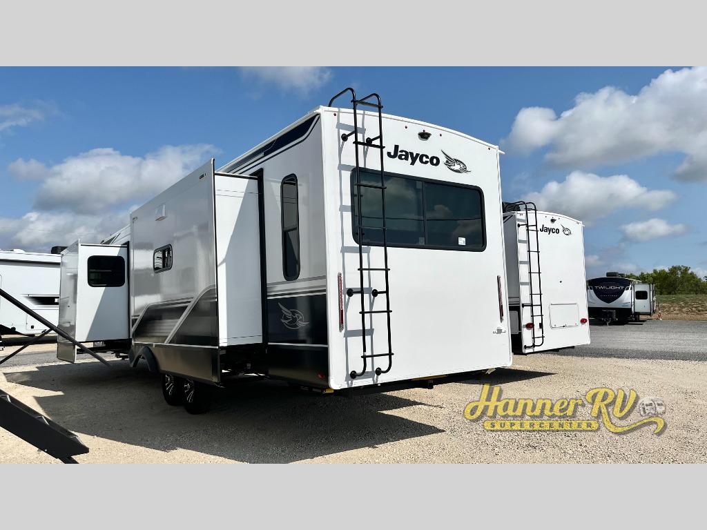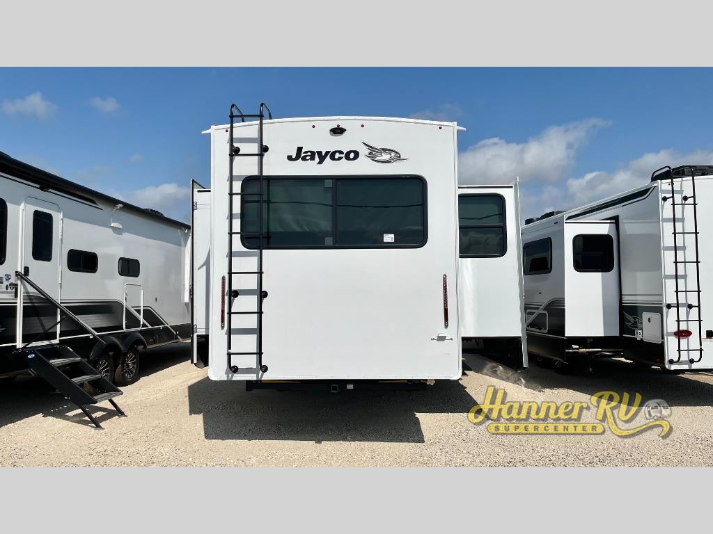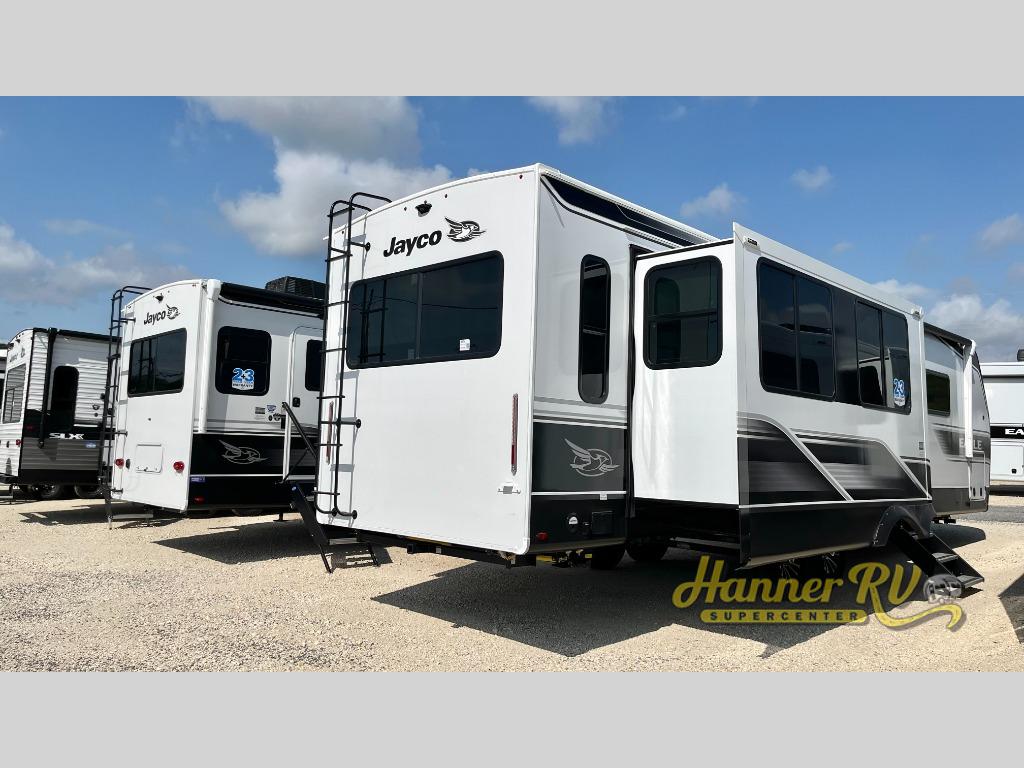 With any Eagle HT fifth wheel or travel trailer by Jayco you will enjoy a smooth drive thanks to the 4 Star Handling Package, Goodyear Endurance tires, and MORryde CRE-3000 rubberized suspension. The Customer Value Package includes amenities that are sure to make camping easier than ever, like the 60K on-demand water heater, Keyed-Alike lock system, 15,000 BTU "Whisper Quiet" A/C, and more. Handcrafted and glazed door/drawer fronts will make your space feel more like home, along with residential vinyl flooring throughout, GE appliances, and blackout roller shades with reflective side throughout to keep the sun out when you want to sleep in. Each model also includes a NuVo H2O water treatment system with filters included, interior and exterior "Blue Sync" audio connect with MB Quart Sound for your TV and phone, and 100% no floor vents for added comfort and convenience!