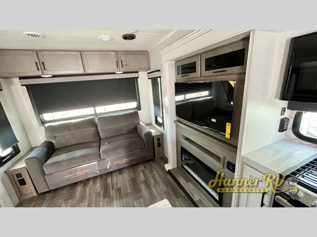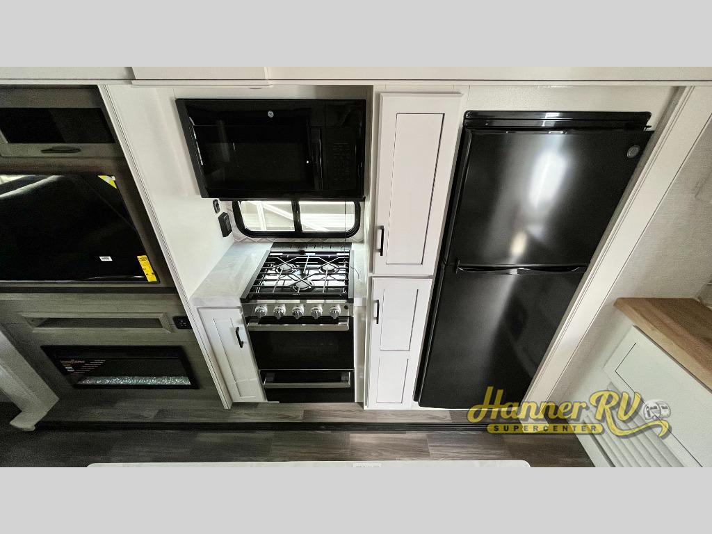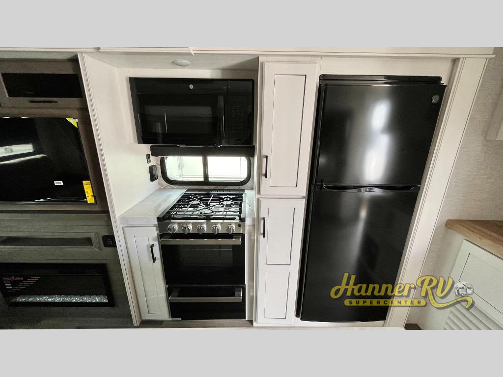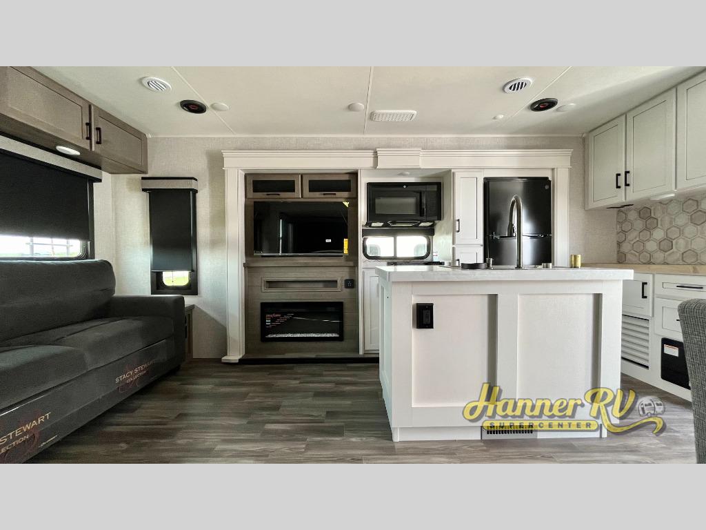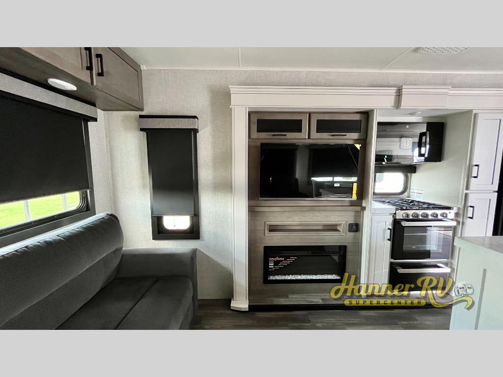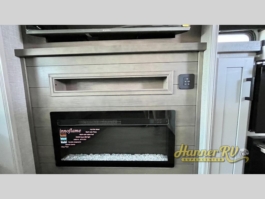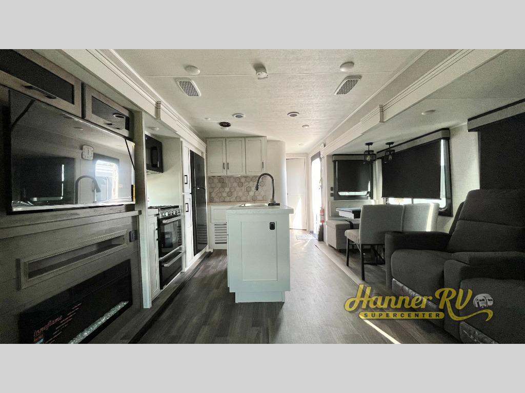 You will feel right at home camping in this travel trailer! It features a front private bedroom with an Olympic queen bed slide for more interior space, a dresser, a front wardrobe to hang your clothes, and a wardrobe that is prepped to add an optional washer and dryer. Start each morning getting squeaky clean in the full bathroom with the shower and then head to the kitchen to fry up some eggs on the stainless steel range. The kitchen island with a multi-functional sink will help make meal prepping easier too, plus there is a hutch to store your dishes. Enjoy a relaxing evening by the fireplace and watch your favorite movie with the entertainment center while sitting on either the rear tri-fold sofa or the theater seating!