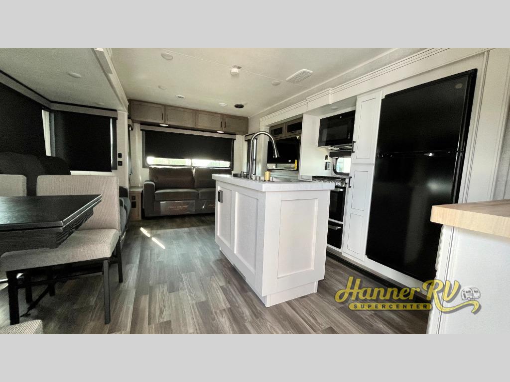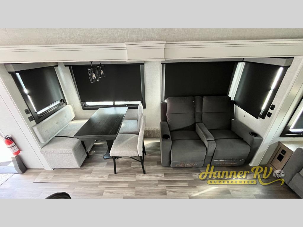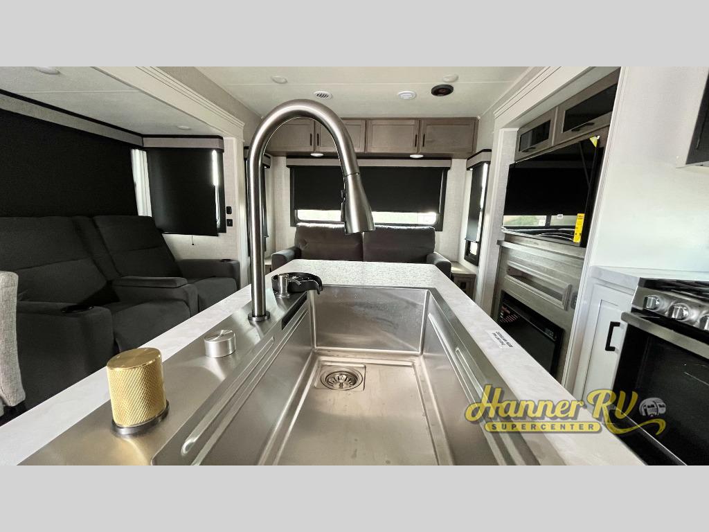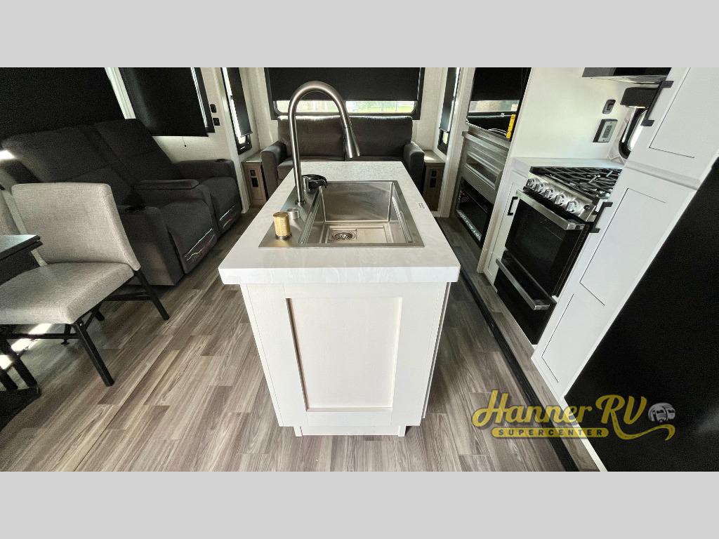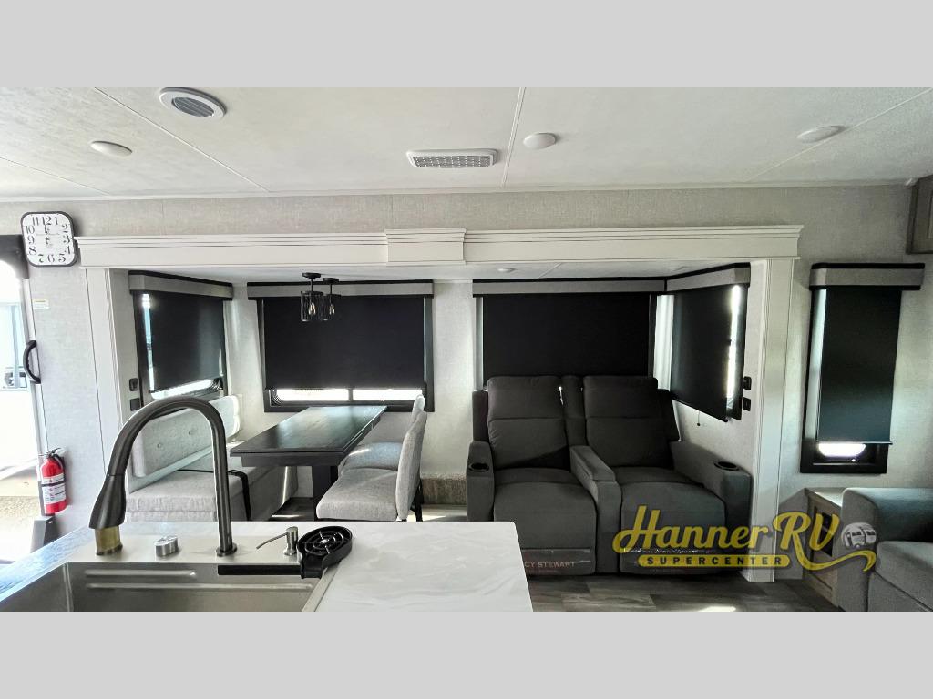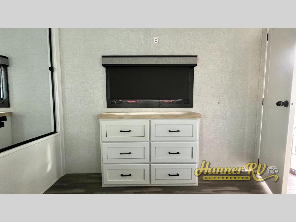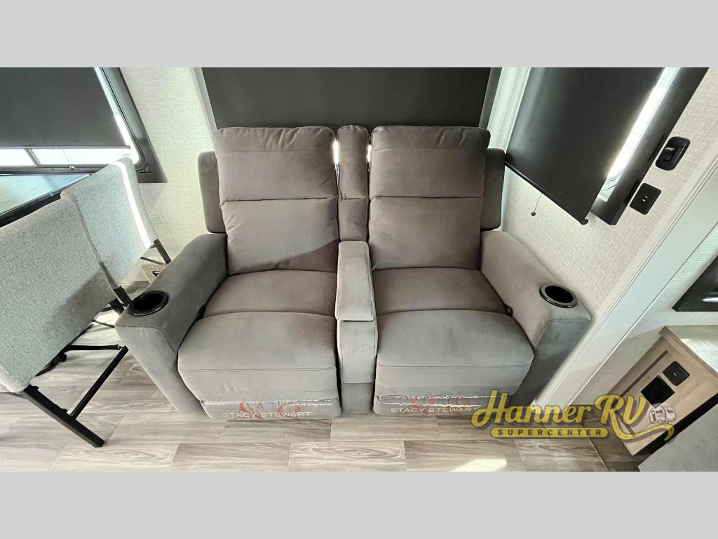 You will feel right at home camping in this travel trailer! It features a front private bedroom with an Olympic queen bed slide for more interior space, a dresser, a front wardrobe to hang your clothes, and a wardrobe that is prepped to add an optional washer and dryer. Start each morning getting squeaky clean in the full bathroom with the shower and then head to the kitchen to fry up some eggs on the stainless steel range. The kitchen island with a multi-functional sink will help make meal prepping easier too, plus there is a hutch to store your dishes. Enjoy a relaxing evening by the fireplace and watch your favorite movie with the entertainment center while sitting on either the rear tri-fold sofa or the theater seating!