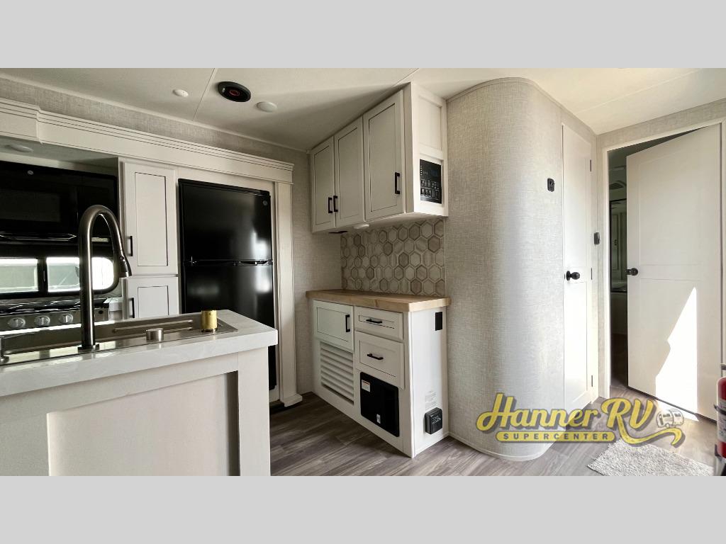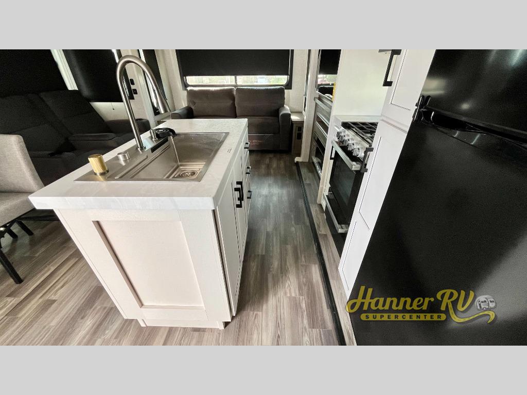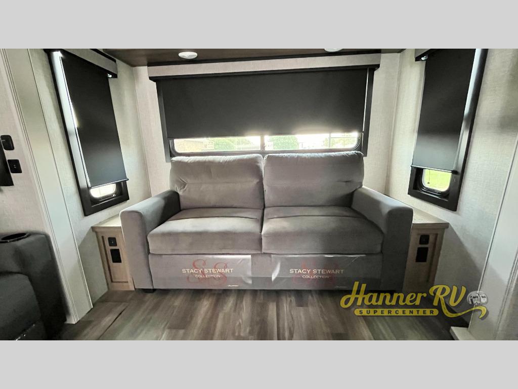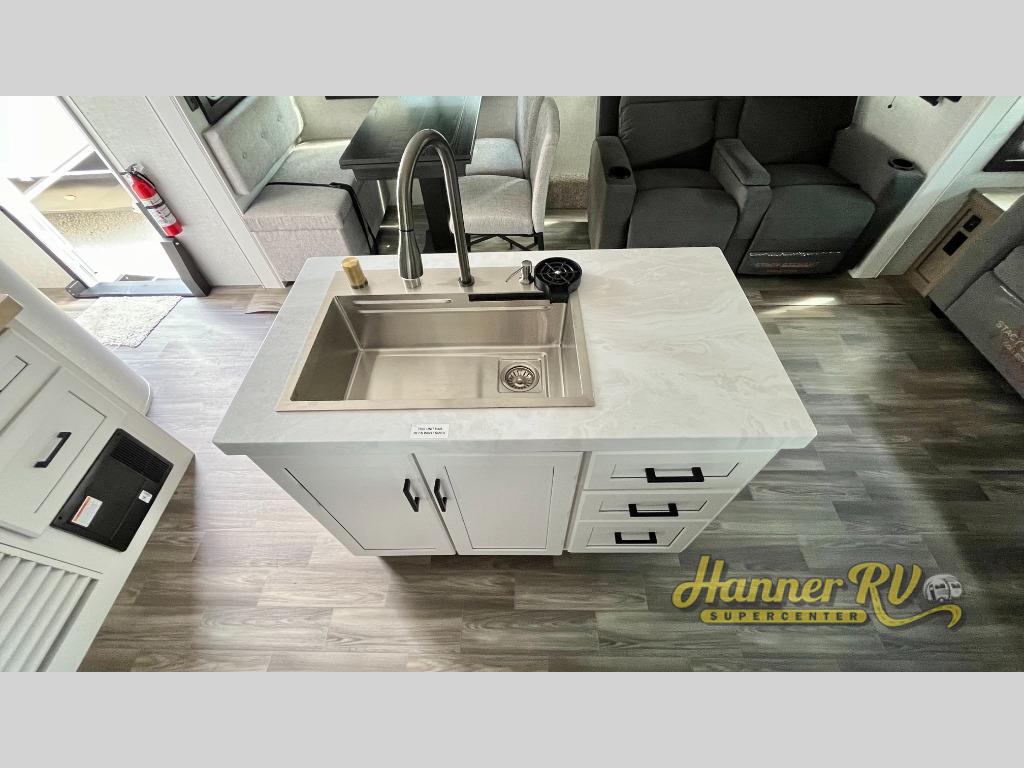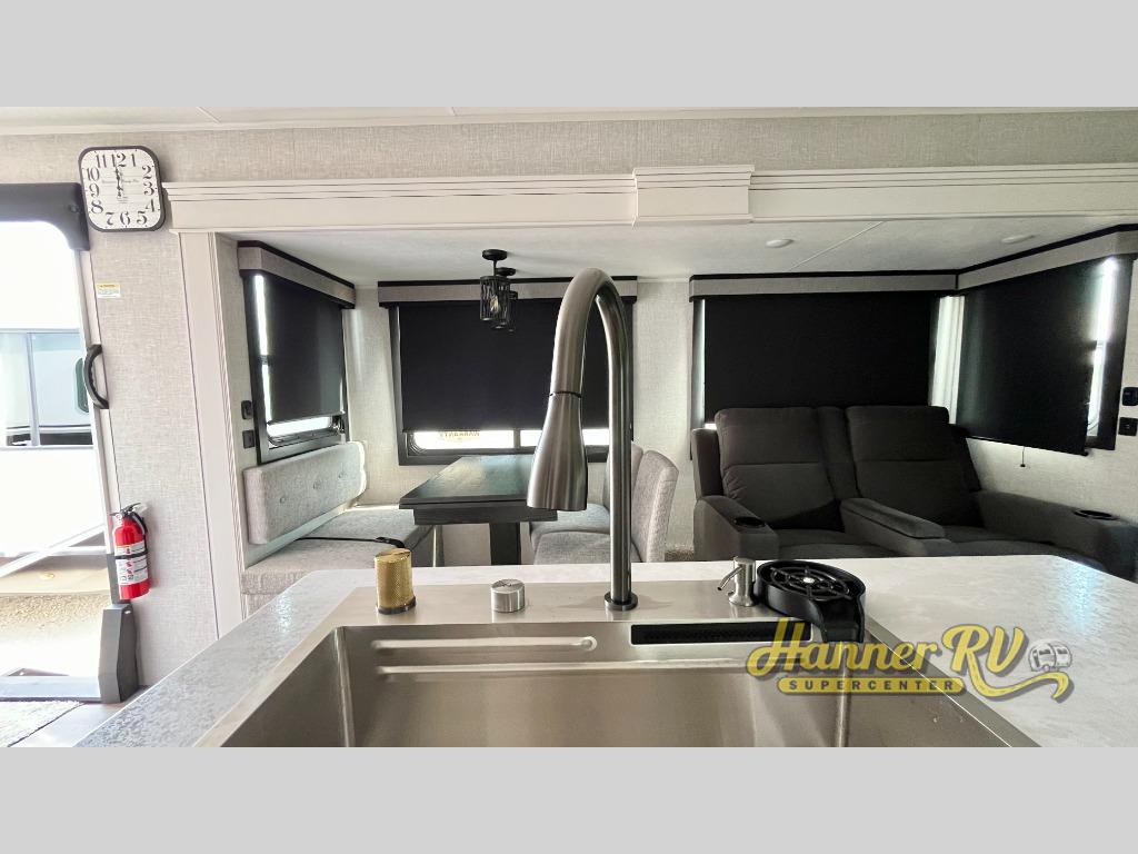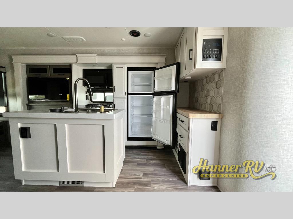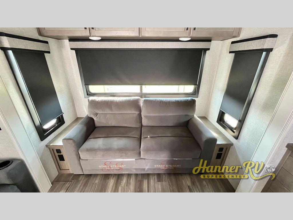 You will feel right at home camping in this travel trailer! It features a front private bedroom with an Olympic queen bed slide for more interior space, a dresser, a front wardrobe to hang your clothes, and a wardrobe that is prepped to add an optional washer and dryer. Start each morning getting squeaky clean in the full bathroom with the shower and then head to the kitchen to fry up some eggs on the stainless steel range. The kitchen island with a multi-functional sink will help make meal prepping easier too, plus there is a hutch to store your dishes. Enjoy a relaxing evening by the fireplace and watch your favorite movie with the entertainment center while sitting on either the rear tri-fold sofa or the theater seating!