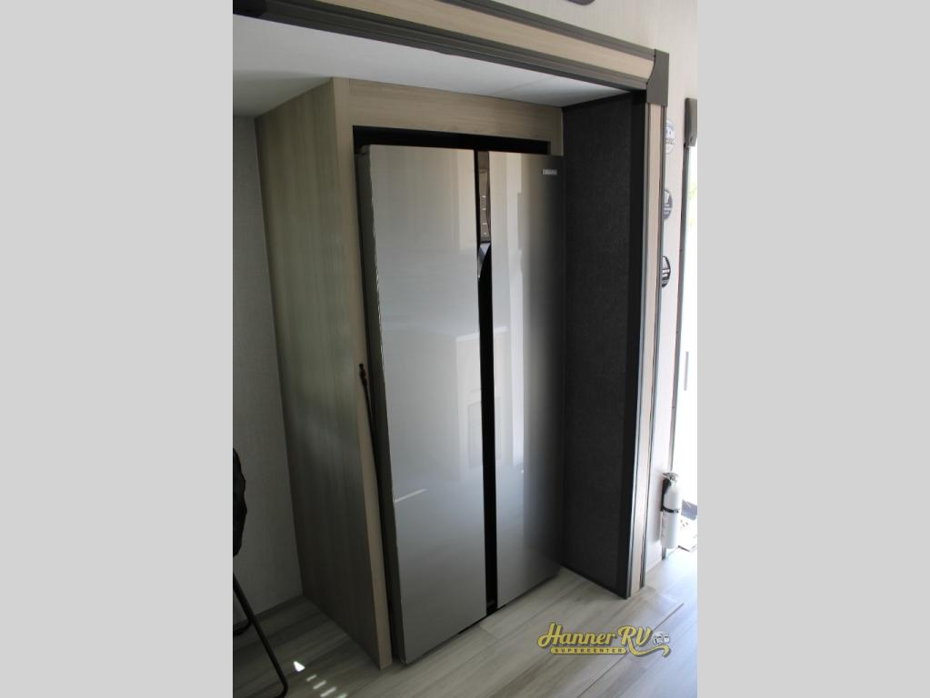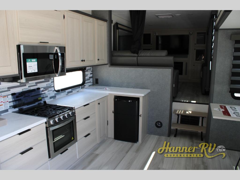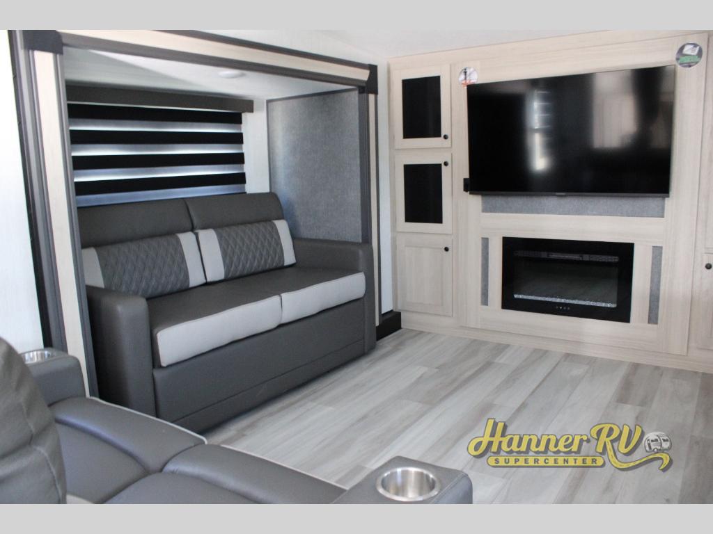 This fifth wheel is packed with features to make each trip enjoyable! The middle kitchen might be your favorite room with wrap-around counter space, a pantry, and a 16 cu. ft. 12V refrigerator for food storage. You can dine at the hi-top table and chairs here, or sit in the front living area on the dual sofas and theater seating! This area can become your guests bedroom at night since there are dual opposing slides and wardrobe storage for their things. You will also find a full-length wardrobe in the rear private bedroom, along with a king bed slide out, plus washer and dryer prep! And of course there is a full bath so everyone can stay clean each day!