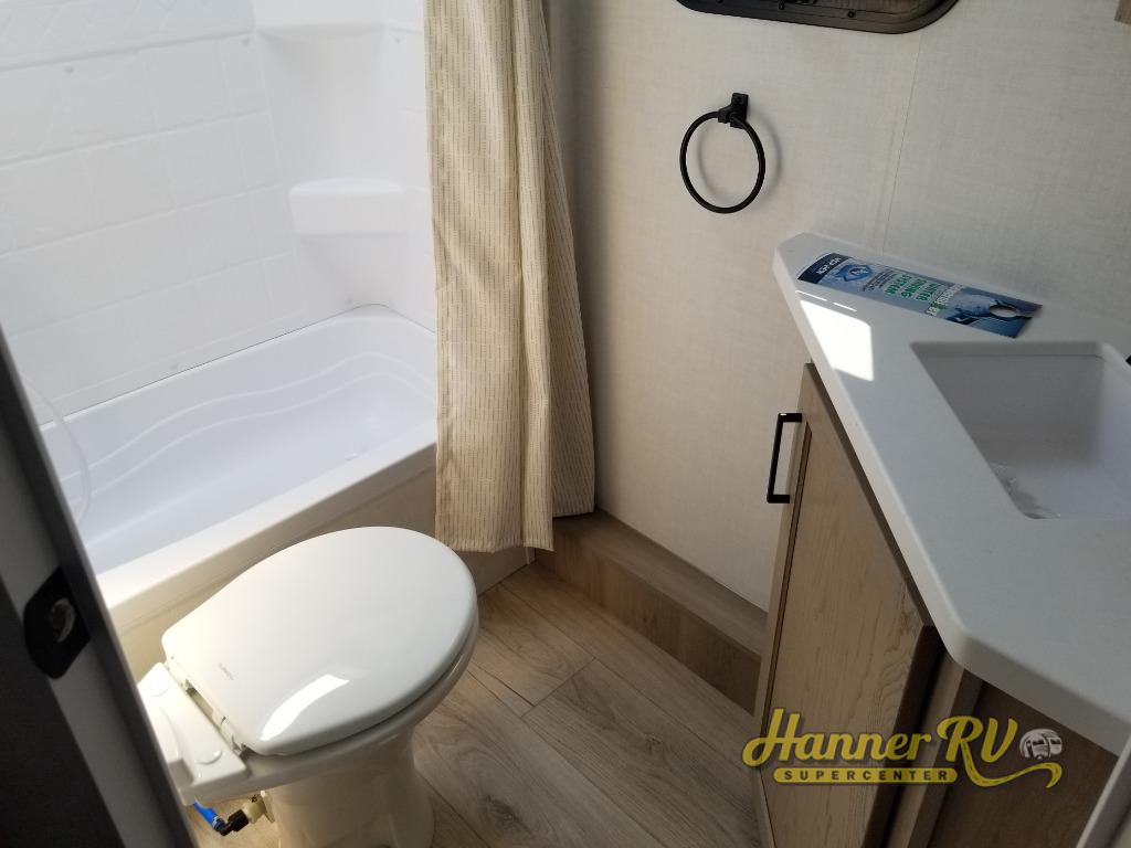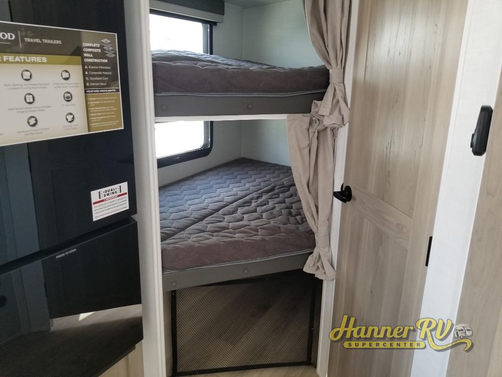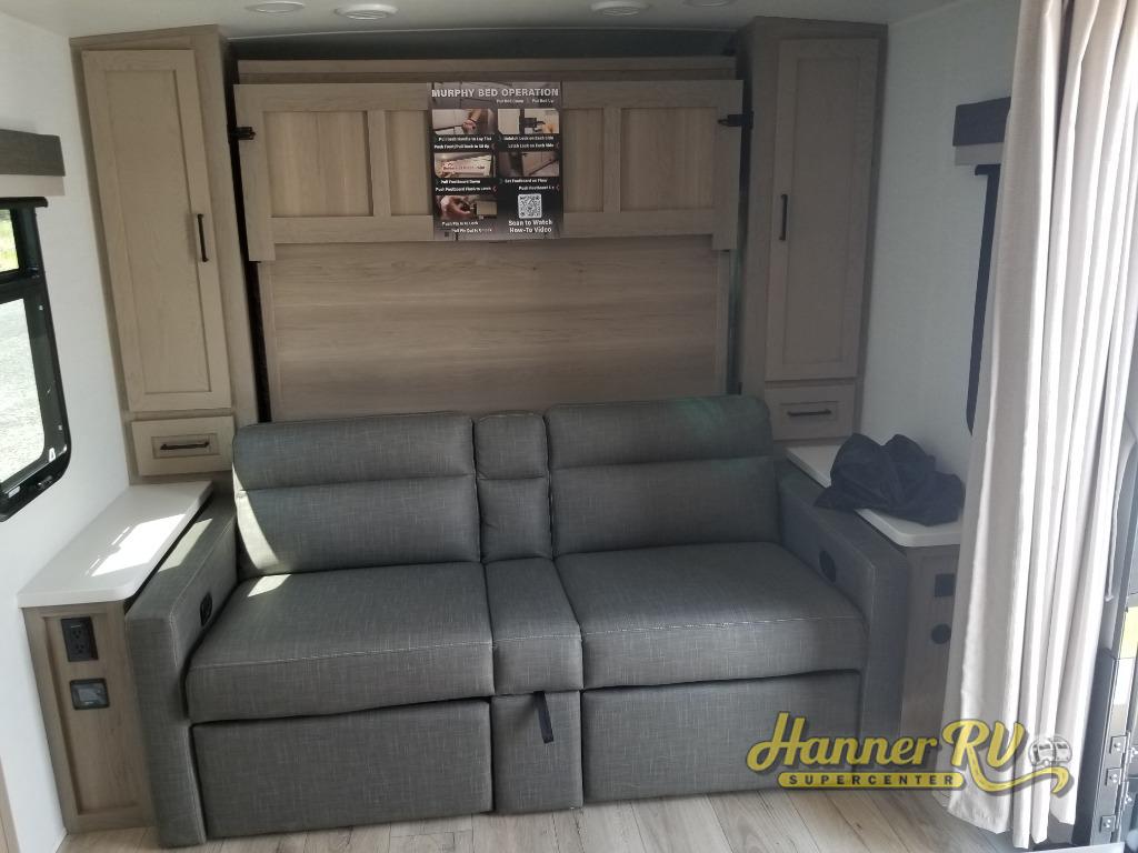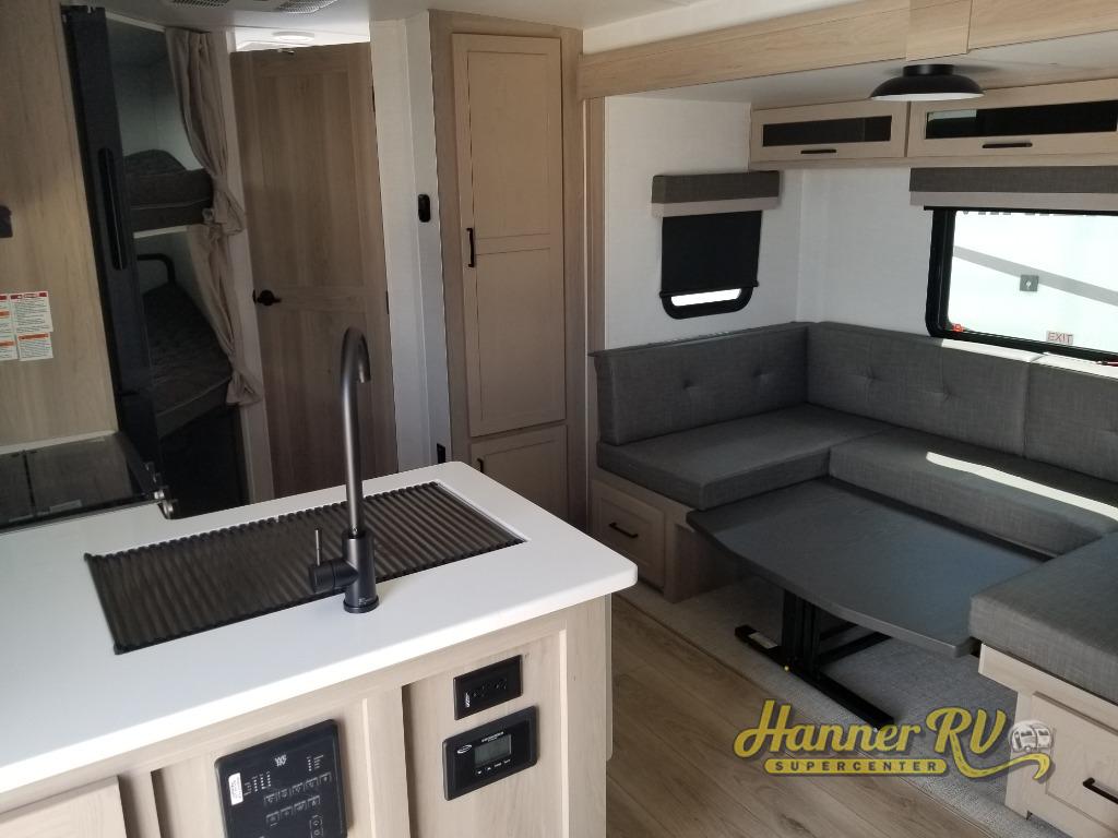 Finally, a lightweight travel trailer with double-size bunks for the kids or your guests! You'll find the versatile Murphy bed up front will be super convenient when you need more space to move around, and the 72" sofa will provide comfy seating space when the bed is put up. This model also includes a U-shaped dinette slide perfect to dine around, play games, and sleep additional guests. A 32" TV in the main living area will allow you to watch your favorite shows in the evenings, or you may just find yourselves outdoors under the 18' power awning with LED lights. And check out the pass-through storage, plus additional exterior storage for your hiking gear!