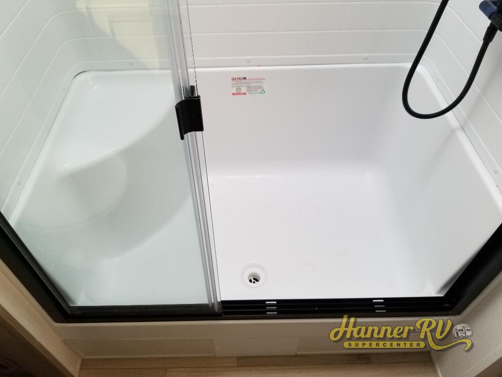 This front kitchen, couple's trailer is ready for adventure when you are! Once you arrive at your destination, prepare a quick lunch with the Griddle Prep, and enjoy the shade provided by the 19' power awning. You can eat outside, or inside at the counter with stools. The 67" theatre seat will make this travel trailer feel more like home, and the double slides provide more space to stretch out. Within the master bedroom you'll find a king bed, a large wardrobe and a dresser, plus an optional TV. And check out the full rear bath with dual bath sinks and a shower with a seat! Now, that's what I call comfort!