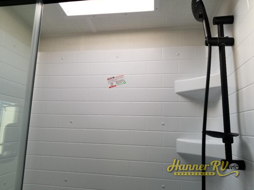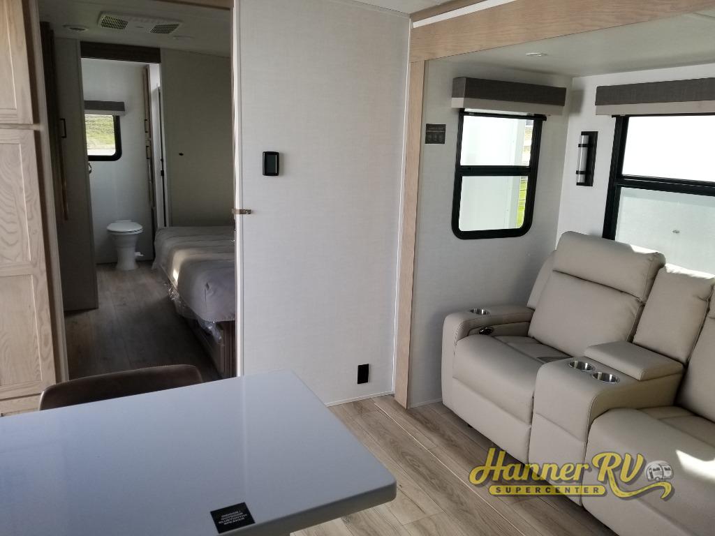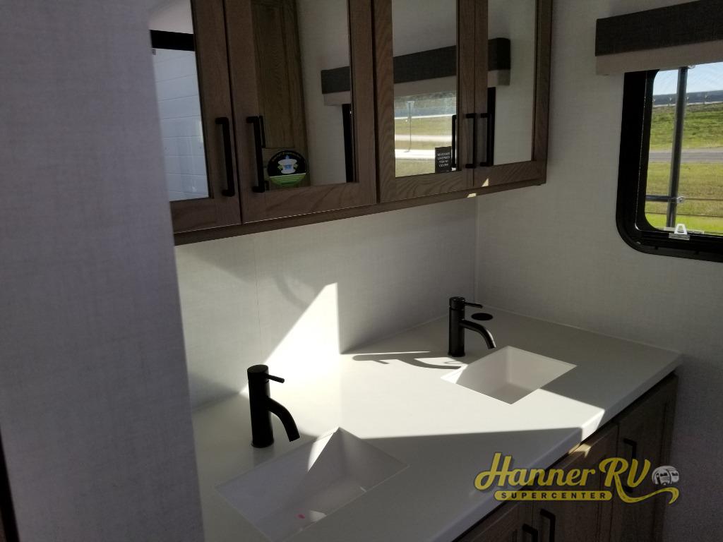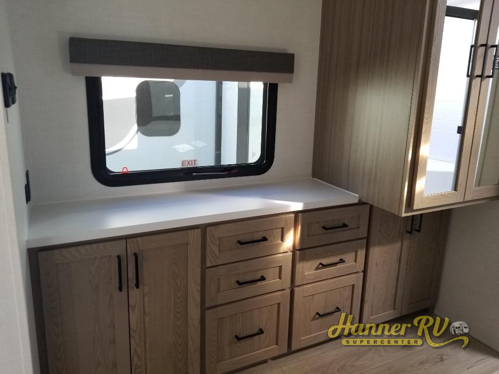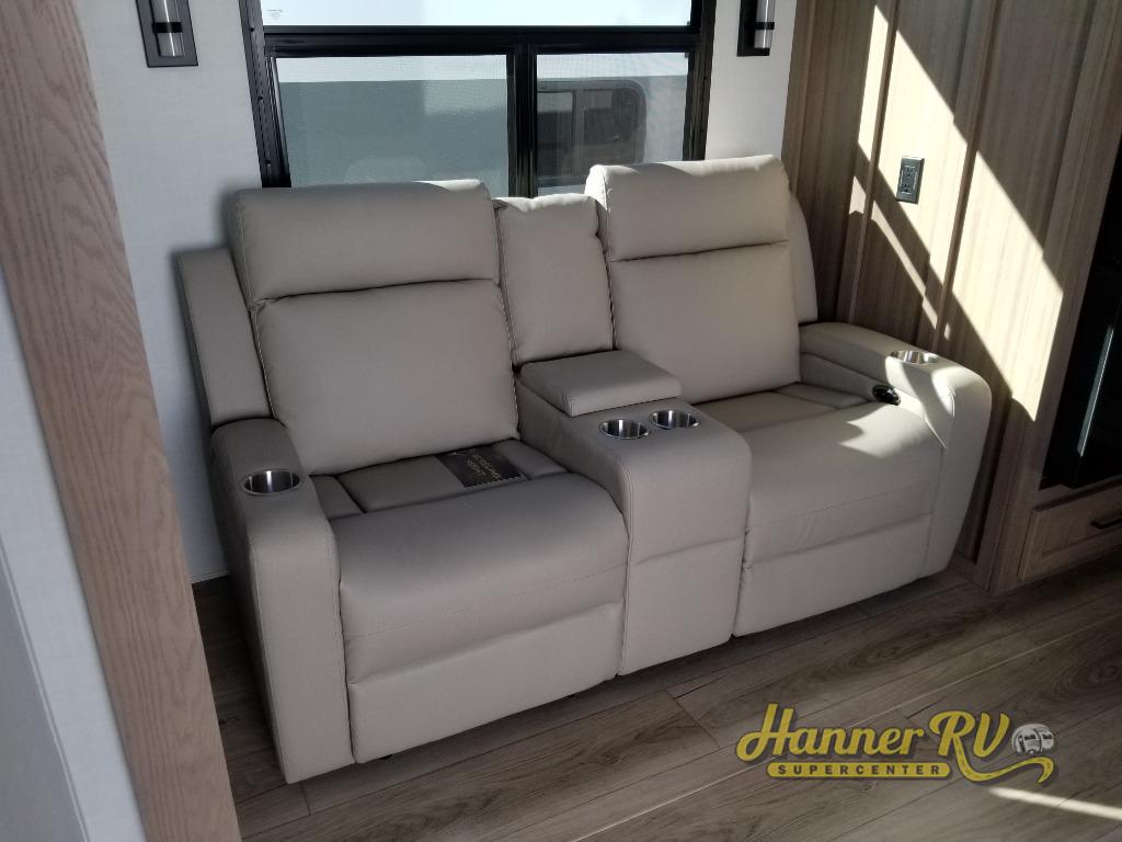 This front kitchen, couple's trailer is ready for adventure when you are! Once you arrive at your destination, prepare a quick lunch with the Griddle Prep, and enjoy the shade provided by the 19' power awning. You can eat outside, or inside at the counter with stools. The 67" theatre seat will make this travel trailer feel more like home, and the double slides provide more space to stretch out. Within the master bedroom you'll find a king bed, a large wardrobe and a dresser, plus an optional TV. And check out the full rear bath with dual bath sinks and a shower with a seat! Now, that's what I call comfort!