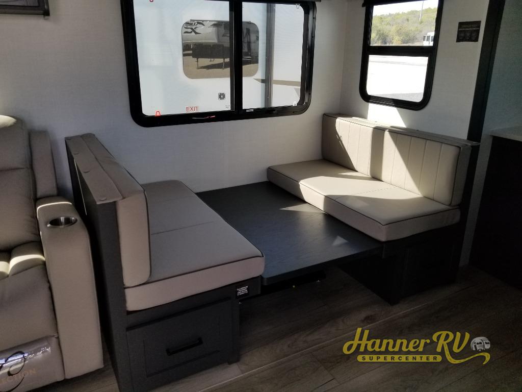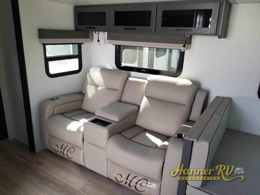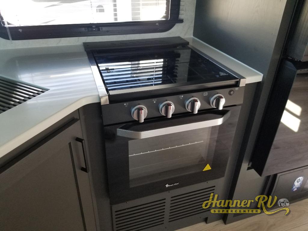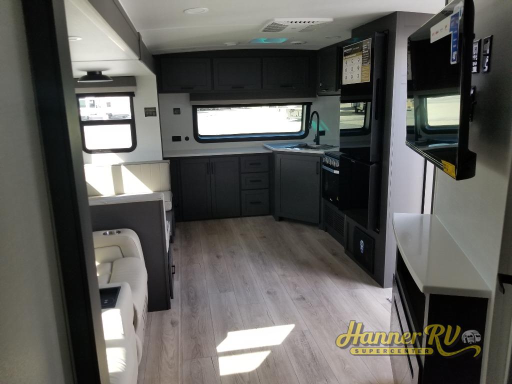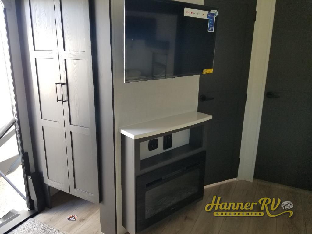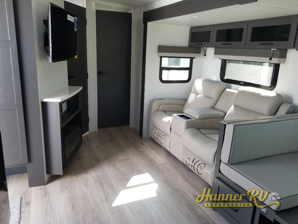 When you are outside this trailer you can enjoy the protection from the 21' power awning, you will also find exterior storage for your extra gear, and a ladder at the rear. You get to choose which entrance to step up into, be it the spacious rear bedroom with a queen bed slide and a wardrobe, or the main entry into the kitchen and living area. The furniture slide includes a booth dinette to eat your meals at, and theater seating to watch the Smart TV with a fireplace below. And the cook will love the front kitchen with extra counter space, a three-burner range, plus a 12V refrigerator and pantry for food storage!