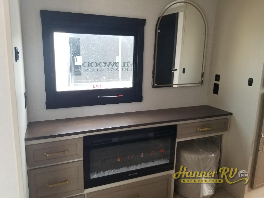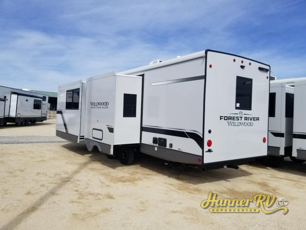 With any Wildwood Heritage Glen travel trailer by Forest River, the quality construction, attention to detail and design along with a bright and welcoming interior allows you to relax in comfort. Each model includes a WeatherShield one piece fiberglass roof, nitrogen-filled radial tires, and an enclosed underbelly with 12V tank heaters on all holding tanks for added protection. You will appreciate the on-demand tankless water heater, along with power stabilizer and tongue jacks, and an extra-large pass-thru storage with slam latch baggage doors. Head inside to enjoy matte gold hardware, wood door casings in place of plastic door casings, and an ultimate interior lighting upgrade with 4k puck/strip lights and a stylish LED back-lit bath mirror!