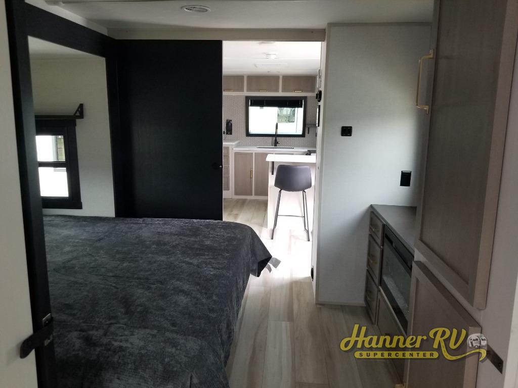 You'll love every minute spent in this double slide out, couple's trailer! You can wake up refreshed each day on your king bed, and enjoy great outdoor views with the bedroom panoramic window. There is also a dresser with a fireplace for a more cozy feel, and the full rear bath includes dual bath sinks plus a walk-in shower to freshen up in. Washer and dryer connections are also located here so you can choose to add those appliances if you wish. The main living area includes a 67" theater seat, no carpet for easy cleaning, and ample counter space in the front kitchen. There is also a bar top with two seats, and plenty of storage space for all your belongings.
