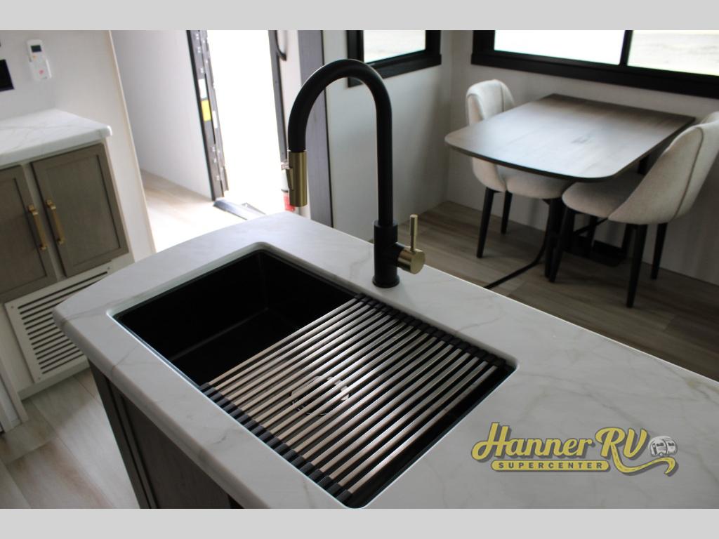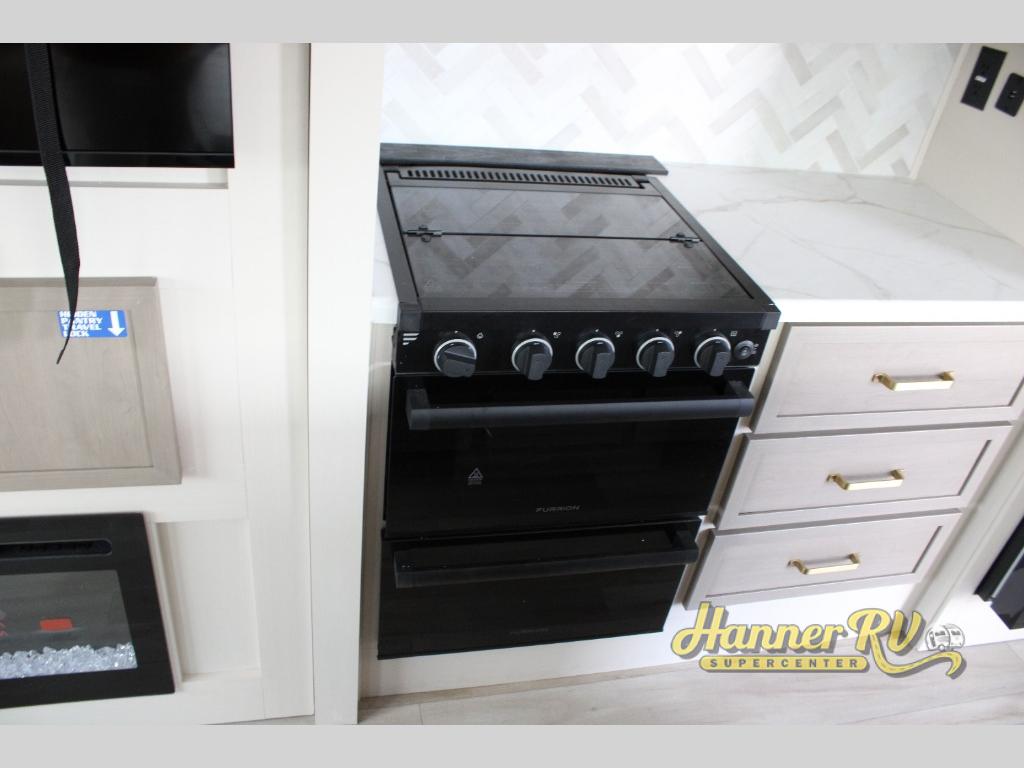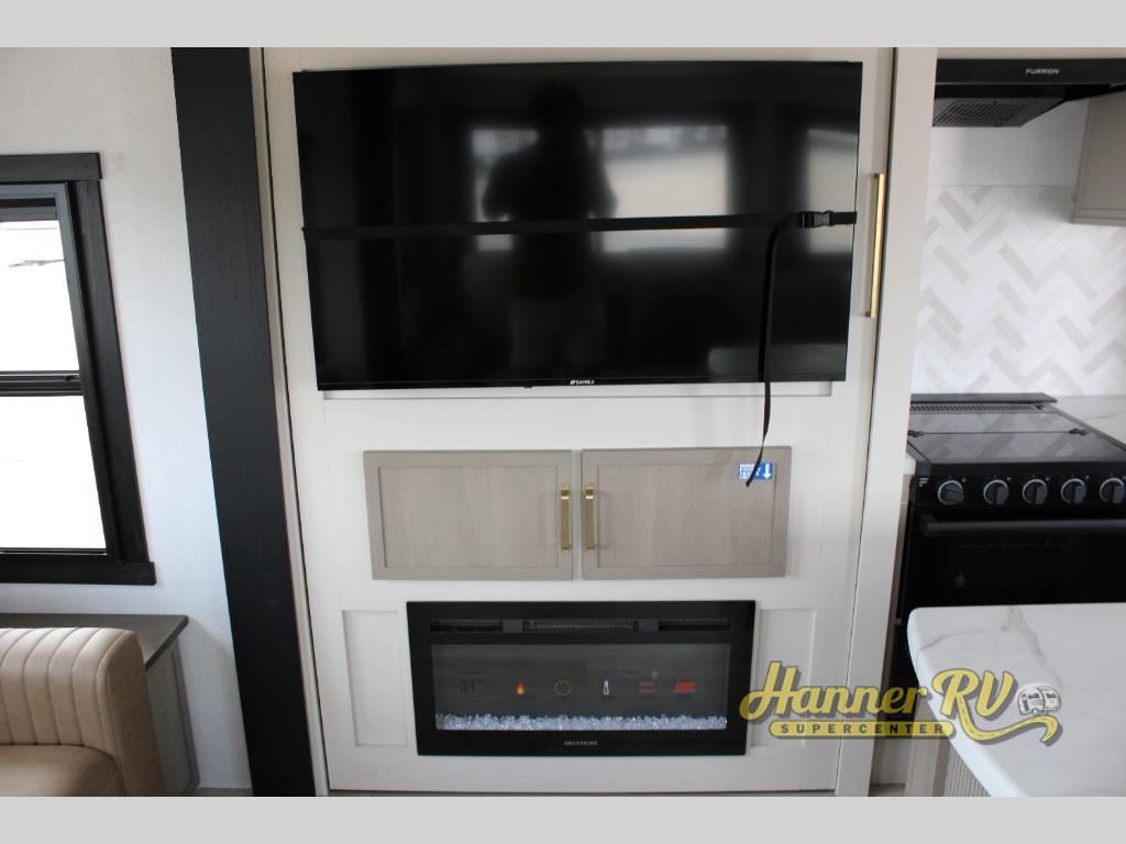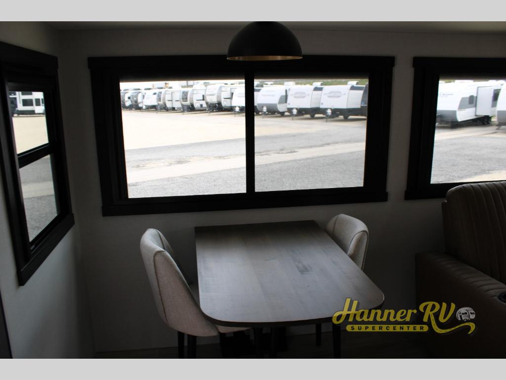 You are going to love the spacious private bedroom with a space-saving door, custom king bed slide, a dresser, and a full-width wardrobe with washer and dryer prep. If you ever decide to get out of bed, you can enjoy a relaxing shower in the residential shower with a skylight and a wide-open kitchen and living area with dual opposing slide outs. The cook will love having a kitchen island, a hutch, a large pantry, plus a 12V refrigerator. There is an entertainment center with a 50" TV and fireplace plus plenty of seating on the furniture. You can dine at the booth dinette or choose to add the free-standing dinette option if you prefer having your own seat. And don't forget about the natural lighting and views you will receive from the panoramic windows.