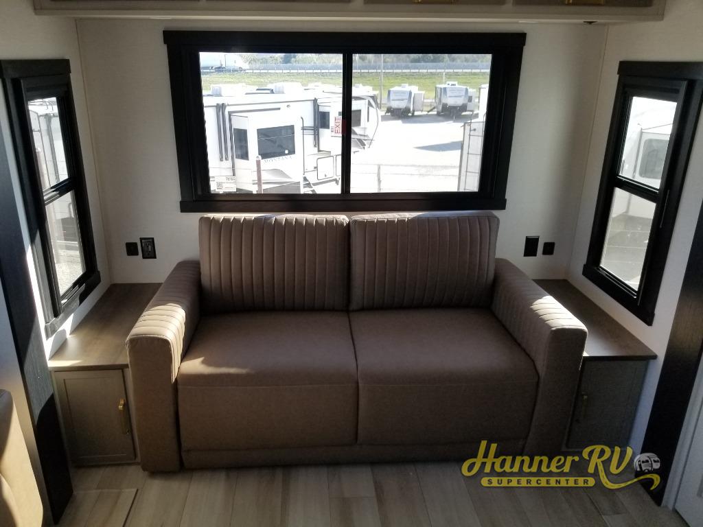 You are going to love the spacious private bedroom with a space-saving door, custom king bed slide, a dresser, and a full-width wardrobe with washer and dryer prep. If you ever decide to get out of bed, you can enjoy a relaxing shower in the residential shower with a skylight and a wide-open kitchen and living area with dual opposing slide outs. The cook will love having a kitchen island, a hutch, a large pantry, plus a 12V refrigerator. There is an entertainment center with a 50" TV and fireplace plus plenty of seating on the furniture. You can dine at the booth dinette or choose to add the free-standing dinette option if you prefer having your own seat. And don't forget about the natural lighting and views you will receive from the panoramic windows.
