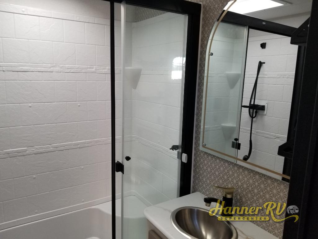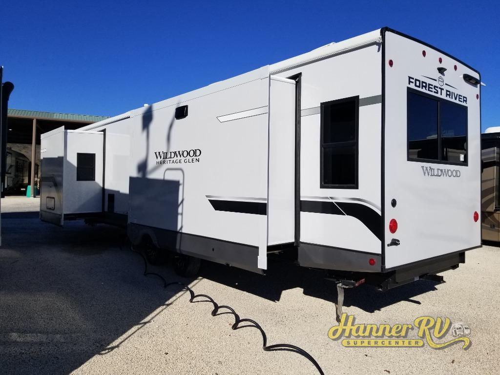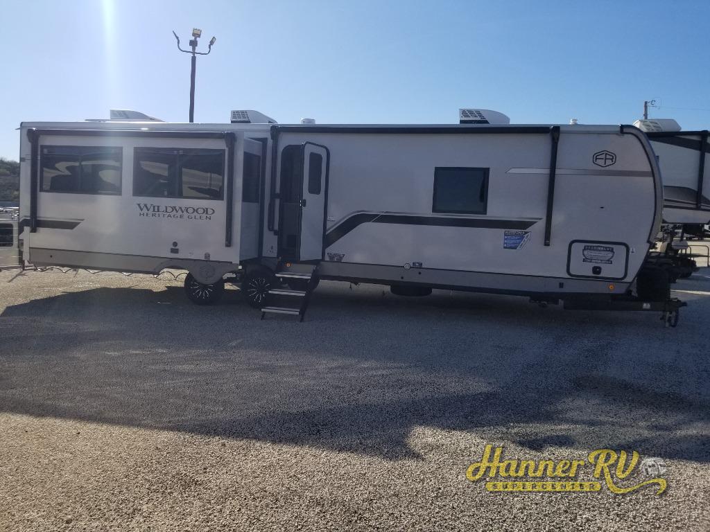 With any Wildwood Heritage Glen travel trailer by Forest River, the quality construction, attention to detail and design along with a bright and welcoming interior allows you to relax in comfort. Each model includes a WeatherShield one piece fiberglass roof, nitrogen-filled radial tires, and an enclosed underbelly with 12V tank heaters on all holding tanks for added protection. You will appreciate the on-demand tankless water heater, along with power stabilizer and tongue jacks, and an extra-large pass-thru storage with slam latch baggage doors. Head inside to enjoy matte gold hardware, wood door casings in place of plastic door casings, and an ultimate interior lighting upgrade with 4k puck/strip lights and a stylish LED back-lit bath mirror!