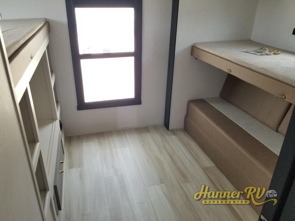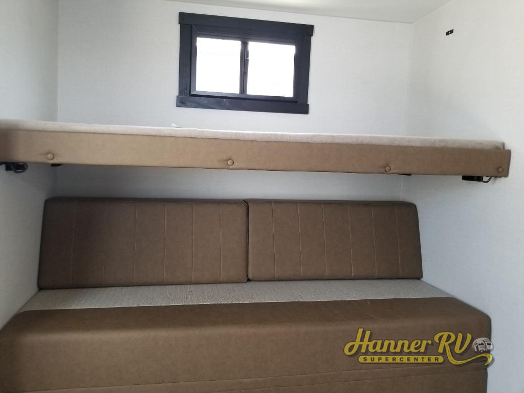 Your kids or friends are ready for a trip in this Wildwood Heritage Glen travel trailer, but are you? As the kiddos or your buddies claim the private bunkhouse for themselves, which includes two bunk beds and a convertible sofa bed, you can escape to your own privacy in the front bedroom with a queen bed with Versa Tilt and lots of storage. There is even washer/dryer prep for added convenience. The main living area and kitchen might be the next indoor hangout spot thanks to the chef-size walk-in pantry and 12V refrigerator. The cook even has a choice of making meals on the outside kitchen/bar which also includes an LP quick connect nearby. On rainy days, the theatre seats and booth dinette will offer a place to watch TV and play games, and the panoramic windows will always offer beautiful scenery no matter the weather conditions.
