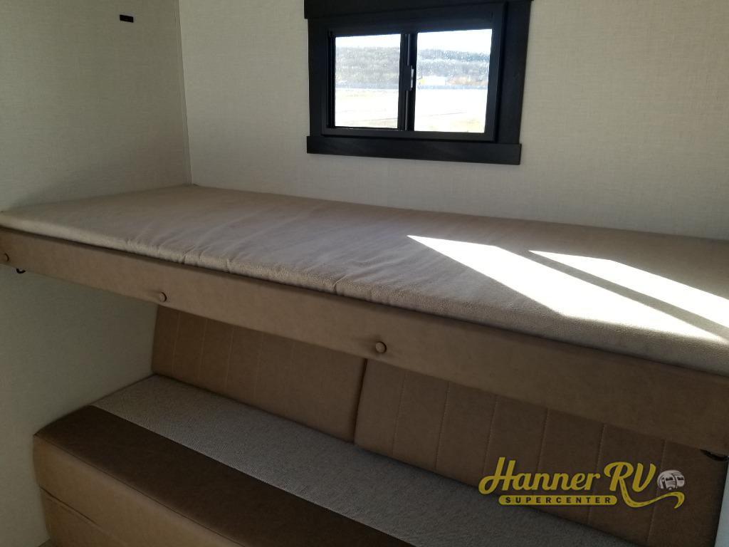 Get ready for some fun in this trailer that sleeps nine to ten happy campers! Everyone will be comfortable having access to a full bathroom near the front master bedroom and a half bath near the rear private bunkhouse, plus there are two entry doors into the trailer. The kids or your friends will get to choose from two 38" x 74" bunk beds and a convertible sofa bed, and the slide out in the bunkhouse offers more floor space to play games and such. The cook will have the choice of making meals on the outside kitchen/bar or inside with full amenities including a 12V refrigerator. Inside the main living area, everyone can watch TV, play games at the family size U-shaped dinette, and enjoy the views out of the panoramic windows. And don't overlook the front private bedroom with a queen bed with dual wardrobes, a shelf, plus USB/CPAP hookups!