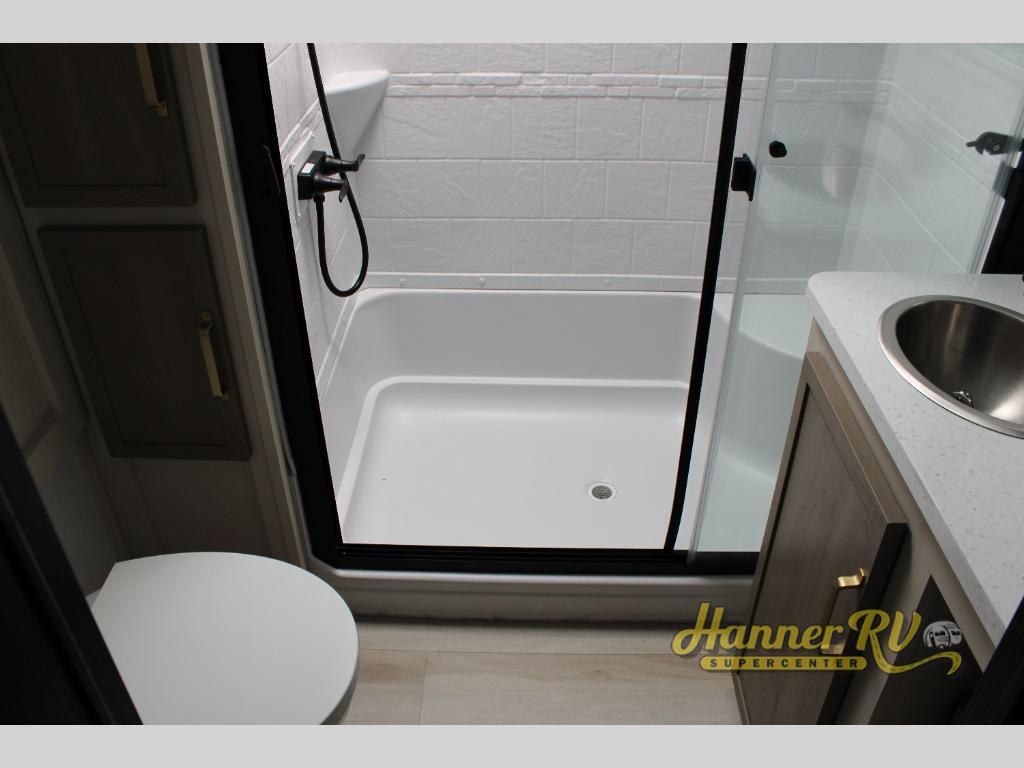 With any Wildwood Heritage Glen fifth wheel by Forest River, the quality construction, attention to detail and design along with a bright and welcoming interior allows you to relax in comfort with conveniences while exploring outdoors. The Summer Wind colored horizontal plank linoleum flooring is unique, beautiful and durable, and there are gold-accented faucets with stainless steel sinks in the bathrooms for added luxury. The Accessibelly underbelly with 12V tank heaters will help protect your unit from the elements, and the power stabilizer jacks and landing gear will make set-up a breeze. More features that provide convenience include the high-end solid surface countertops, an RV Airflow System that provides at least 25% better airflow, and solar prep for off-grid capabilities.
