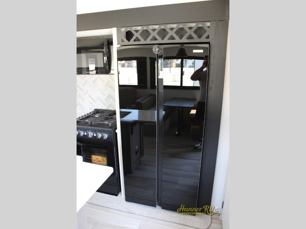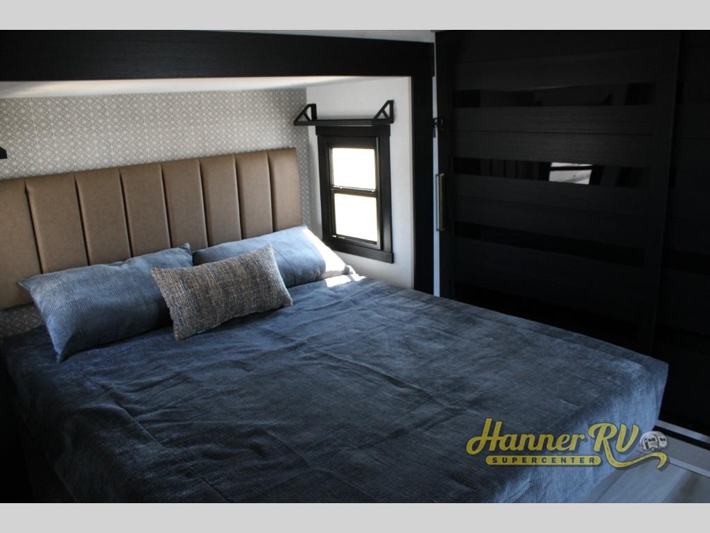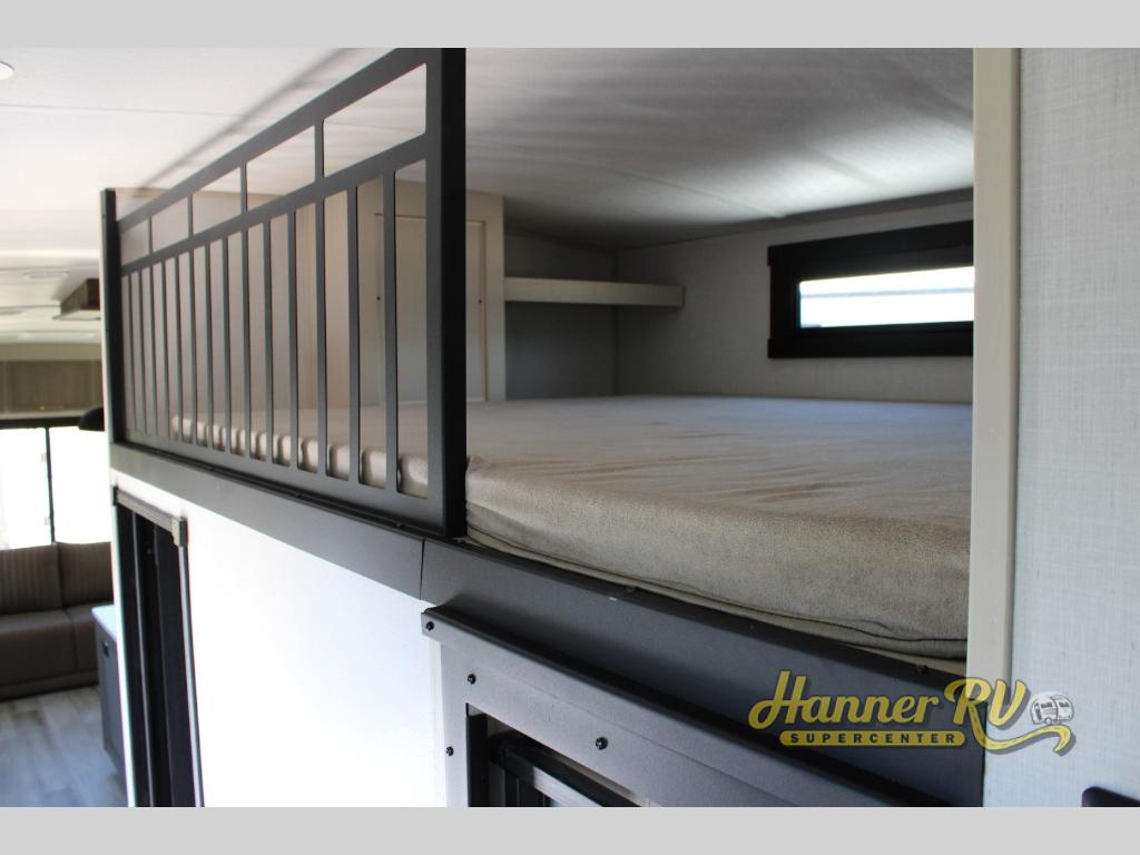 Imagine having your own master bedroom with a custom king bed, a full-width wardrobe, plus washer and dryer prep in this Wildwood Heritage Glen fifth wheel. You might even use the bench to put on your slippers before heading to the bathroom to get cleaned up in the residential walk-in shower. Your kids or friends can sleep in the middle bunkhouse that has a flip-up bunk, a Versa queen convertible sofa bed, and a loft above. You might also utilize this room as an office thanks to the desk. The chef will love all the appliances, the kitchen island, the deluxe French door pantry, and the 16 cu. ft. 12V refrigerator. There is also plenty of seating on all the furniture, and the cupholders in the theatre seats are handy.