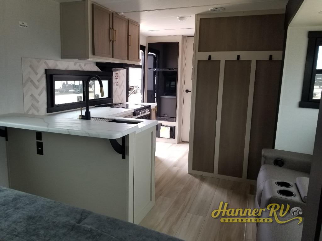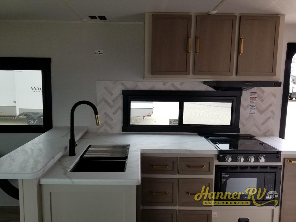 The Wildwood Heritage Glen Hyper-Lyte travel trailer by Forest River offers stability with a wide stance axle system, easy setup with a power tongue jack with an LED docking light, and safe entry with the Step Above aluminum entry steps. The interior includes Temple Cherry cabinetry with matte gold hardware, hidden hinges on the cabinet doors, and a residential single bowl undermount sink. You will also find a back-up camera prep and solar prep, an outdoor shower, and many more exterior conveniences.