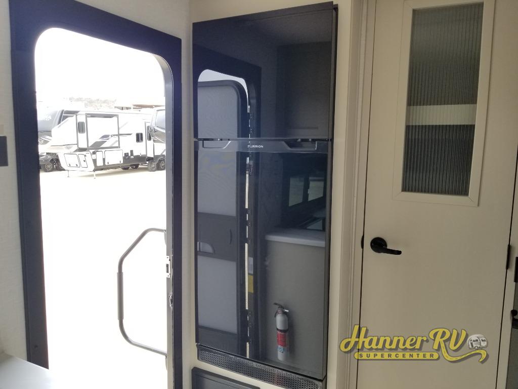 You and your favorite person can enjoy a spacious kitchen and living area thanks to the slide out, once inside leave your jackets on the coat hooks and you can relax on the theater seating slide out. Outside you will find a Texas-sized pass-through storage to grab your camp chairs and games from. Back inside you can take a restroom break in the full bathroom which also includes a shower and storage. The cook will appreciate having a pantry and a 12V refrigerator a few steps away from the microwave and stovetop. When it is time to relax, the front queen bed will be calling your name!