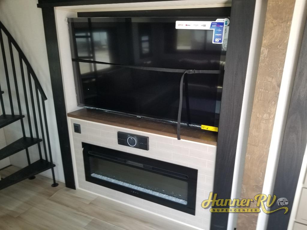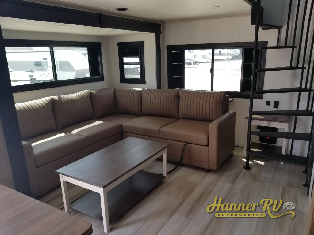 Introducing a new RV of its kind, the ROOST43 is a destination-style fifth wheel you are sure to love! There are two levels, making it feel more like home, and you can sleep six to eight each night. The master bedroom includes a custom king bed slide out, a 32" TV and fireplace, a desk/vanity, plus a half bath for convenience. A custom king-size bed is also found in the front loft, and there are storage cubbies plus a coax/110V outlet here to plug in chargers or a laptop. The second loft in the back includes spiral stairs, two bunk mats, a wardrobe, and cubby cubes here also for your guests' things. Some of the stand-out features you'll find on the first level are the sectional sofa with a coffee table, an entertainment center with a 65" TV, a kitchen island with five chairs, and a fully-equipped kitchen. The 20 cu. ft. 12V refrigerator and pull-out pantry will let you stock up on food, and the kitchen hutch will be perfect for nice dishes. The full bath on this model is one to remember; there is a one-piece fiberglass shower with a teak seat, a flip-up shelf and a washer/dryer, a backlit mirror, and more. And we haven't even touched on the exterior features, such as the pull-out tray, outdoor refrigerators, 20' awning, and more!