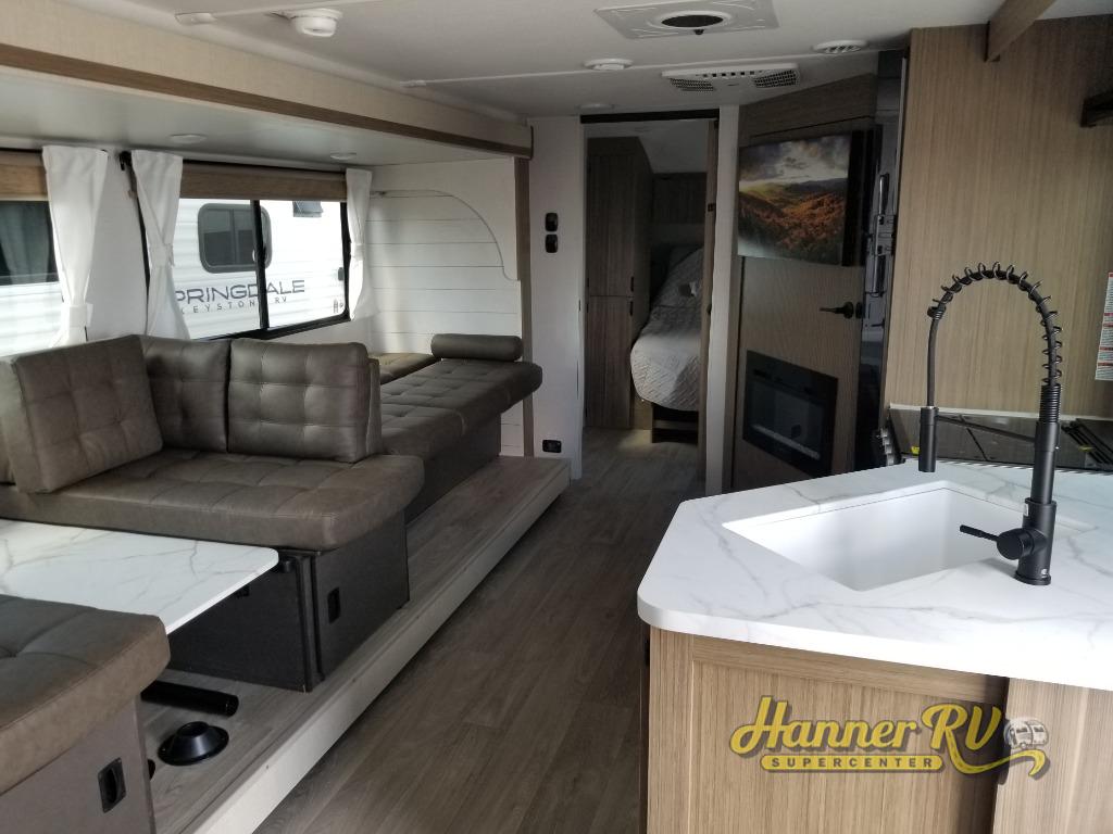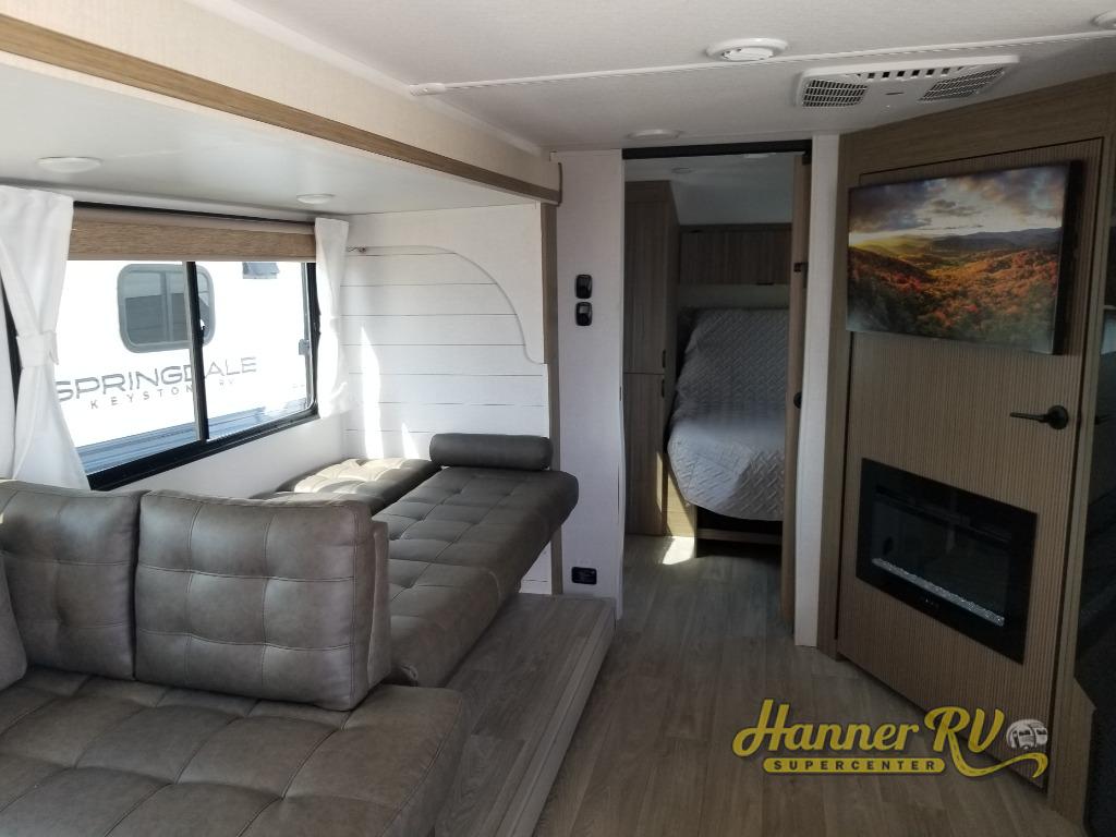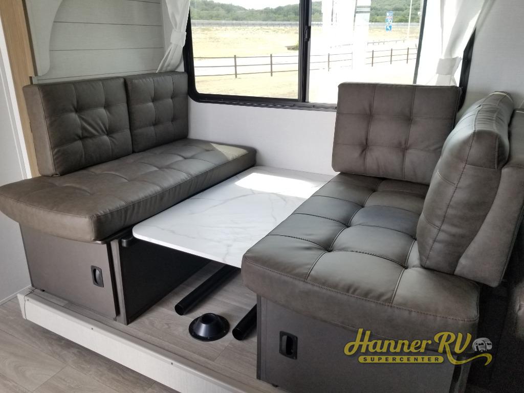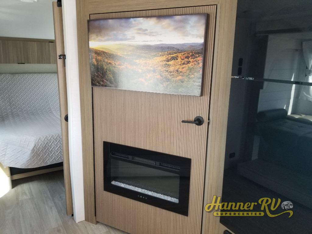 You're sure to make camping memories in this spacious travel trailer! You can sleep four to five people each night thanks to the the custom king bed with Versa Tilt in the front bedroom plus the Versa-Lounge and booth dinette within the large slide out! The full kitchen will let you make meals each day, and you'll appreciate the hidden pantry with shelves behind the fireplace. And don't overlook the full rear bath, complete with a tub/shower and ample counter space for your things.