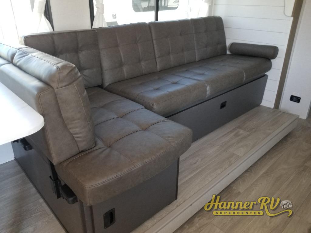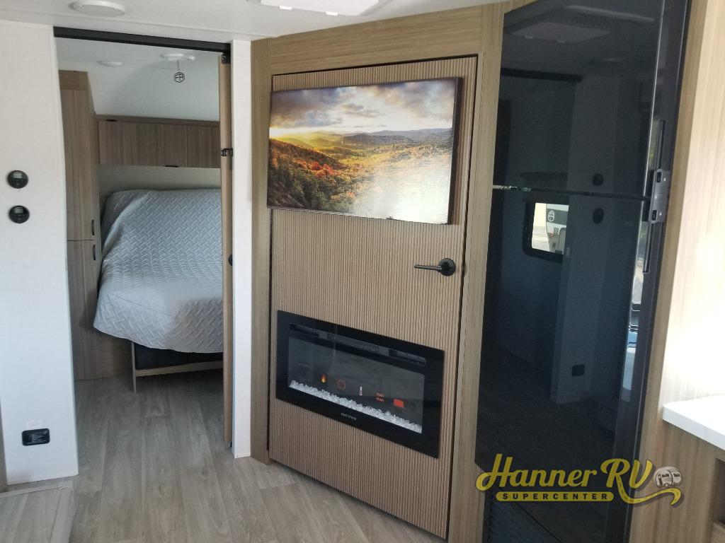 You're sure to make camping memories in this spacious travel trailer! You can easily sleep eight people each night thanks to the double-size bunks, the custom king bed with Versa Tilt in the front bedroom plus the Versa-Lounge within the large slide out! The full kitchen will let you make meals each day, and you'll appreciate the hidden pantry with shelves behind the fireplace. There is also a booth dinette where you can dine together or play a game of cards after dinner is cleaned up, or you may just find yourselves outdoors under the 16' awning. And don't overlook the full bath, complete with a tub/shower that will make bath time easier if you have little ones.