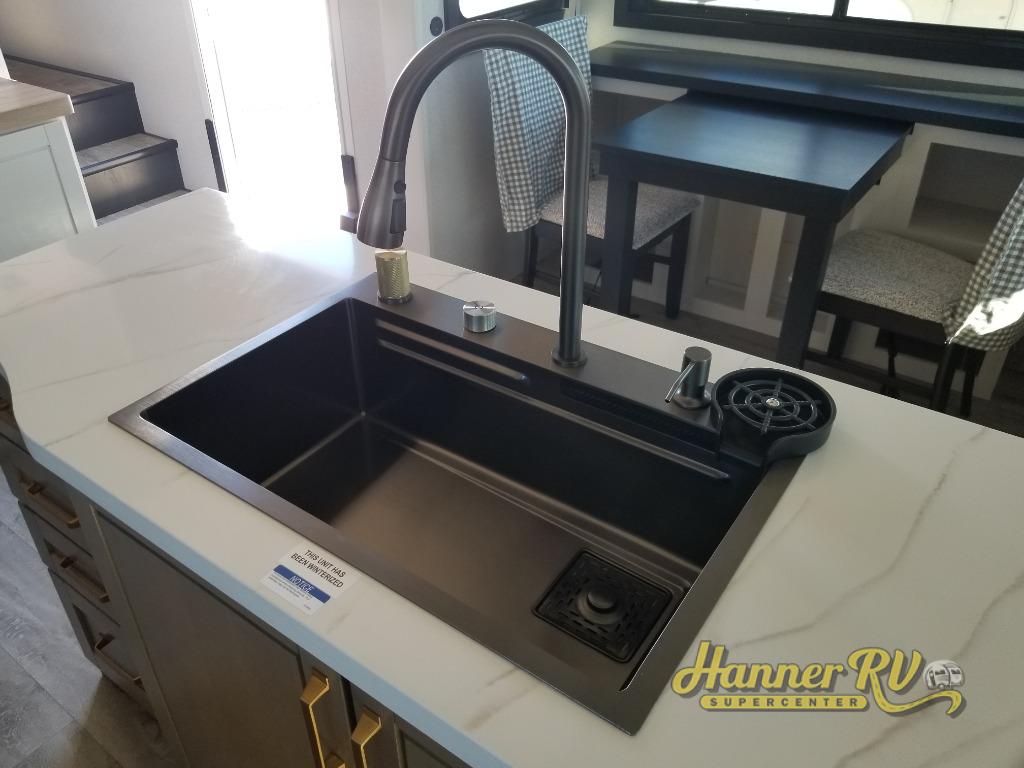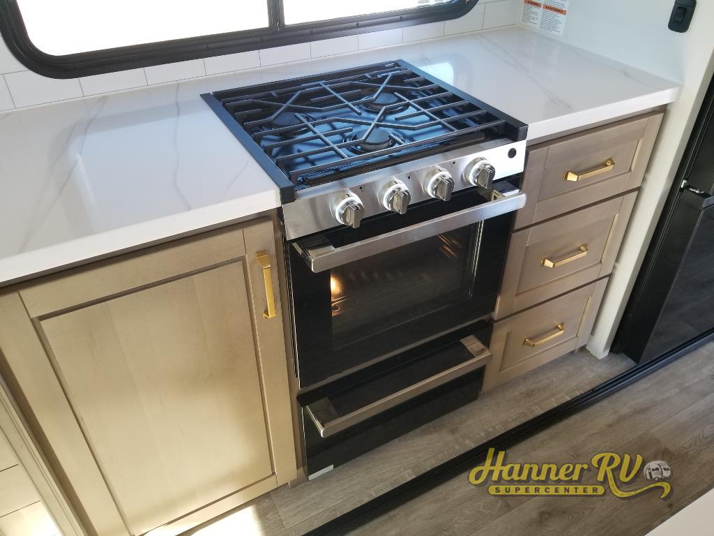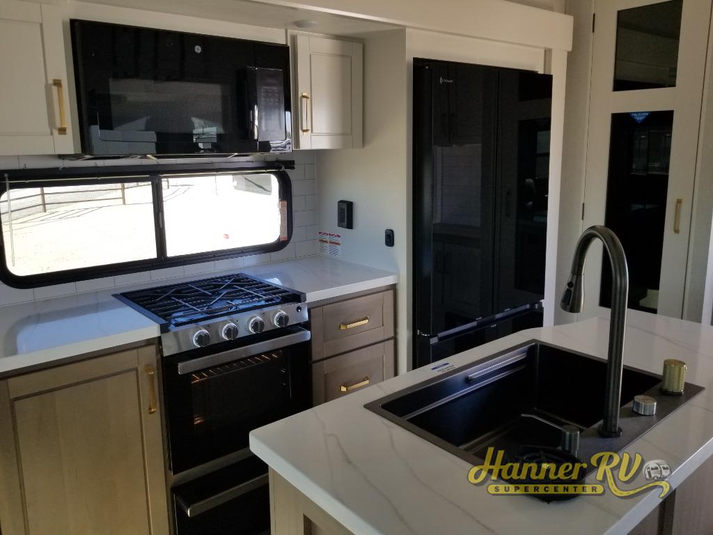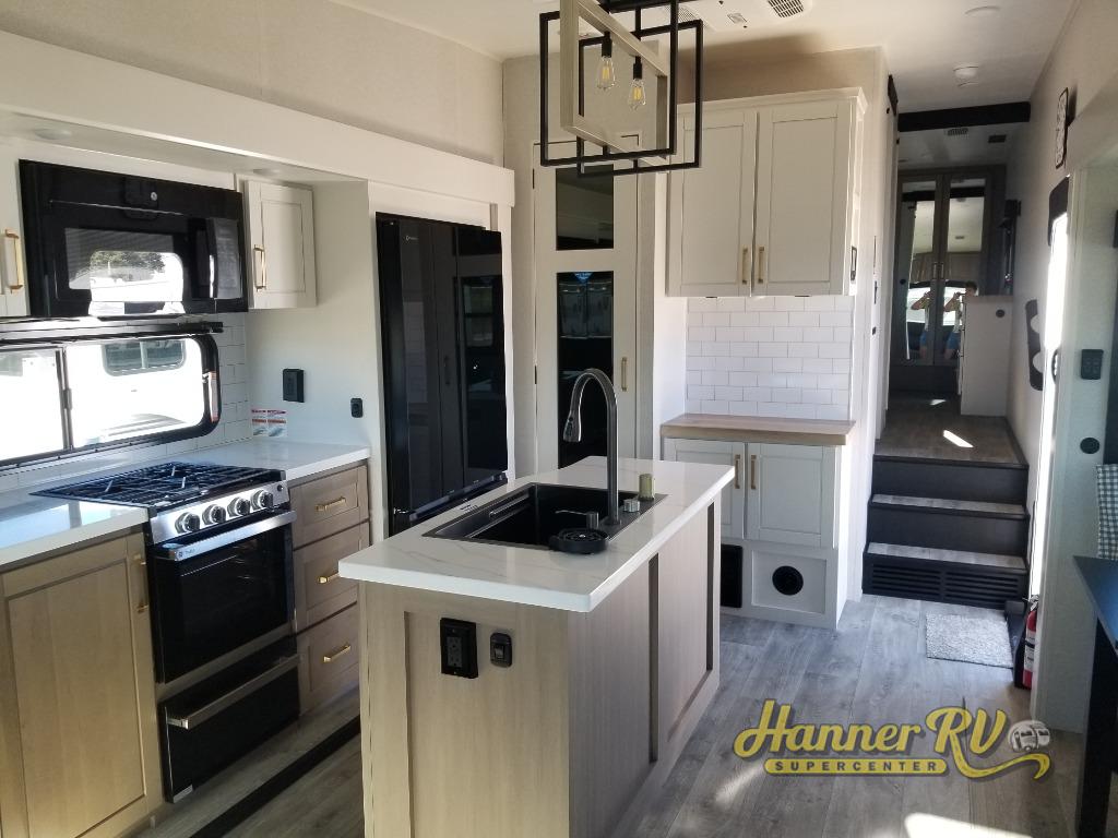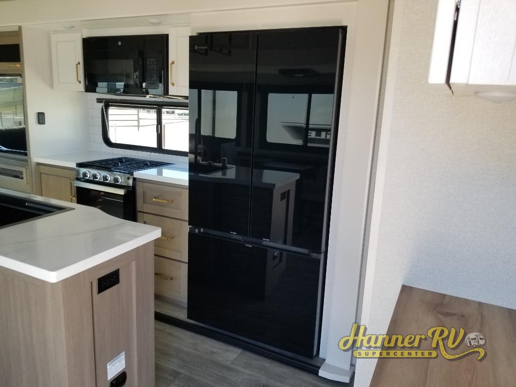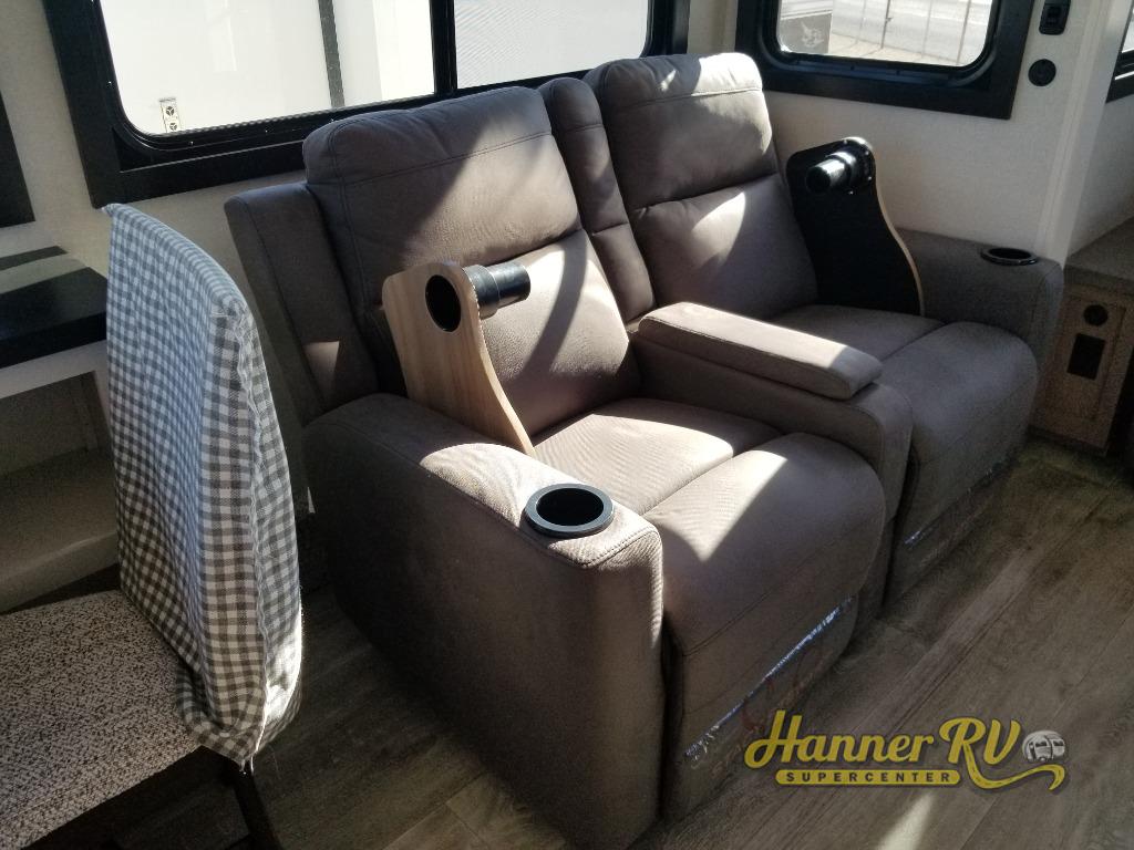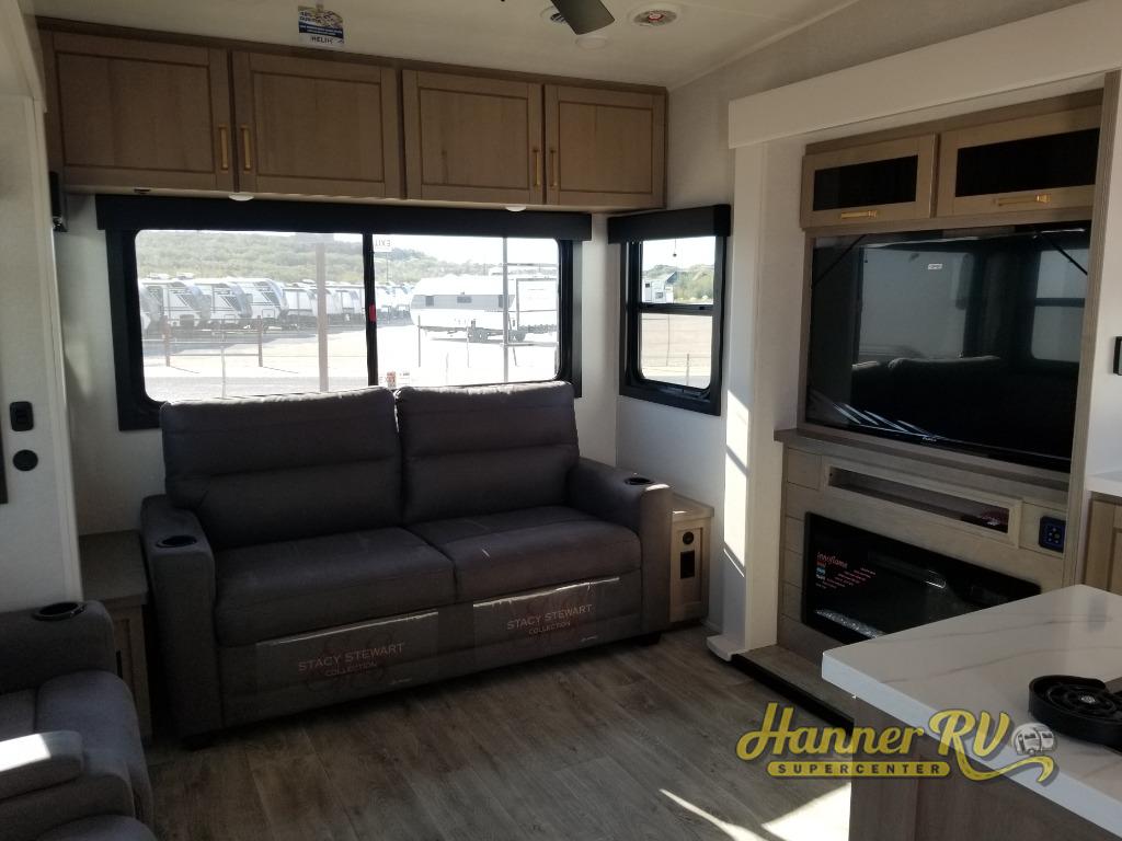 Triple slides for space, plenty of seating spaces, plus a spacious private bedroom make this fifth wheel one you won't want to pass up! You can freshen up each day in the full bath that includes a residential style glass shower door, a bathroom skylight, and a medicine cabinet to keep this space organized. Once you've cut up some fresh fruit at the kitchen island, whip up some eggs and bacon for breakfast, or just grab the cereal from the pantry. There is a spacious 16 cu. ft. 12V refrigerator, plus a hutch where you can store your own coffee machine. Relax on the tri-fold sofa, theater seat, or free-standing table with chairs/bench before heading out for the day. The king bed slide out in the front private bedroom will be waiting for you when you return!