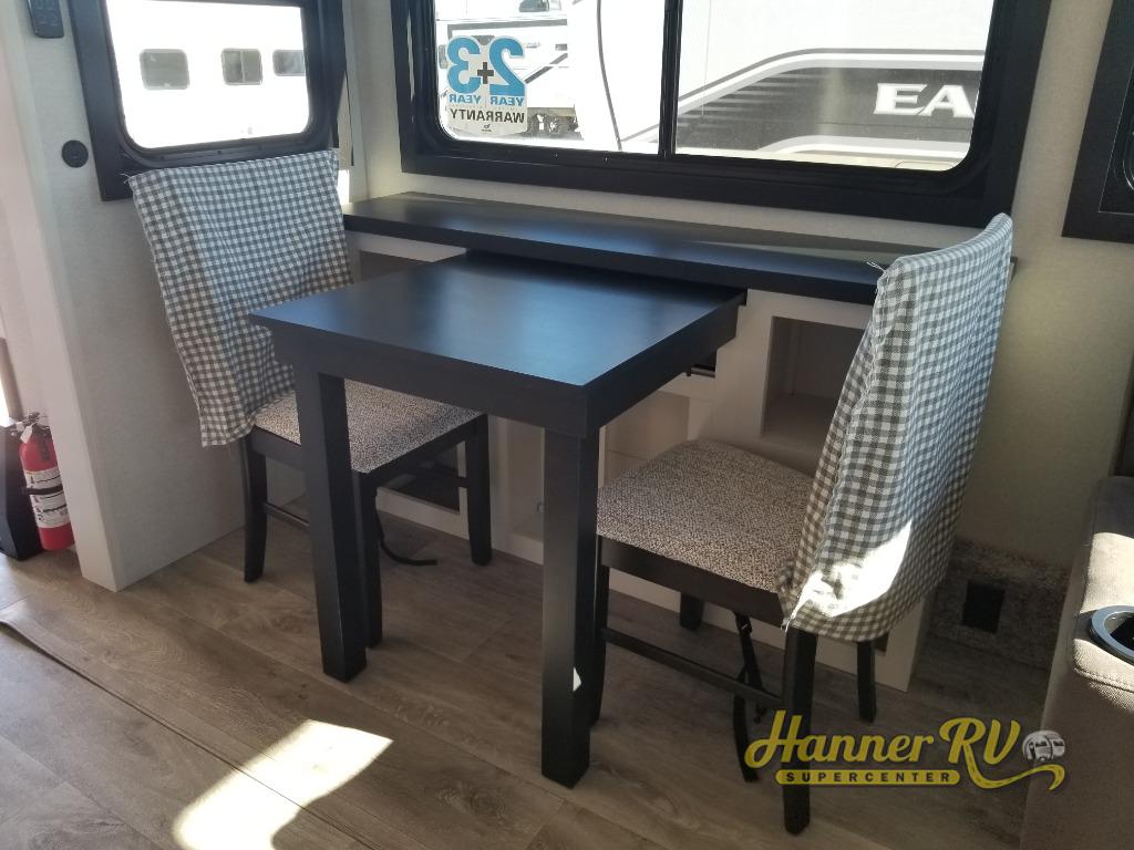 With any Eagle fifth wheel by Jayco you will appreciate durable construction materials, like the Magnum Truss Roof and the Stronghold VBL laminated walls. The JAYCOMMAND Smart RV system puts you in control of your RV's functions, and the 5 Star Handling Package will provide smooth towing from home to camp. Each model features Climate Shield zero-degree tested weather protection and the industry-exclusive HELIX cooling system that features two 15,000 BTU Whisper Quiet A/C's to keep you comfortable year around. Some of the exterior conveniences you are sure to love are the pass-through storage with Slam-Latch baggage doors and an automotive style front cap with max turn radius. The Eagle fifth wheels are designed to make you feel at home with solid hardwood slide fascia, residential vinyl flooring throughout, 100% no floor vents, and blackout roller shades with reflective side throughout for added privacy and insulation.