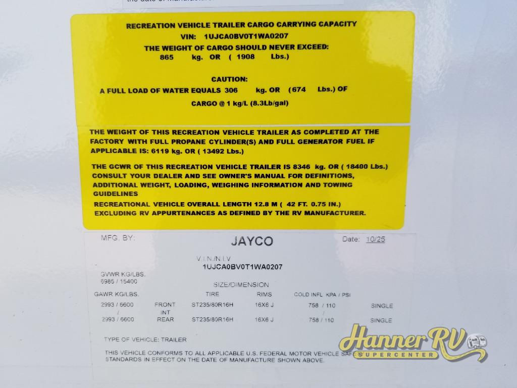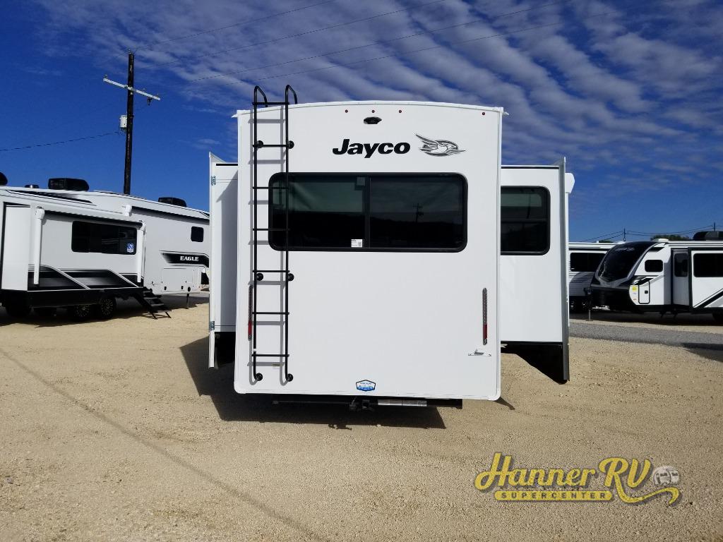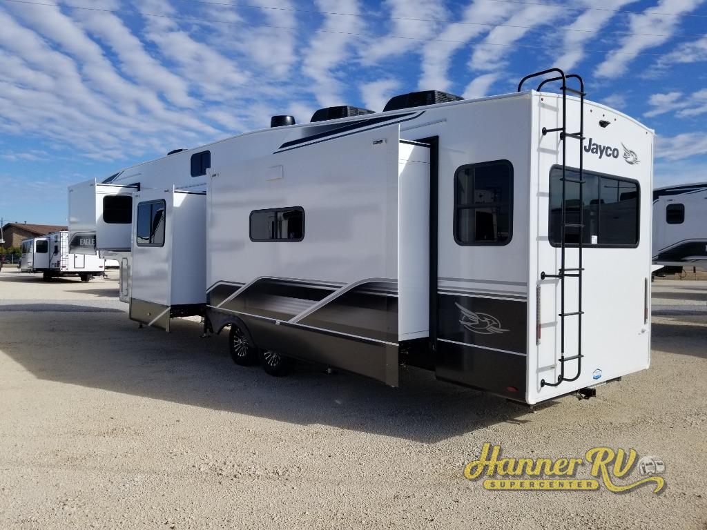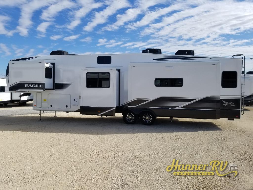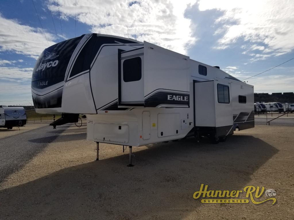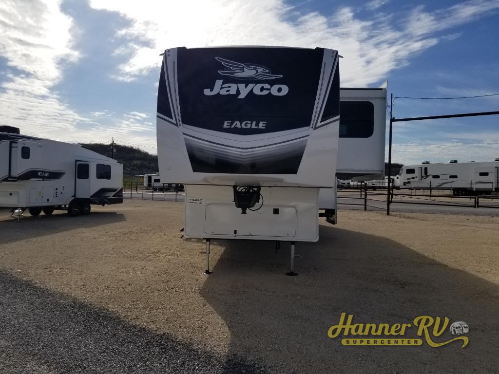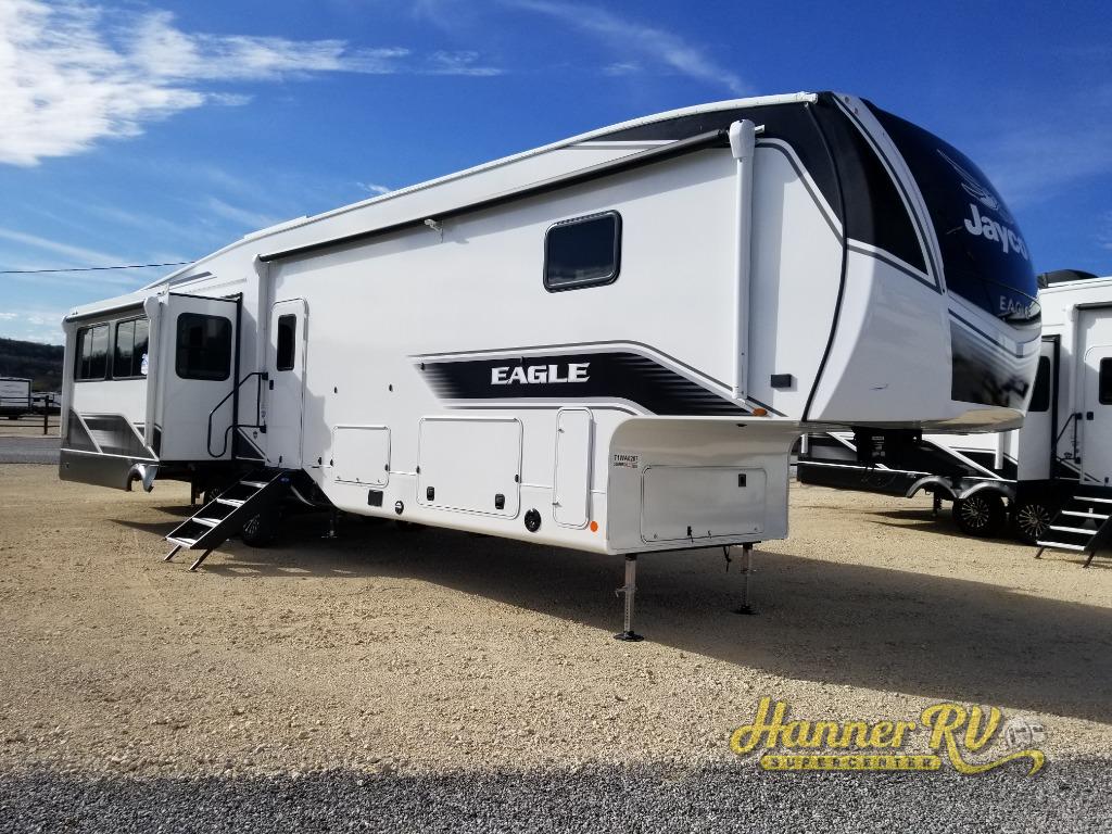 With any Eagle fifth wheel by Jayco you will appreciate durable construction materials, like the Magnum Truss Roof and the Stronghold VBL laminated walls. The JAYCOMMAND Smart RV system puts you in control of your RV's functions, and the 5 Star Handling Package will provide smooth towing from home to camp. Each model features Climate Shield zero-degree tested weather protection and the industry-exclusive HELIX cooling system that features two 15,000 BTU Whisper Quiet A/C's to keep you comfortable year around. Some of the exterior conveniences you are sure to love are the pass-through storage with Slam-Latch baggage doors and an automotive style front cap with max turn radius. The Eagle fifth wheels are designed to make you feel at home with solid hardwood slide fascia, residential vinyl flooring throughout, 100% no floor vents, and blackout roller shades with reflective side throughout for added privacy and insulation.