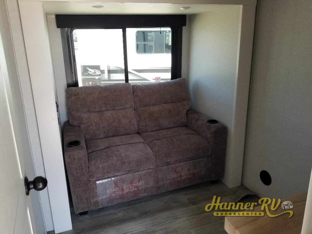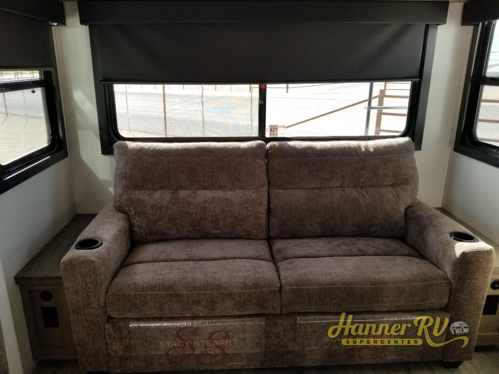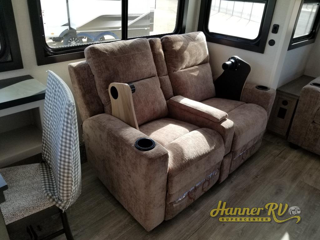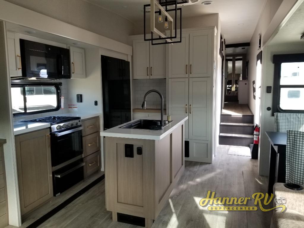 This fifth wheel with four slides is one your whole crew will love! There is a middle bedroom/den with a tri-fold sofa and a desk, allowing this room to become an office if you need it. The loft above this room will be a big hit with the little ones, and the full bath is centrally located so everyone can use it easily. You will have the front private bedroom all to yourselves with a king bed slide out, a chest with TV prep, plus washer and dryer prep in the walk-in closet. The main living area includes everything you need to relax in comfort, like the theater seats, tri-fold sofa, and entertainment center with a fireplace. The chef will enjoy the extra counter space provided by the kitchen island, and there is plenty of storage with the pantry, hutch, and 16 cu. ft. 12V refrigerator. This model even has an outside kitchen, two power awnings, and outside storage for all your gear!