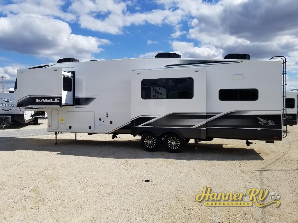 With any Eagle fifth wheel by Jayco you will appreciate durable construction materials, like the Magnum Truss Roof and the Stronghold VBL laminated walls. The JAYCOMMAND Smart RV system puts you in control of your RV's functions, and the 5 Star Handling Package will provide smooth towing from home to camp. Each model features Climate Shield zero-degree tested weather protection and the industry-exclusive HELIX cooling system that features two 15,000 BTU Whisper Quiet A/C's to keep you comfortable year around. Some of the exterior conveniences you are sure to love are the pass-through storage with Slam-Latch baggage doors and an automotive style front cap with max turn radius. The Eagle fifth wheels are designed to make you feel at home with solid hardwood slide fascia, residential vinyl flooring throughout, 100% no floor vents, and blackout roller shades with reflective side throughout for added privacy and insulation.