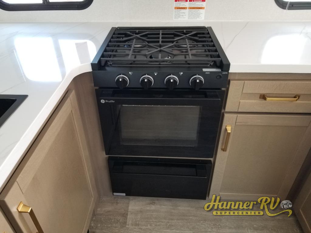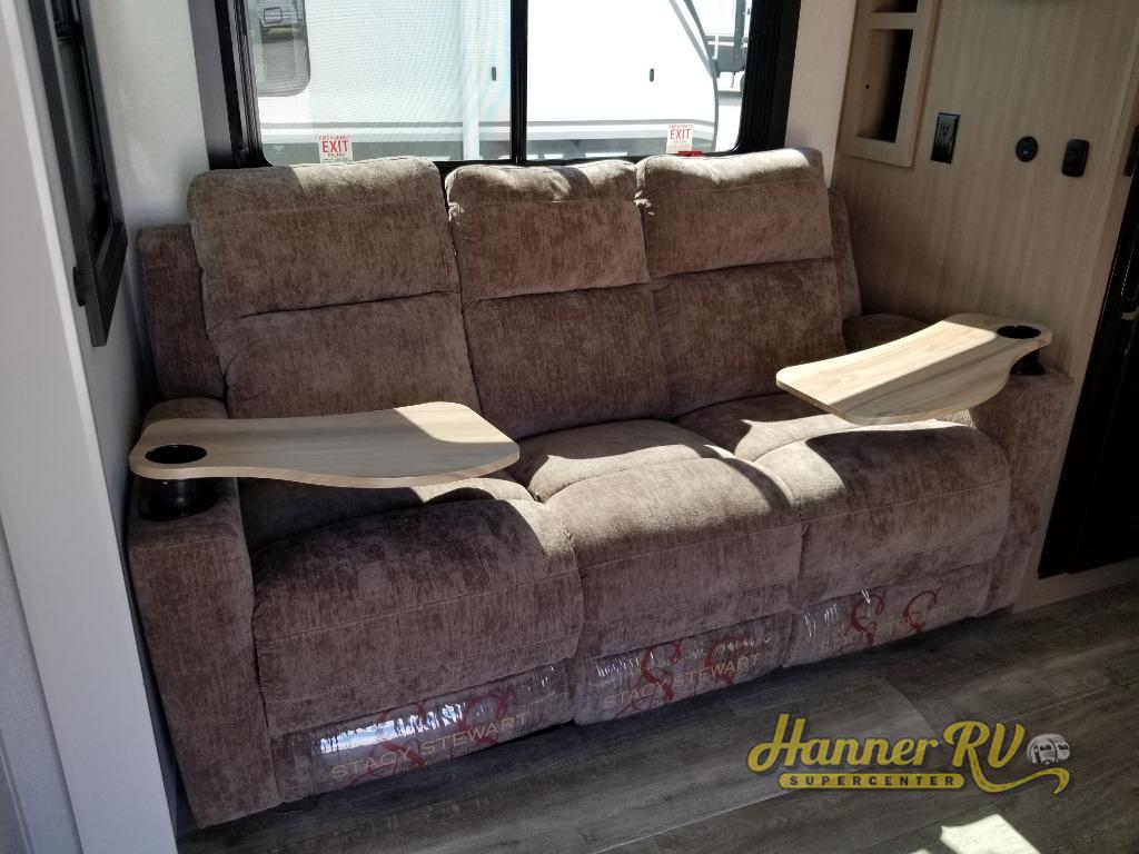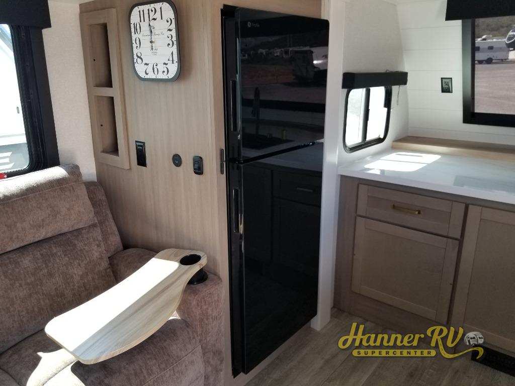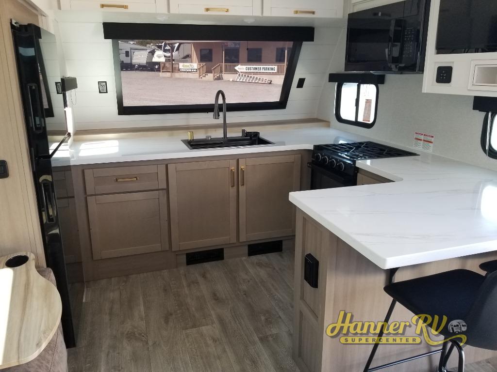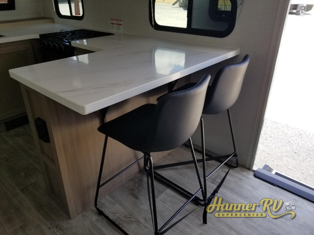 This is the perfect travel trailer for the couple who loves comfort at the campground! The front kitchen features ample counter space, including a bartop with barstool chairs and all the appliances to make your best meals. If you'd rather be outside, there is an outdoor kitchen and a power awning where you can spend your evenings. The master bedroom includes an Olympic-size queen bed slide out, a dresser, plus a wardrobe with washer and dryer prep. And don't overlook the full rear bath, complete with a 30" x 48" shower, a linen closet, and dual bath sinks so you both can get ready at the same time!