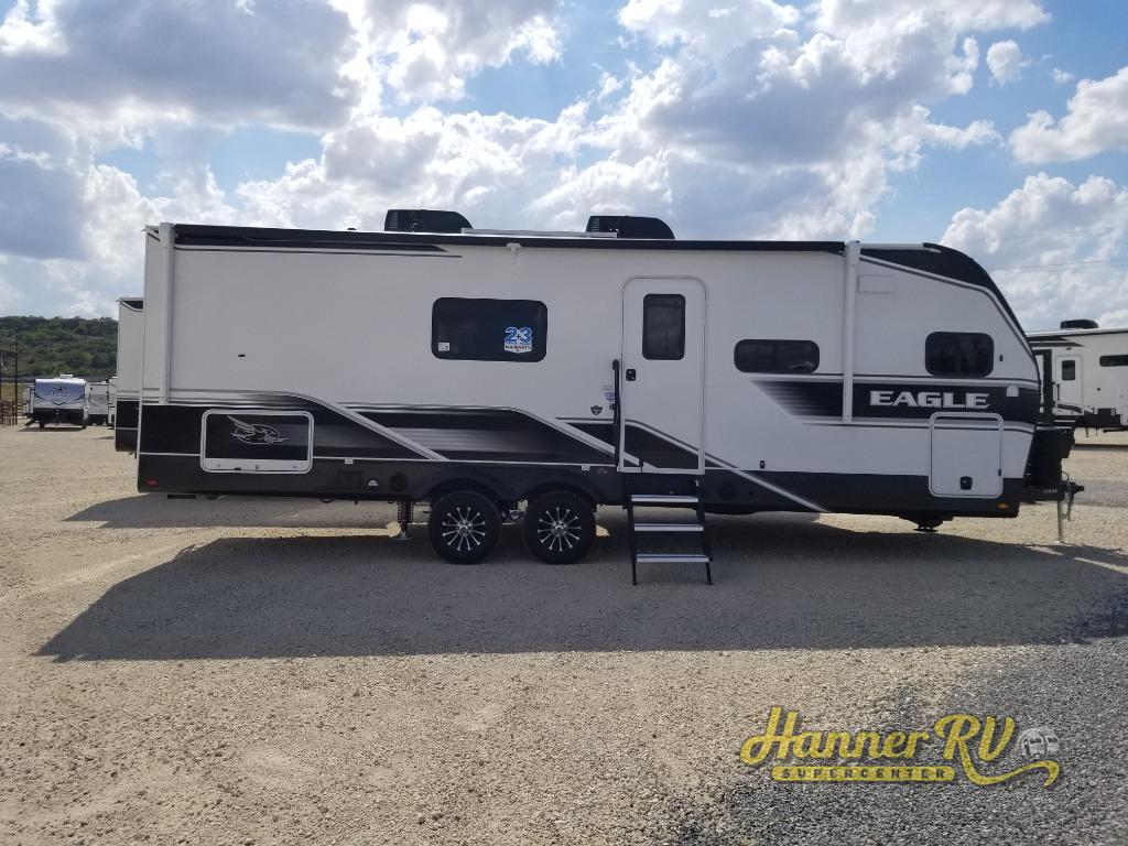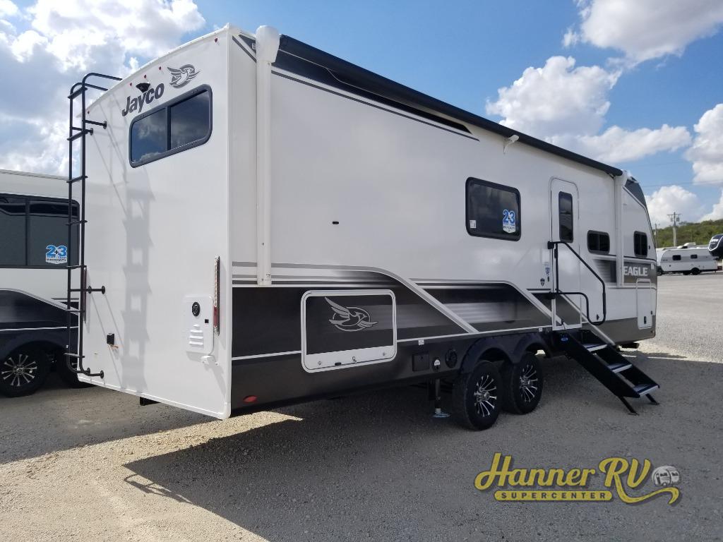 With any Eagle HT fifth wheel or travel trailer by Jayco you will enjoy a smooth drive thanks to the 4 Star Handling Package and MORryde CRE-3000 rubberized suspension. The Customer Value Package includes amenities that are sure to make camping easier than ever, like the 60K on-demand water heater, Keyed-Alike lock system, 15,000 BTU "Whisper Quiet" A/C, and more. Handcrafted door/drawer fronts will make your space feel more like home, along with residential vinyl flooring throughout, GE appliances, and blackout roller shades with reflective side throughout to keep the sun out when you want to sleep in. Each model also includes a NuVo H2O water treatment system with filters included, interior and exterior "Blue Sync" audio connect with MB Quart Sound for your TV and phone, and 100% no floor vents for added comfort and convenience!