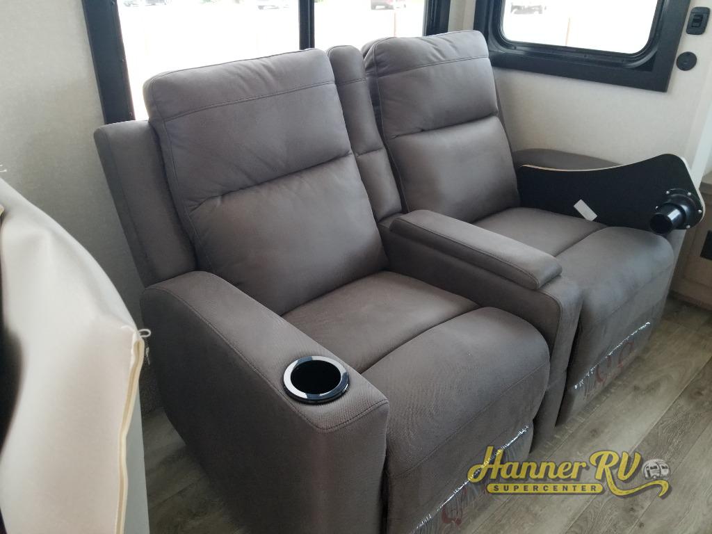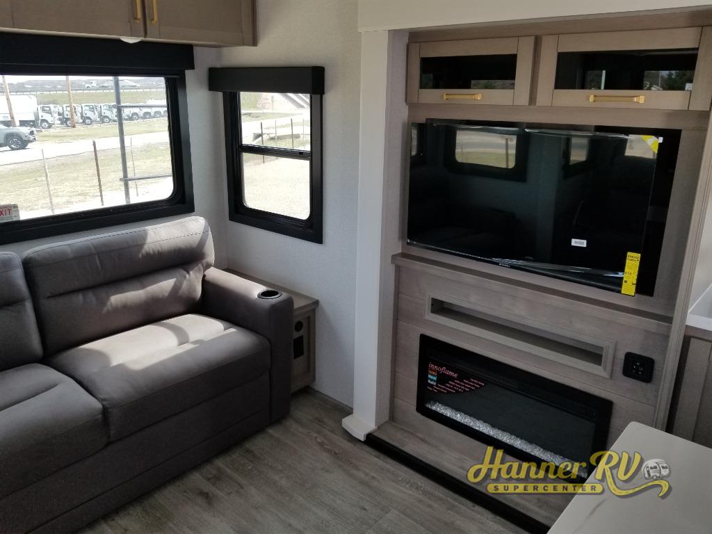 You will feel right at home camping in this travel trailer! It features a front private bedroom with an Olympic queen bed slide for more interior space, a dresser, a front wardrobe to hang your clothes, and a wardrobe that is prepped to add an optional washer and dryer. Start each morning getting squeaky clean in the full bathroom with the shower and then head to the kitchen to fry up some eggs on the stainless steel range. The kitchen island with a multi-functional sink will help make meal prepping easier too, plus there is a hutch to store your dishes. Enjoy a relaxing evening by the fireplace and watch your favorite movie with the entertainment center while sitting on either the rear tri-fold sofa or the theater seating!
