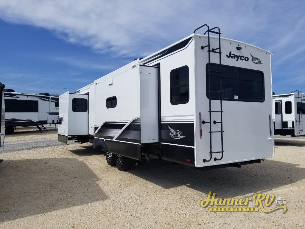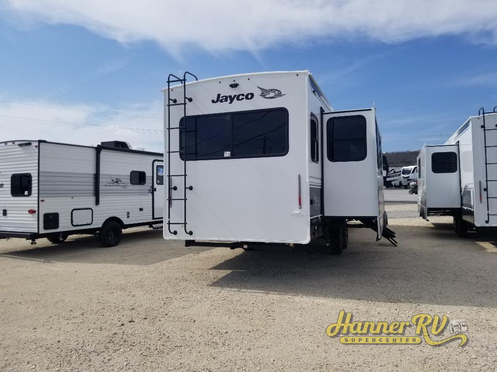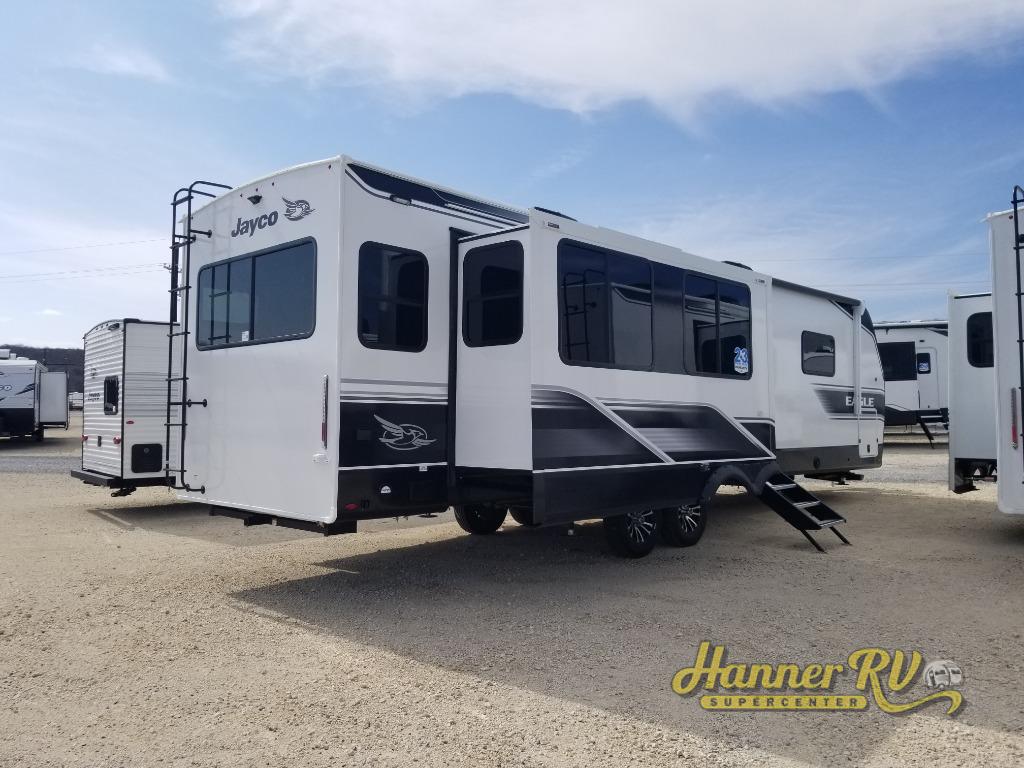 With any Eagle HT fifth wheel or travel trailer by Jayco you will enjoy a smooth drive thanks to the 4 Star Handling Package and MORryde CRE-3000 rubberized suspension. The Customer Value Package includes amenities that are sure to make camping easier than ever, like the 60K on-demand water heater, Keyed-Alike lock system, 15,000 BTU "Whisper Quiet" A/C, and more. Handcrafted door/drawer fronts will make your space feel more like home, along with residential vinyl flooring throughout, GE appliances, and blackout roller shades with reflective side throughout to keep the sun out when you want to sleep in. Each model also includes a NuVo H2O water treatment system with filters included, interior and exterior "Blue Sync" audio connect with MB Quart Sound for your TV and phone, and 100% no floor vents for added comfort and convenience!