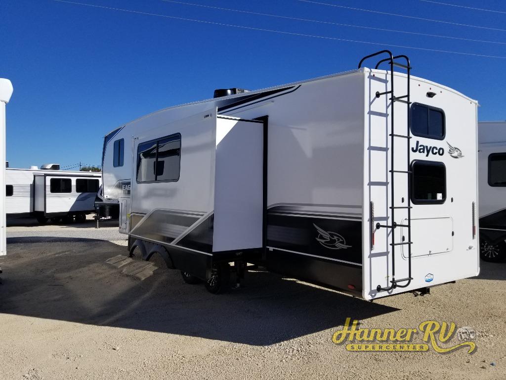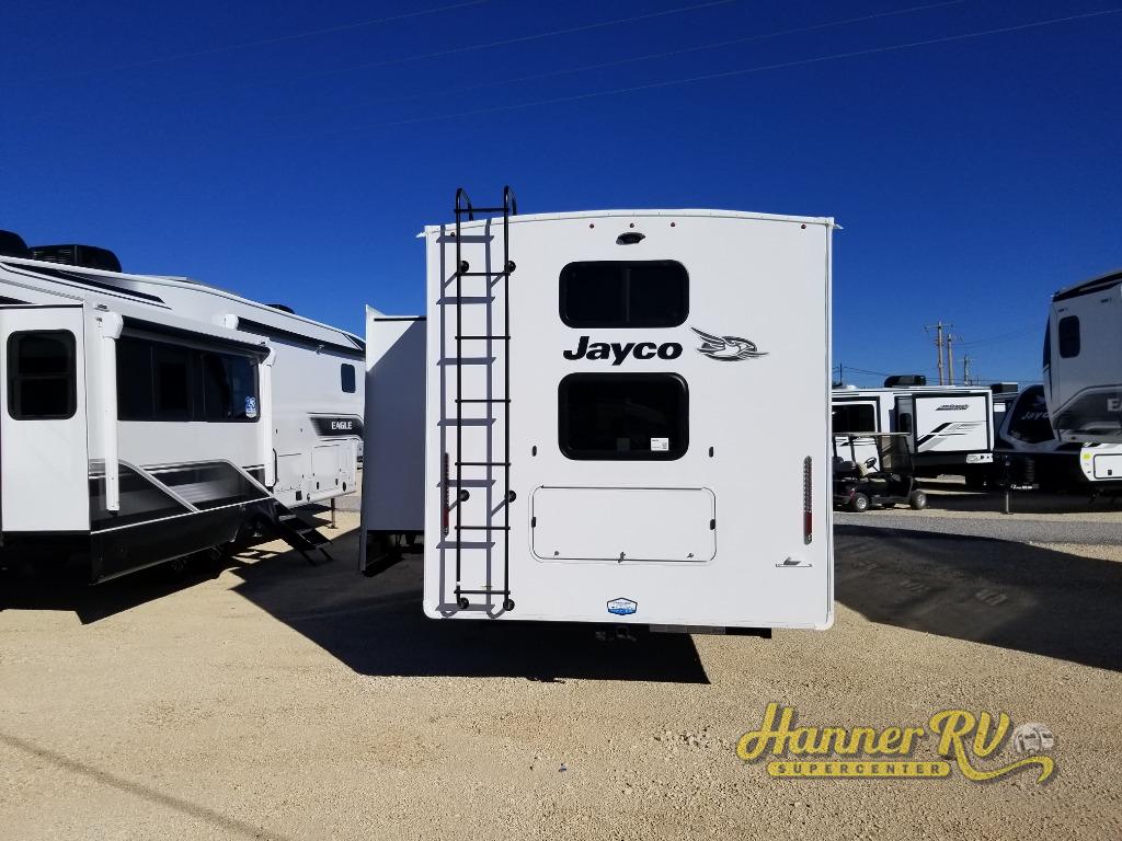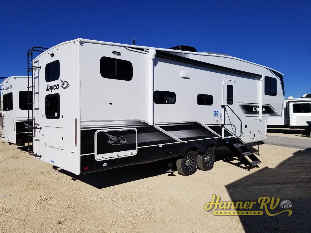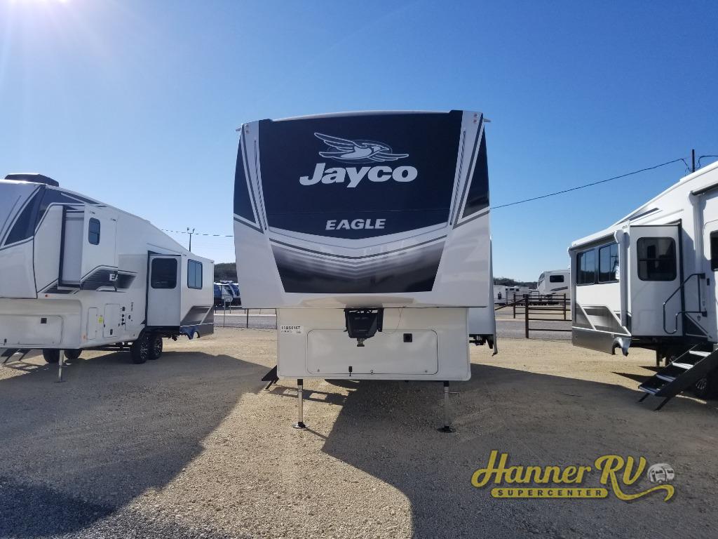 With any Eagle HT fifth wheel or travel trailer by Jayco you will enjoy a smooth drive thanks to the 4 Star Handling Package and MORryde CRE-3000 rubberized suspension. The Customer Value Package includes amenities that are sure to make camping easier than ever, like the 60K on-demand water heater, Keyed-Alike lock system, 15,000 BTU "Whisper Quiet" A/C, and more. Handcrafted door/drawer fronts will make your space feel more like home, along with residential vinyl flooring throughout, GE appliances, and blackout roller shades with reflective side throughout to keep the sun out when you want to sleep in. Each model also includes a NuVo H2O water treatment system with filters included, interior and exterior "Blue Sync" audio connect with MB Quart Sound for your TV and phone, and 100% no floor vents for added comfort and convenience!