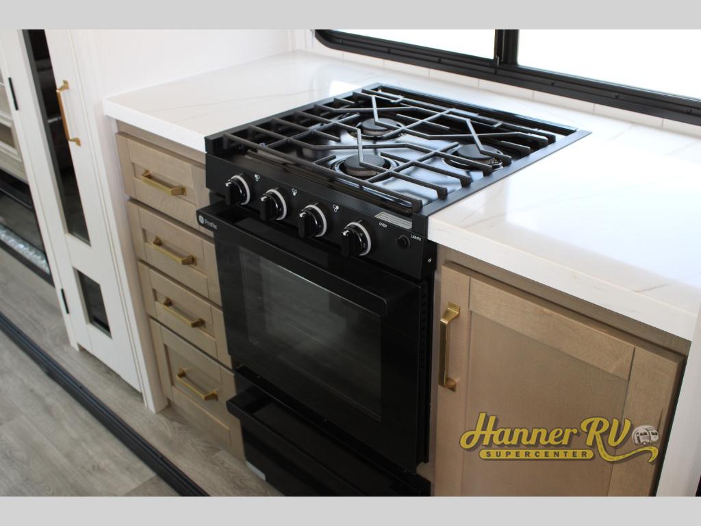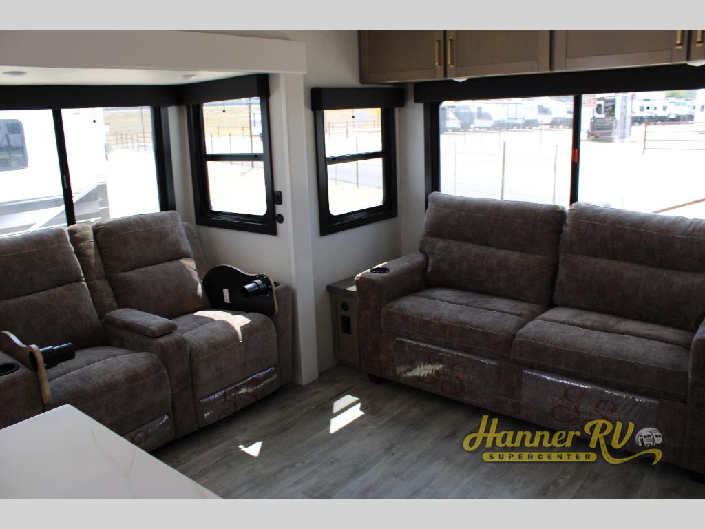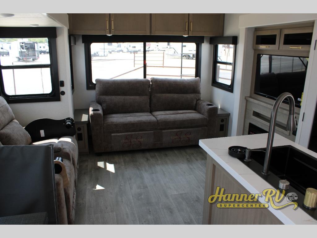 You will love how much interior space you have in this fifth wheel thanks to the dual opposing slides in the combined kitchen and living area! While your crew is relaxing on the theater seat or tri-fold sofa, you can prepare dinner on the GE black and stainless 21" range. There is also an entertainment center and fireplace across from the theater seat for easy viewing, and the table and chairs with a bench will be the perfect place to play a board game at. Head to the front to enjoy the private bedroom with an Olympic queen bed, and the full bath is close by for easy nighttime use!