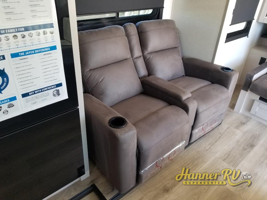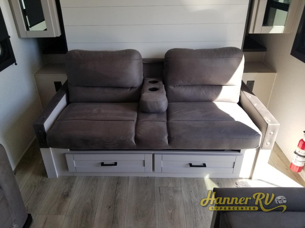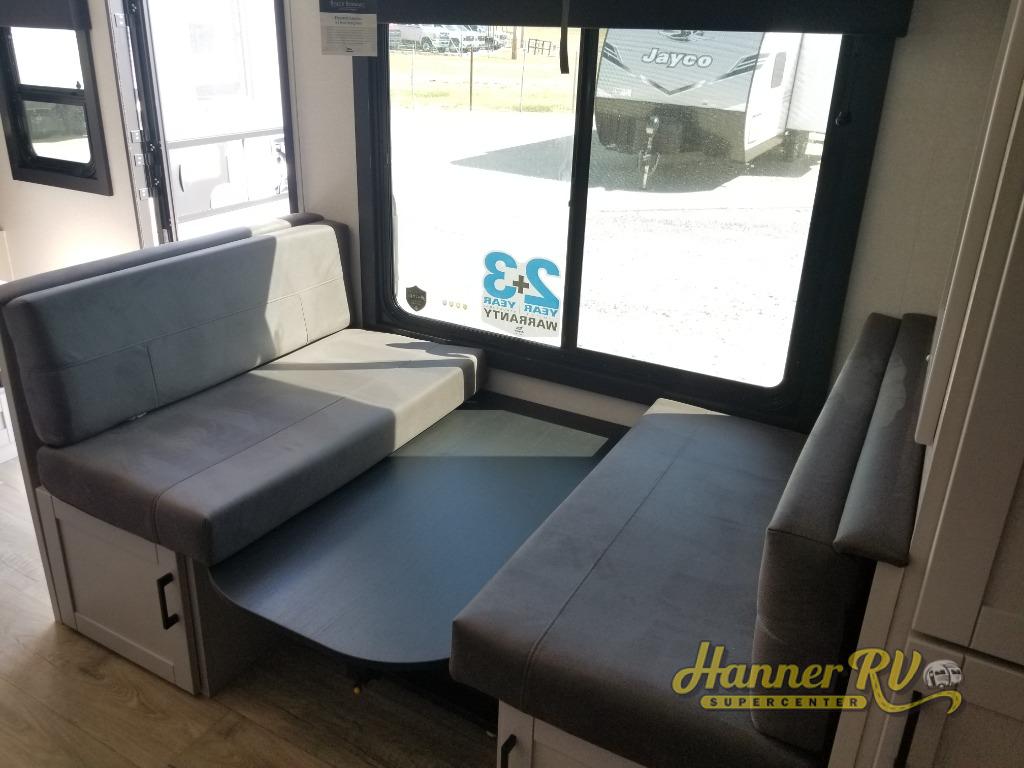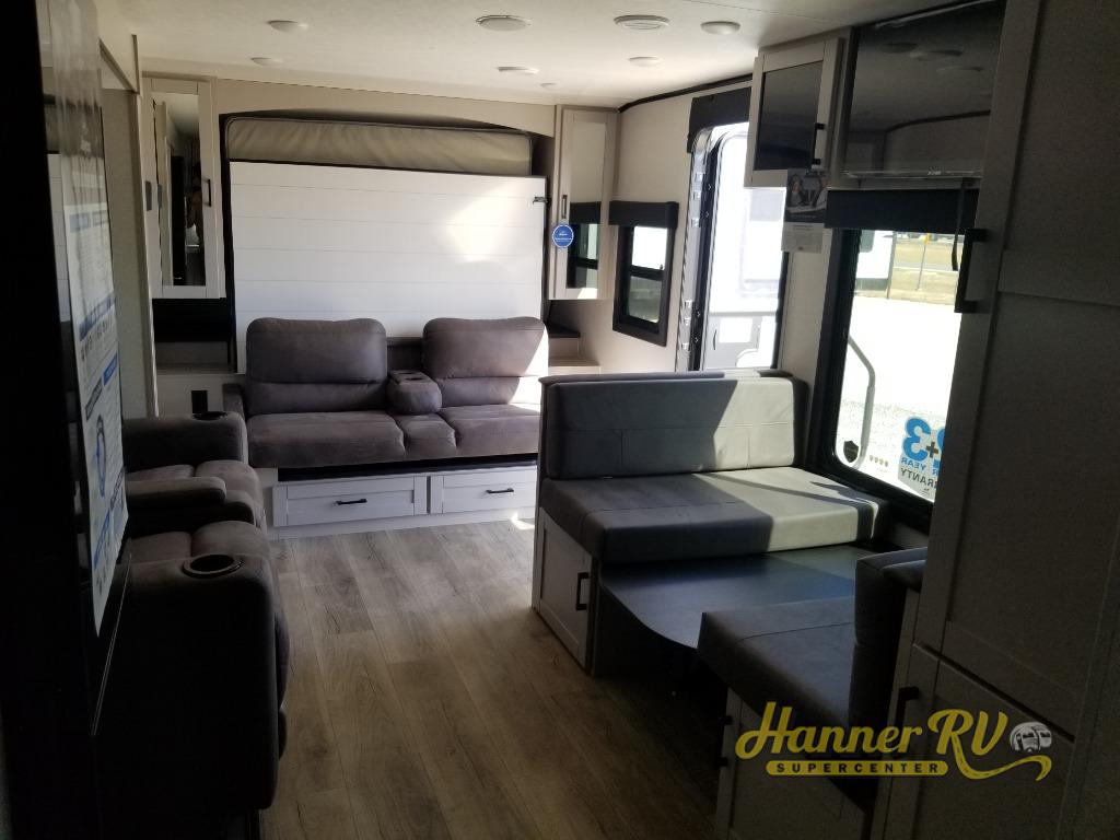 If you wish to escape the hustle and bustle of everyday life then you need this travel trailer! It features a front 60" x 75" Murphy bed with wardrobes on either side for bedtime and a jackknife sofa during the day. You can play games at the booth dinette after enjoying a delicious meal prepared with the three burner cooktop or relax at the theater seating with table trays and enjoy the LED TV. The rear corner bathroom has a shower with a skylight for you to get cleaned up in, as well as a linen closet to store your towels. There is exterior storage space to keep your outdoor gear, a 15' power awning to protect you from the elements.