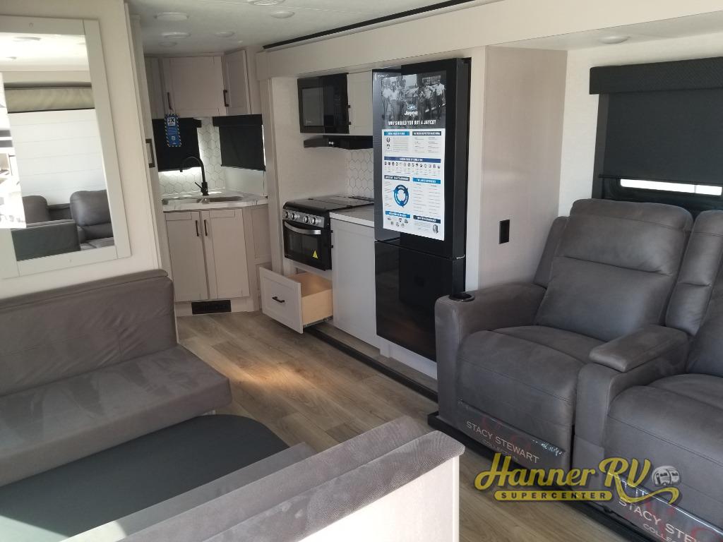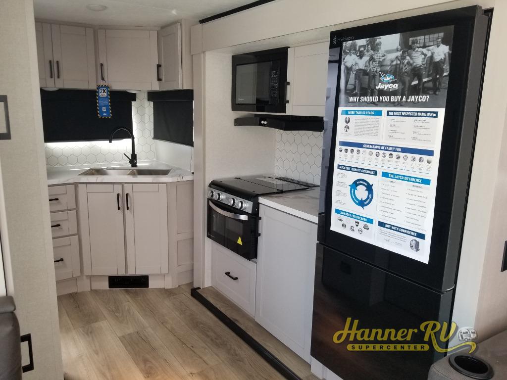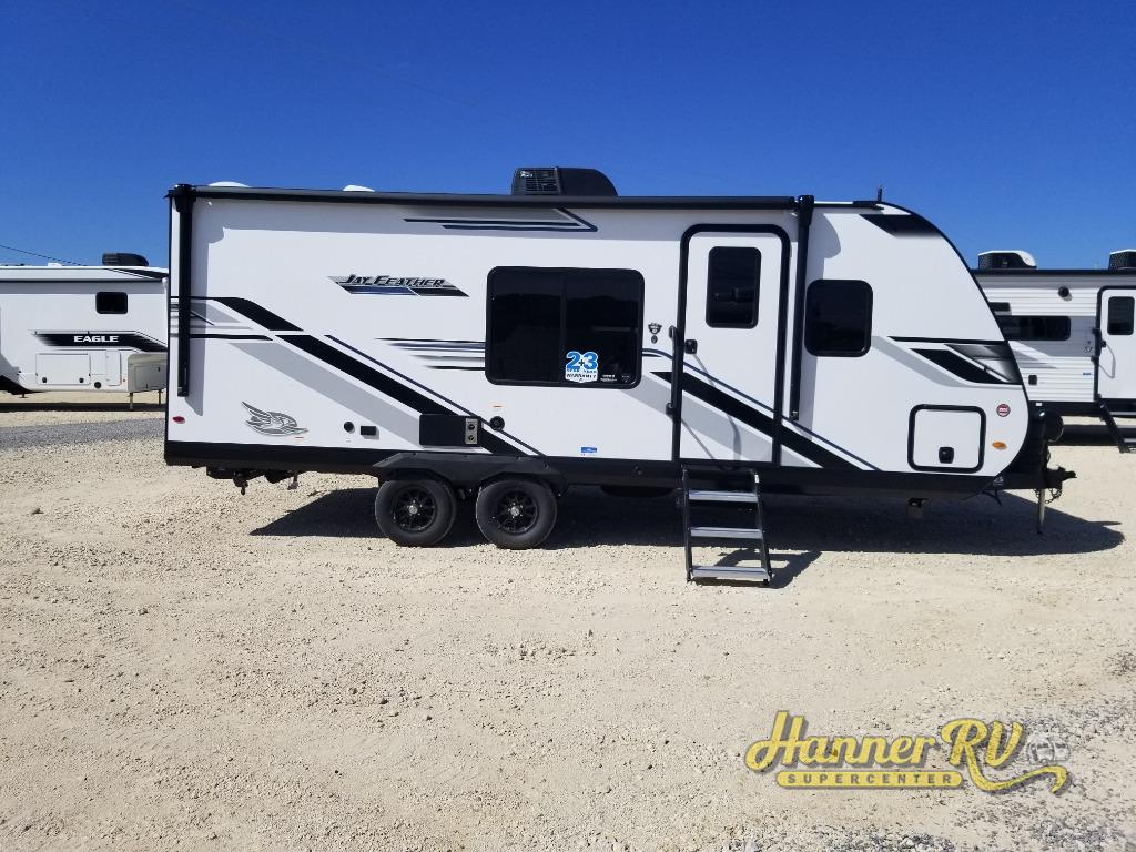 With any Jay Feather travel trailer by Jayco, you will enjoy lightweight towing, convenient exterior amenities, and at-home comforts inside! The Overlander 1 Solar Package included within the Jay Sport Package comes with a 200W solar panel and a 30-amp digital controller so you can enjoy some off-grid camping. There is also a modern graphics package with a dual-colored sidewall, LCI Solid Step fold-down aluminum tread steps on the main entry door, and Climate Shield 0 -100° F tested weather insulation package that will allow you to camp in all sorts of climates. The Customer Value Package will make time outdoors easier than ever with a power tongue jack and a Rock Solid stabilizer system, plus American-made nitro-filled Goodyear tires with self-adjusting electric brakes. More exterior features include a Keyed-Alike locking system, marine grade exterior speakers, a Magnum Truss roof system, and the list goes on! And we haven't even touched on the interior comforts, like the residential style seamless countertops and vinyl flooring throughout, decorative backsplash, handcrafted hardwood door/drawer fronts, and multiple USB charging ports to keep you going!