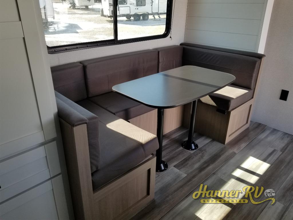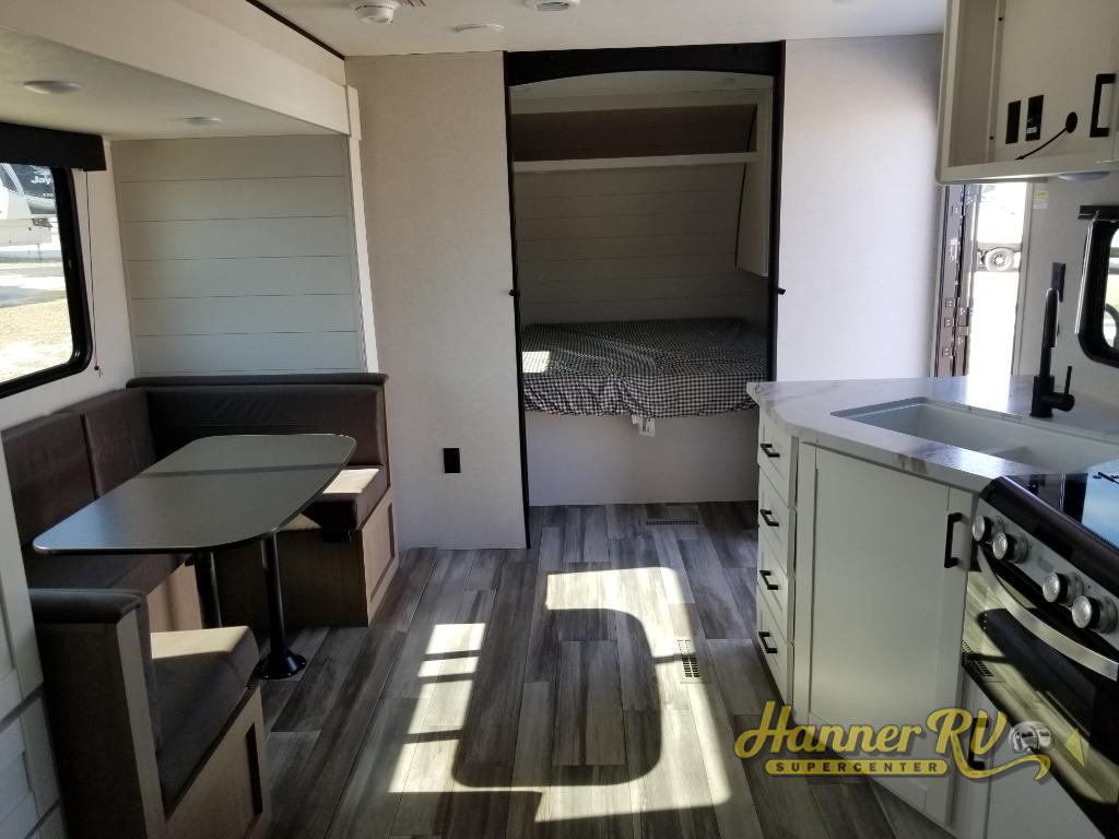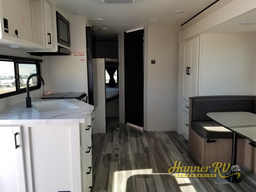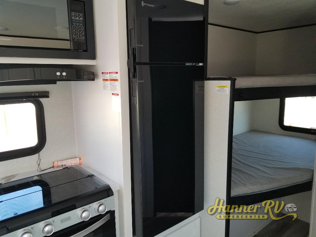 You can comfortably sleep eight people in this travel trailer thanks to the double-size bunks in back, the 60" x 80" queen bed in the front bedroom, plus the U-shaped dinette within the slide out! The chef of your crew will have a three burner cooktop and microwave oven to prepare meals, and everyone can store their favorite drinks in the 12V refrigerator inside or in the exterior refrigerator! This unit also includes ample storage space, including a large pantry and dual bedside wardrobes.