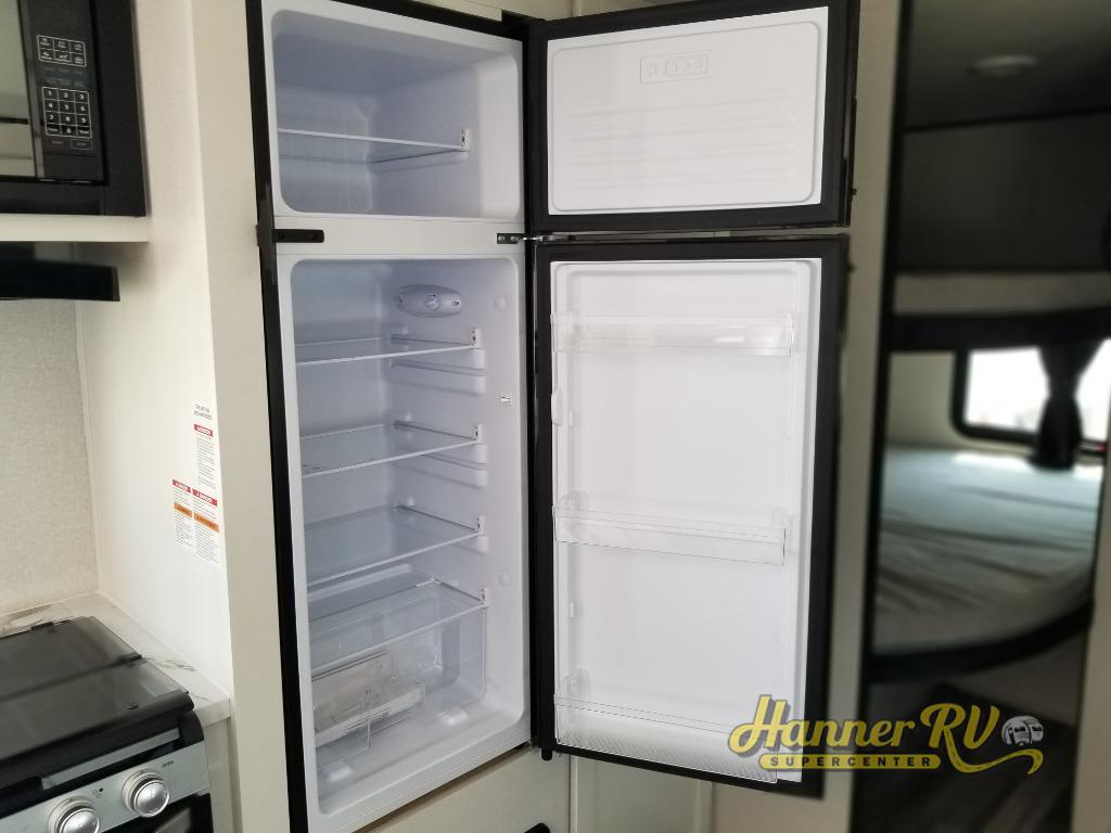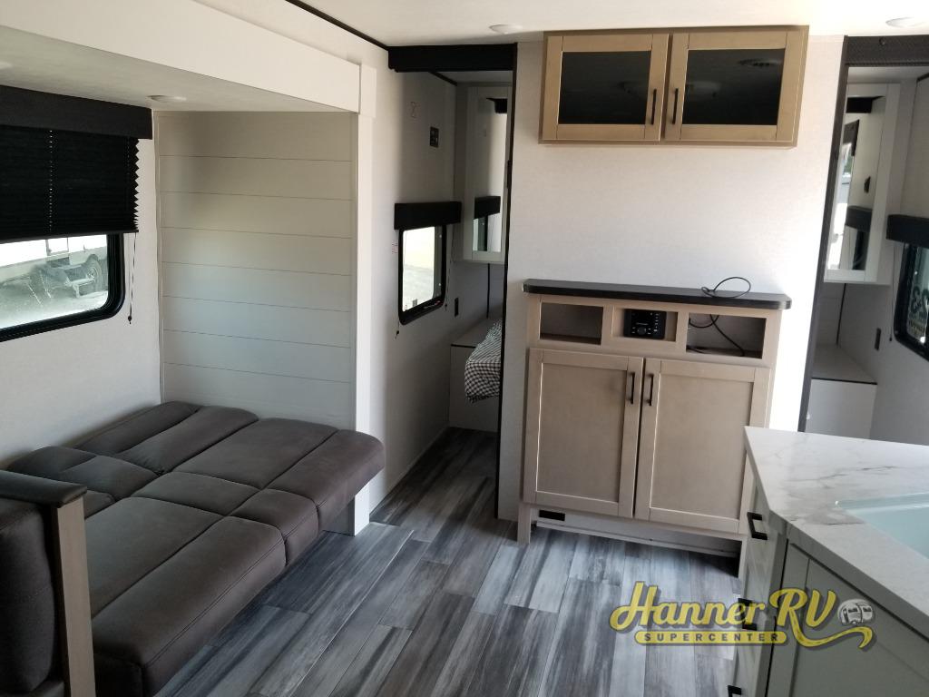 You can comfortably sleep up to ten people in this trailer thanks to the double-size bunks in back, the RV queen bed in the front bedroom, plus the booth dinette and jack-knife sofa in the main living area! The chef of your crew will have a three burner cooktop and microwave oven to prepare meals, and everyone can store their favorite drinks in the 8 cu. ft. 12V refrigerator inside, or in the outdoor refrigerator for convenience. The rear corner bathroom includes a shower and a toilet, with the sink just outside of this room so others can brush their teeth if one is taking a shower before bed. The outside storage is accessible on both sides of the unit and will easily allow you bring along camp chairs, yard games and more. A 16' powered awning with LED lights will create a nice place to gather in the evenings with family and friends!