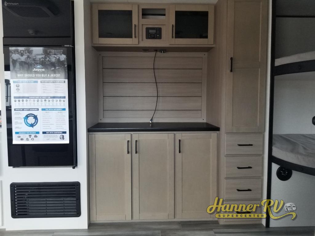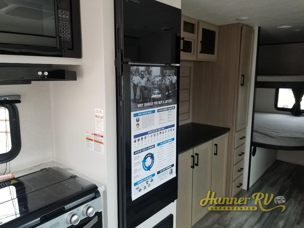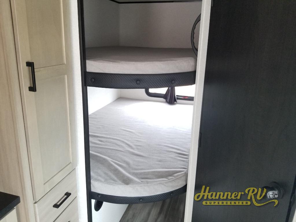 Comfort and fun is waiting for you! This trailer allows the owners to sleep in privacy behind the space saving sliding door on a 60" x 75" queen bed. And the kids or grandkids can sleep on the double-size bunks in the rear next to the full bathroom including a shower. They even have a wardrobe nearby for their things. The slide out jackknife sofa and U-shaped dinette offers more floor space, a place to relax and dine, plus you can play games at the dinette. This model also includes an exterior refrigerator so you can grab a cold drink while under the 16' power awning!