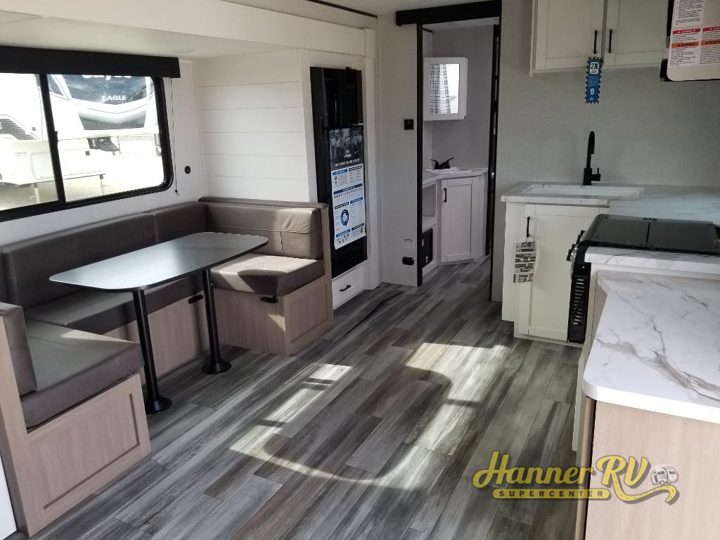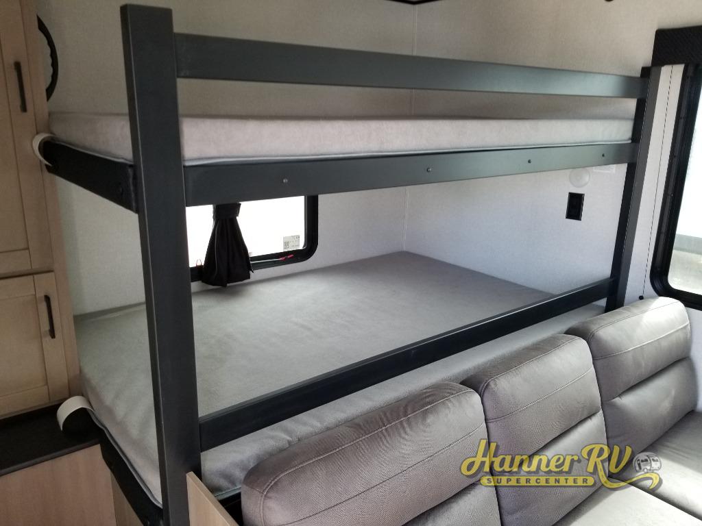 It's time to ditch that old tent and upgrade to this spacious travel trailer! The littles ones or your guests will love the double-size bunks with steps in the back, while you take the front master bedroom. One of the dual entry doors is also found here for convenience, and the walk-through bath is easily accessible for everyone. A U-shaped dinette slide and jack-knife sofa in the main living area provide your crew with space to relax and dine together, and the fully equipped kitchen lets you cook up your best meals. This unit includes ample storage space, including additional kitchen storage, wardrobes, overhead cabinets, and exterior storage!