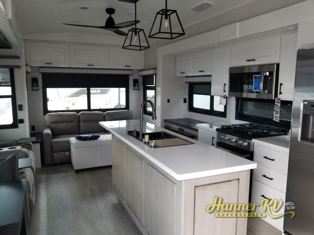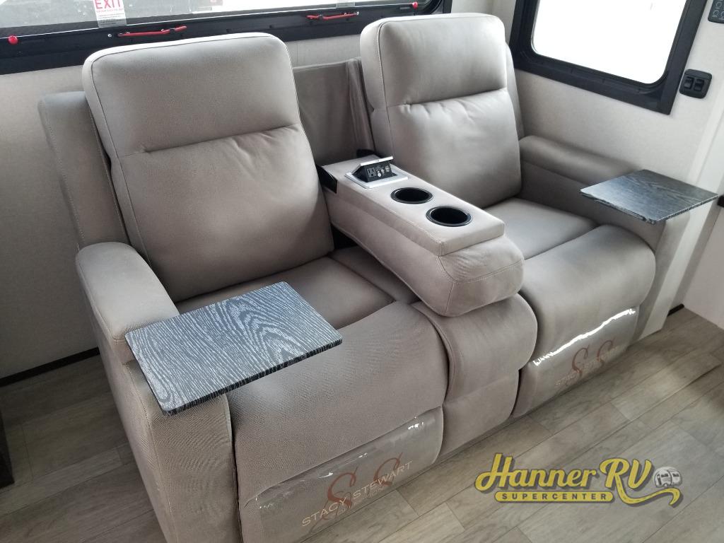 Each Pinnacle fifth wheel features Stronghold VBL lamination for the lightest, yet strongest construction in the RV industry. Add that to the Magnum Truss XL6 roof system and Climate Shield zero-degree tested weather protection and you'll be enjoying your fifth wheel for years to come. Some of the exterior conveniences you will appreciate are the Keyed-Alike lock system, the fully enclosed, universal docking center, and the 6-point hydraulic auto-leveling system for quick and easy set up. The 5 Star Handling Package will make towing a fifth wheel a walk in the park, and the two Whisper Quiet A/C units will keep you comfortable during the hot summer months. Inside, you'll enjoy the residential "Do it all" sink with pull-out kitchen faucet, glass rinse, and vegetable rinse, the handcrafted hardwood glazed cabinetry, the vinyl flooring throughout, plus many more comforts. There is even a central vacuum system, a wireless remote control system, USB ports throughout, plus many more conveniences to make each trip enjoyable.