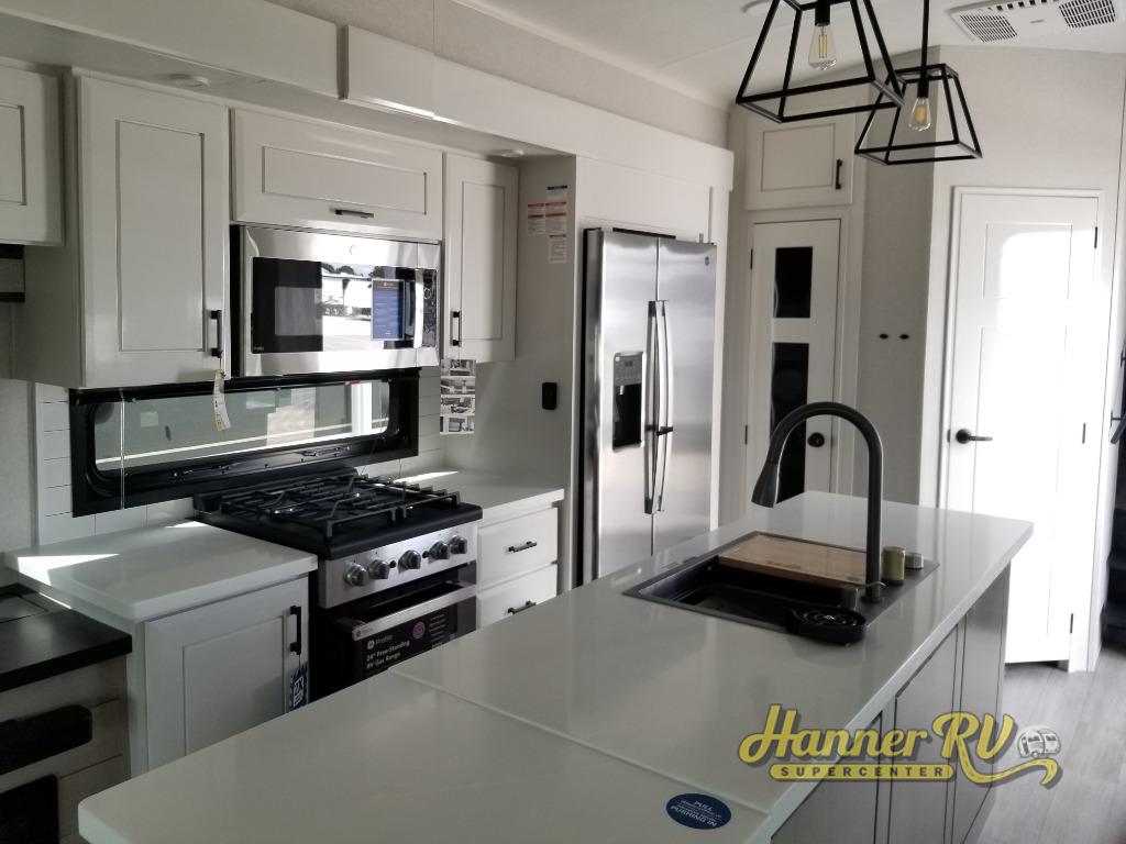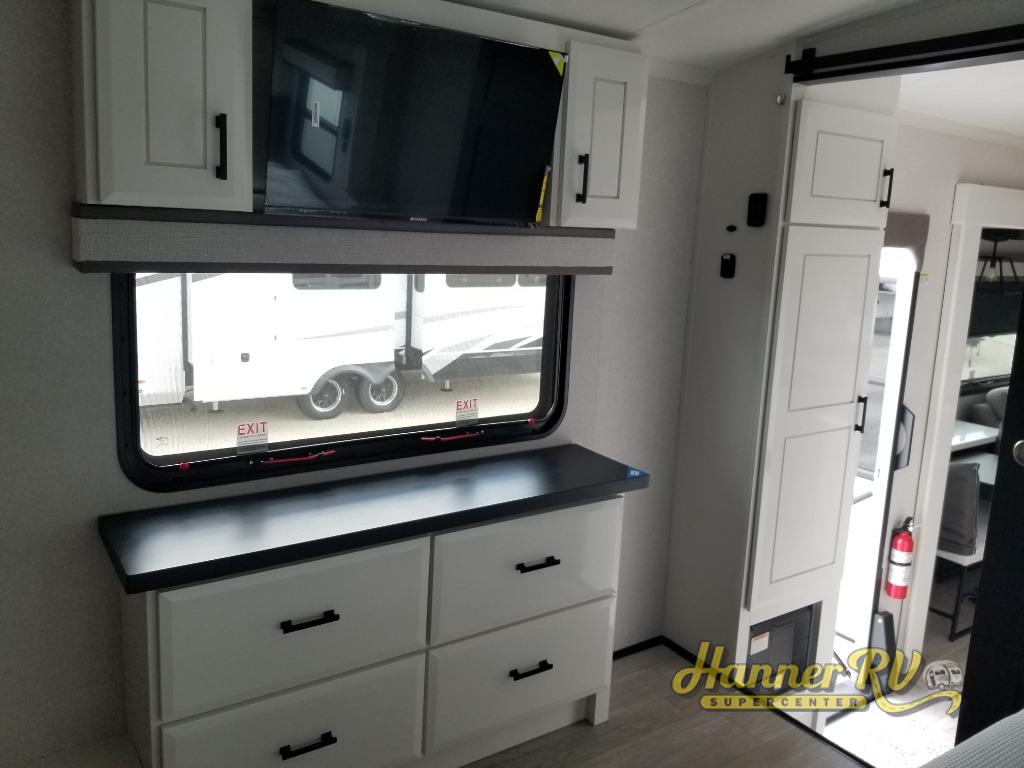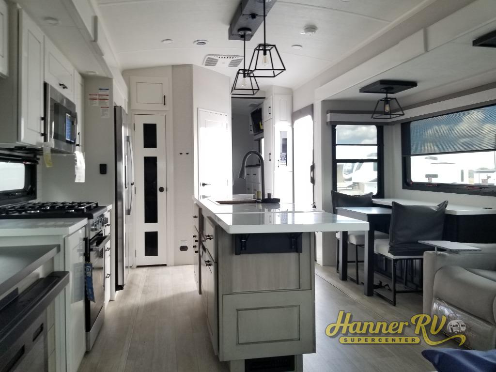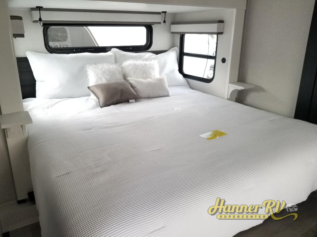 You can't go wrong with this fifth wheel that can sleep four! You will love how much space you have in the main living area thanks to the dual opposing slides, and there is a kitchen island here with a pull-out extension for added prep space. The convenient half bath is right off of the kitchen for quick restroom breaks, and you'll find a shoe garage and a wardrobe just as you enter the unit to keep the RV tidy. Head to the master bedroom for a rest on the king bed slide out, or you may want to watch a show on the 32" bedroom TV. The front master bath may be your favorite feature of this unit. Here, you'll find dual bath sinks, a walk-in shower with a seat, plus a spacious walk-in closet for your clothes. And don't overlook the exterior with its two power awnings, 32" exterior TV, and a Jayport with LP quick connect for your outdoor grill.