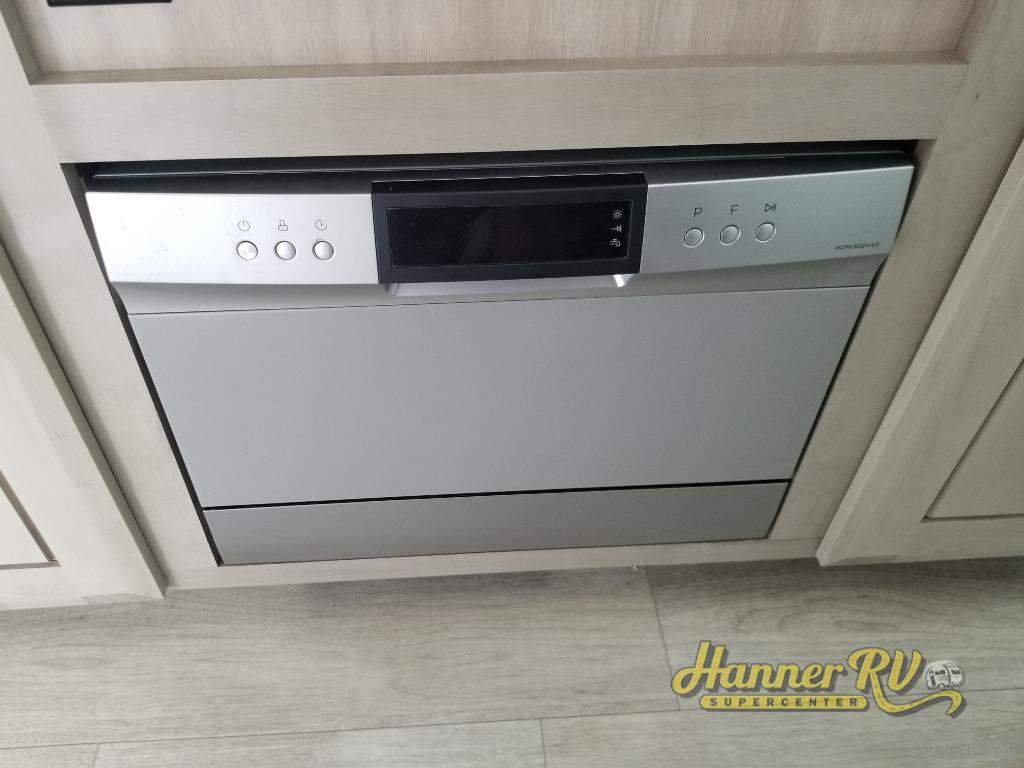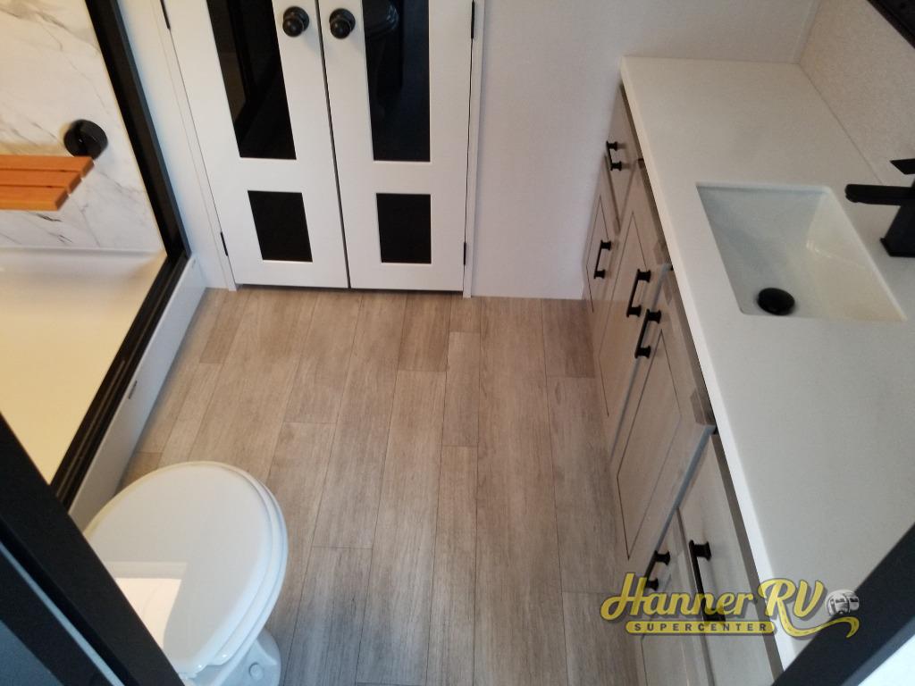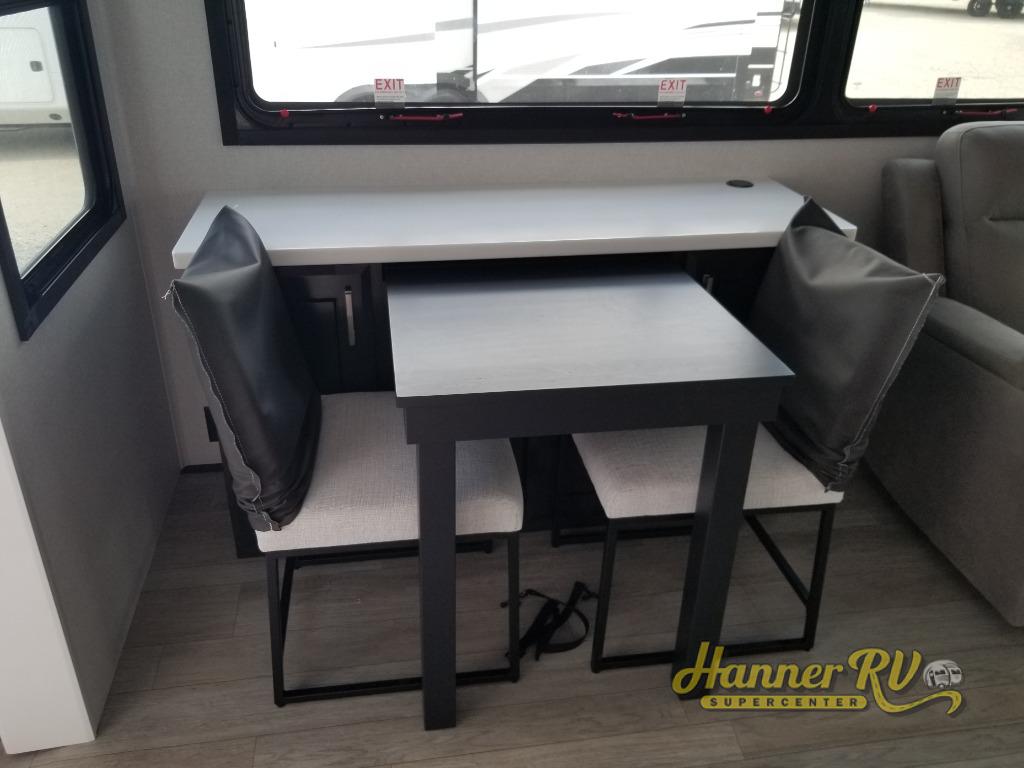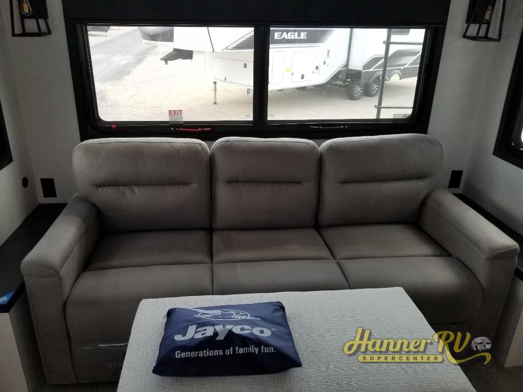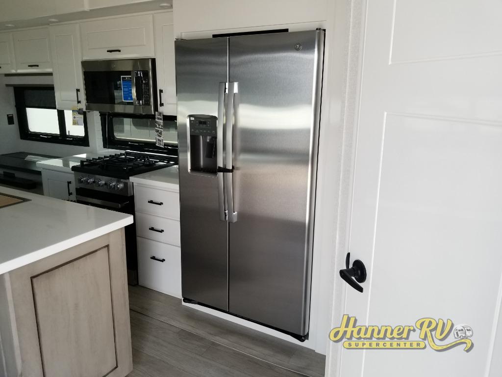 You can't go wrong with this fifth wheel that can sleep four! You will love how much space you have in the main living area thanks to the dual opposing slides, and there is a kitchen island here with a pull-out extension for added prep space. The convenient half bath is right off of the kitchen for quick restroom breaks, and you'll find a shoe garage and a wardrobe just as you enter the unit to keep the RV tidy. Head to the master bedroom for a rest on the king bed slide out, or you may want to watch a show on the 32" bedroom TV. The front master bath may be your favorite feature of this unit. Here, you'll find dual bath sinks, a walk-in shower with a seat, plus a spacious walk-in closet for your clothes. And don't overlook the exterior with its two power awnings, 32" exterior TV, and a Jayport with LP quick connect for your outdoor grill.