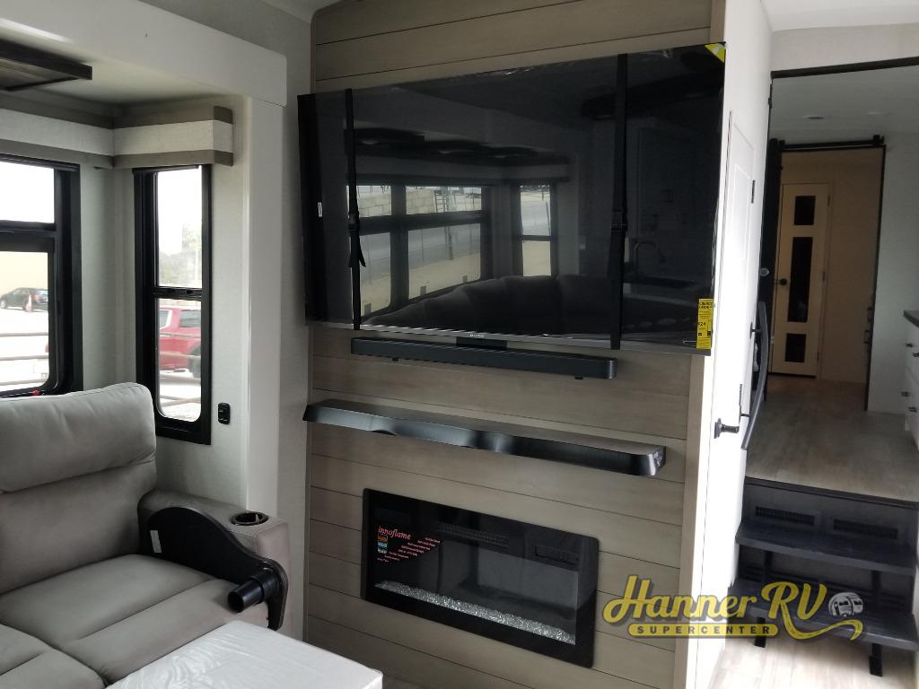 Triples slides, a desk/coffee bar, fireplace, and a huge master bath in front all indicate the kind of vacation you will experience in this Pinnacle Fifth Wheel! As you enter, a convenient half bath is located straight ahead. Slightly to your left, a nice seating area for gathering with family or friends to relax and watch TV, enjoy the fireplace while reading a book or watching a movie, and the dining table with chairs. The dinette slide also houses a 21 cu. ft. residential refrigerator and pantry. The rear kitchen features a u-shaped counter, all the appliances you need to cook like at home, even a pull-out butcher block space for chopping up your veggies. Back through and up the steps to your right in front, the master bedroom will make you feel like royalty with its king bed, plus luxurious full rear bath. A huge vanity with dual bath sinks will allow you both to get ready at the same time, plus there is a walk-in shower with a seat for added convenience. Speaking of walk-in, you will also love the spacious walk-in closet that includes washer/dryer prep.